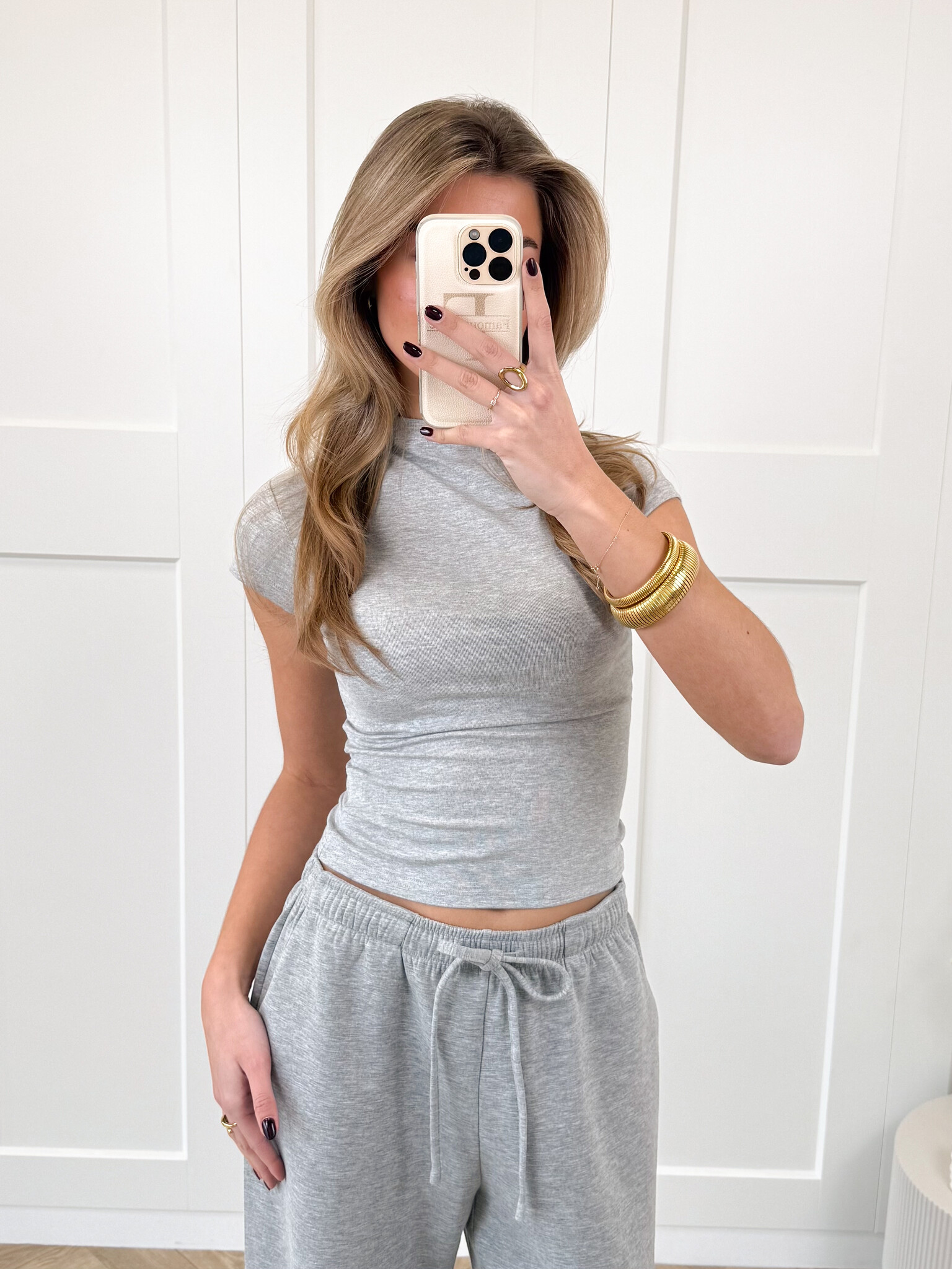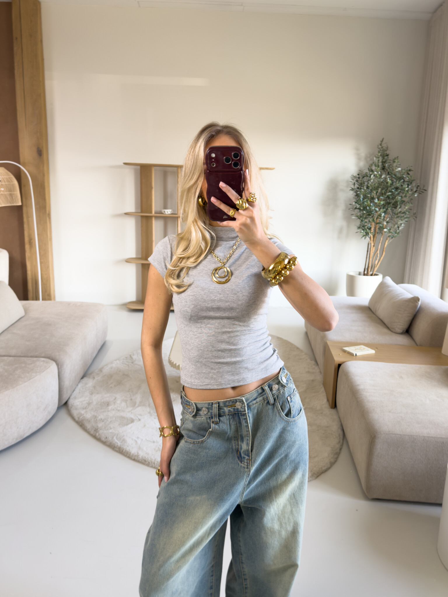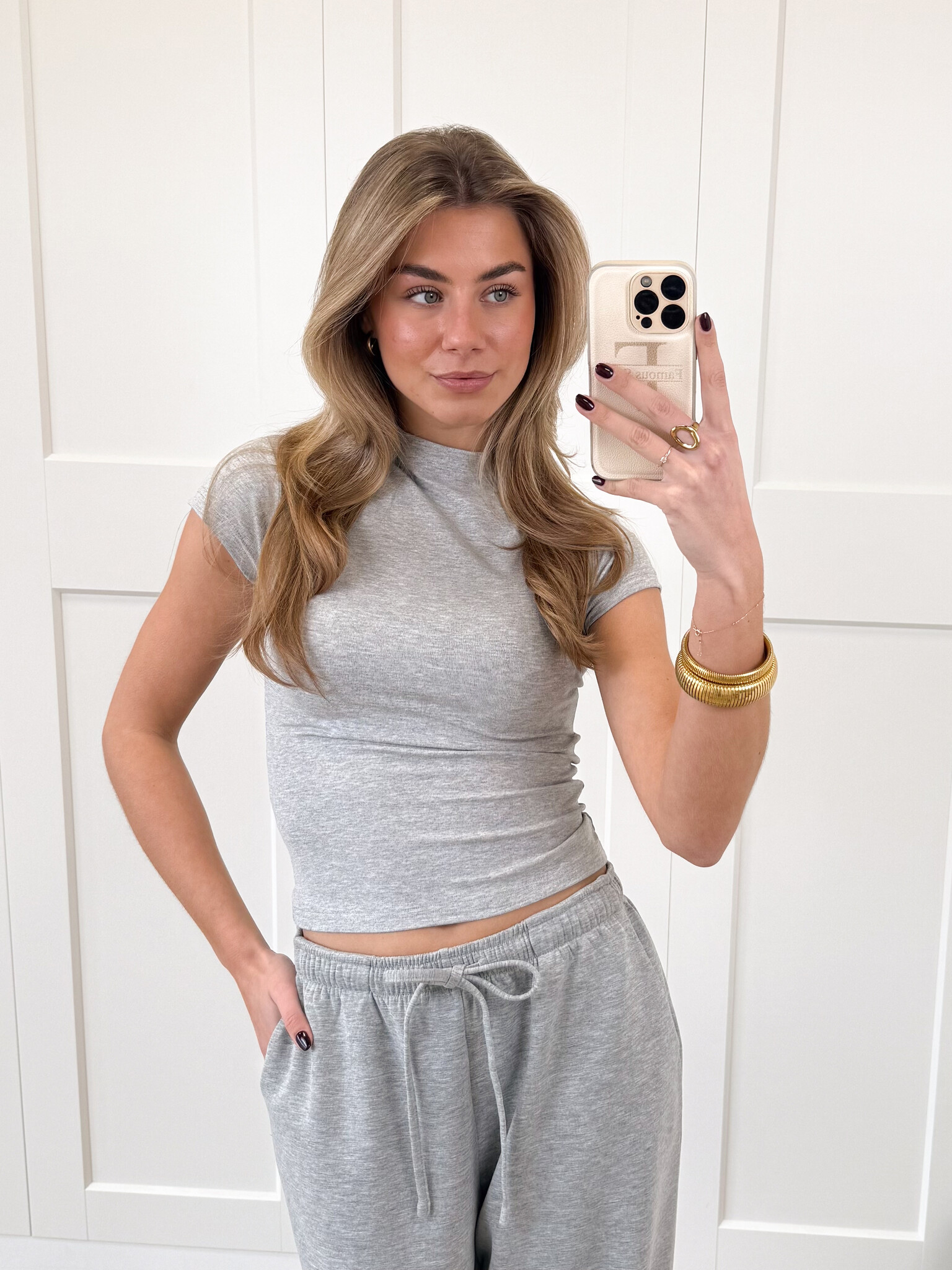Dit grijze basic topje combineert comfort en stijl op een girly manier. Met korte mouwen en een hoge hals straalt het een moderne en minimalistische look uit, terwijl de dubbele voering zorgt voor extra zachtheid en draagcomfort. Het topje is perfect te combineren met je favoriete jeans, pantalons of zelfs onder een blazer voor een iets gekleder effect. Licht van gewicht, ademend en makkelijk te stylen, waardoor het ideaal is voor school, werk, koffiedates of casual dagjes uit. Een veelzijdig en tijdloos basic item dat een elegante, girly touch toevoegt aan elke outfit.
