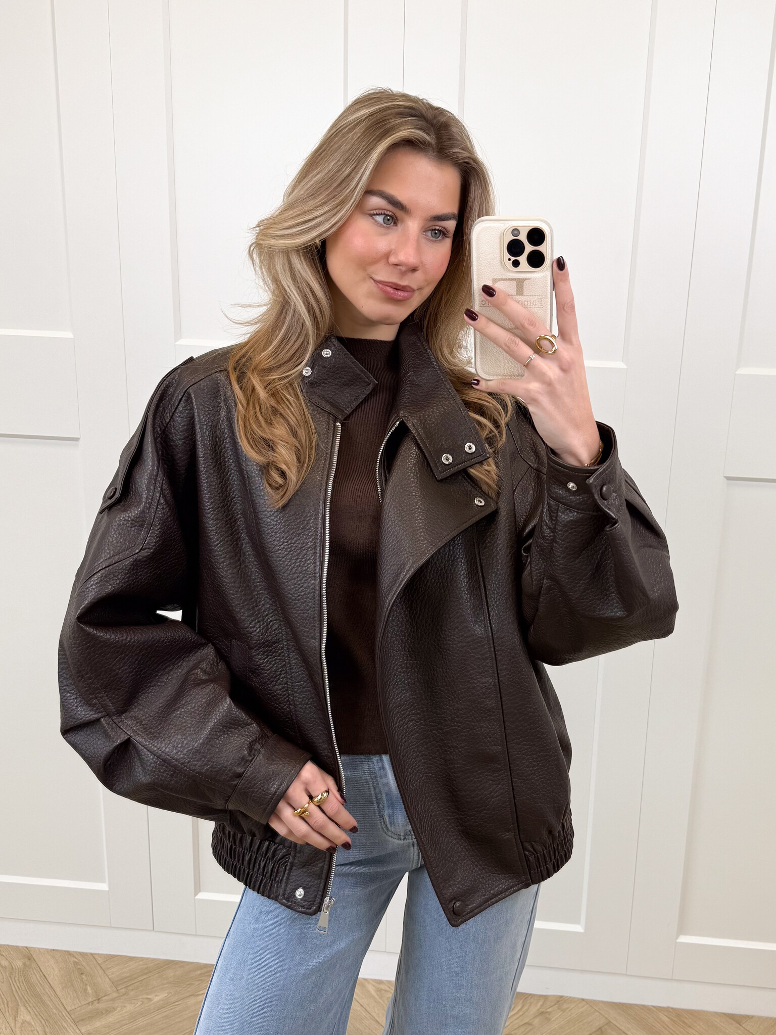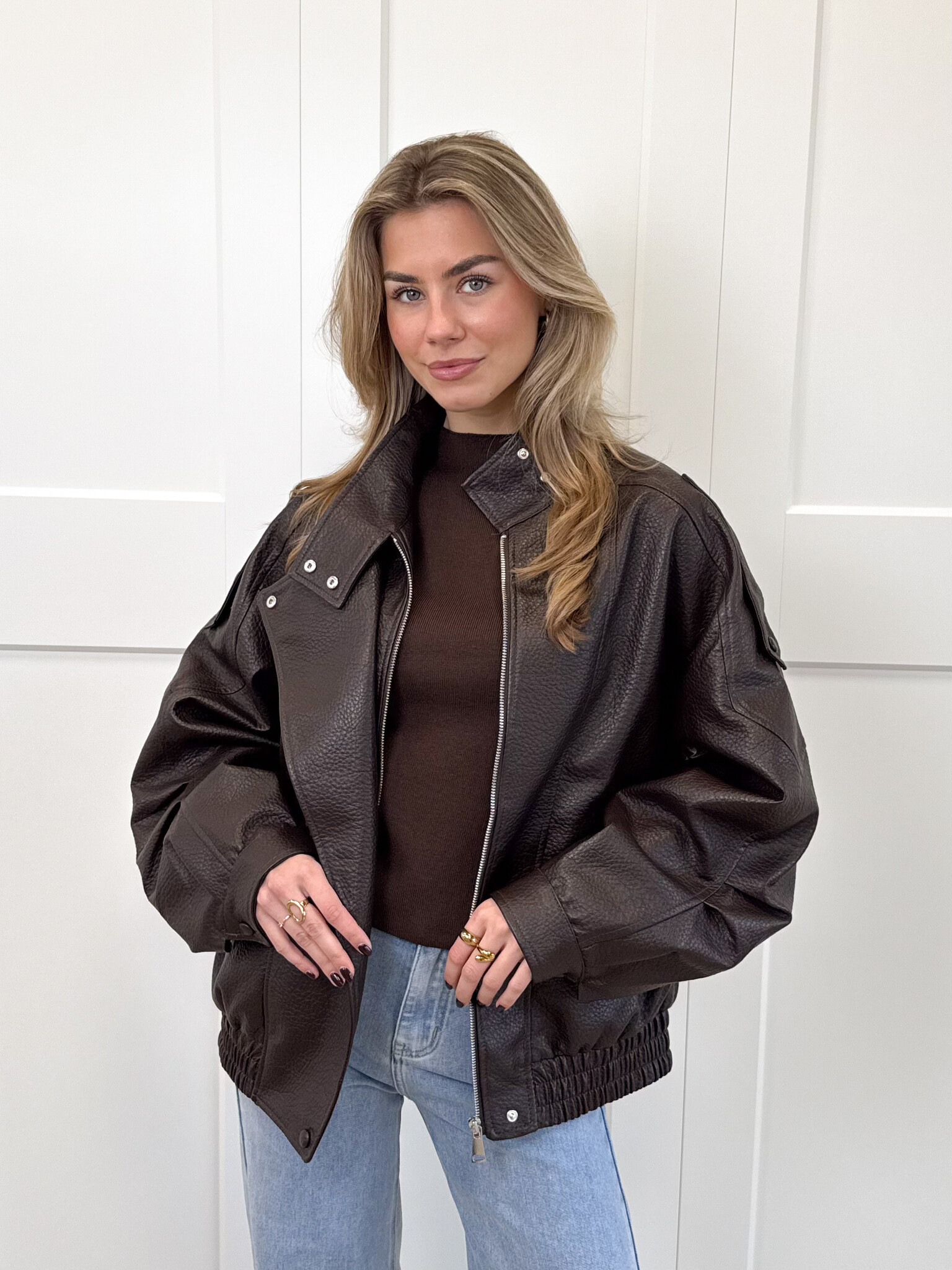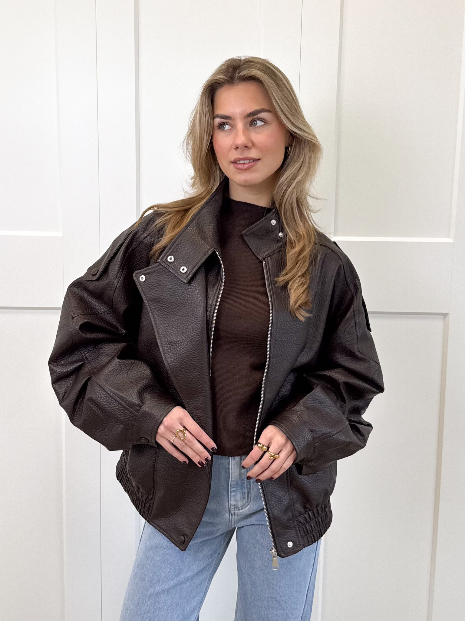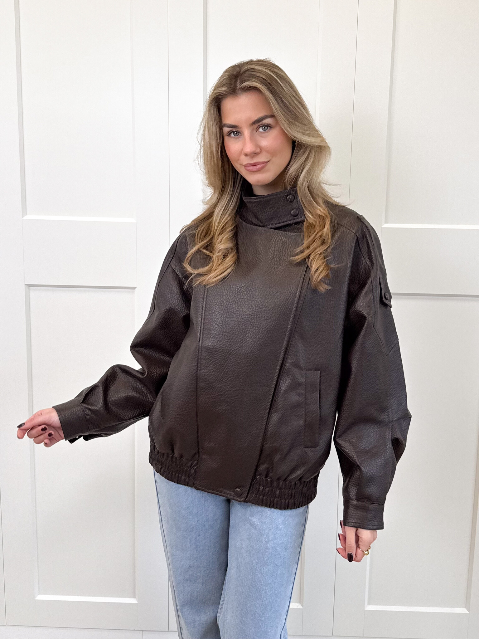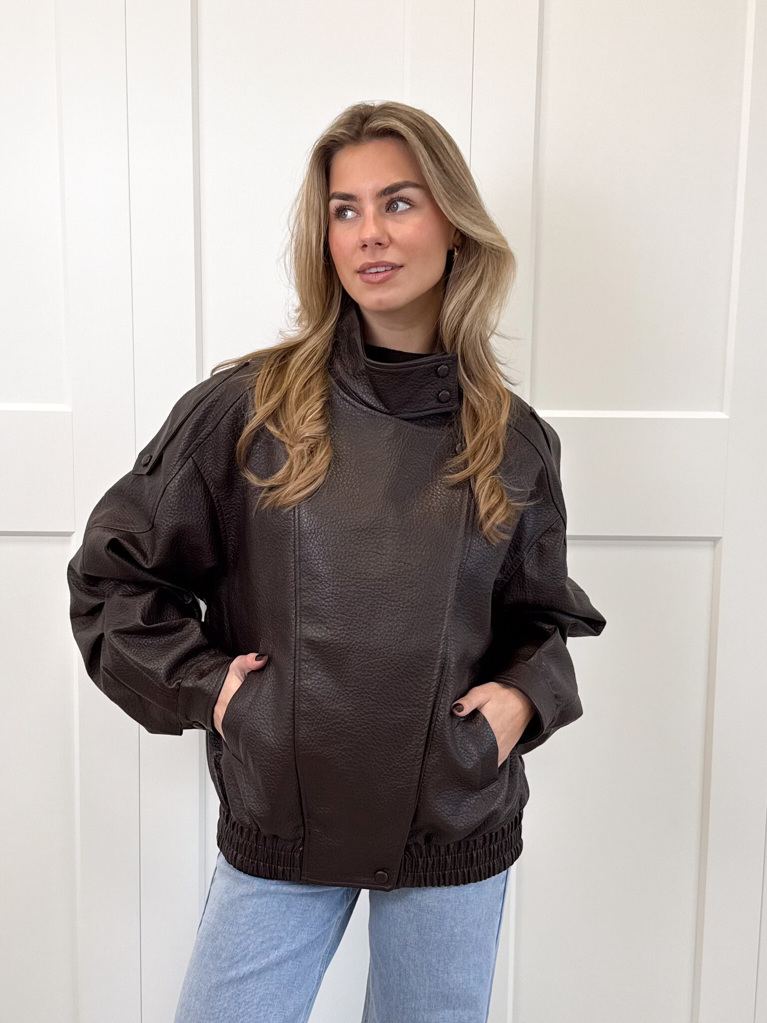 Deze oversized bruine leren jas met een hoge kraag is jouw nieuwe go-to voor een trendy, effortlessly cool look. De jas heeft een subtiel getailleerde onderkant. De rits aan de voorkant maakt het super praktisch, terwijl de extra knoopsluiting bovenaan zorgt voor een stijlvolle, gesloten pasvorm op koudere dagen. De zakken zijn perfect voor je essentials (of gewoon om comfy je handen in te steken). De knopen op de mouwen en schouders geven de jas die extra edgy touch die het echt uniek maakt. Deze jas is ideaal voor everyday outfits, van jeans tot jurkjes, hij maakt alles stijlvoller.