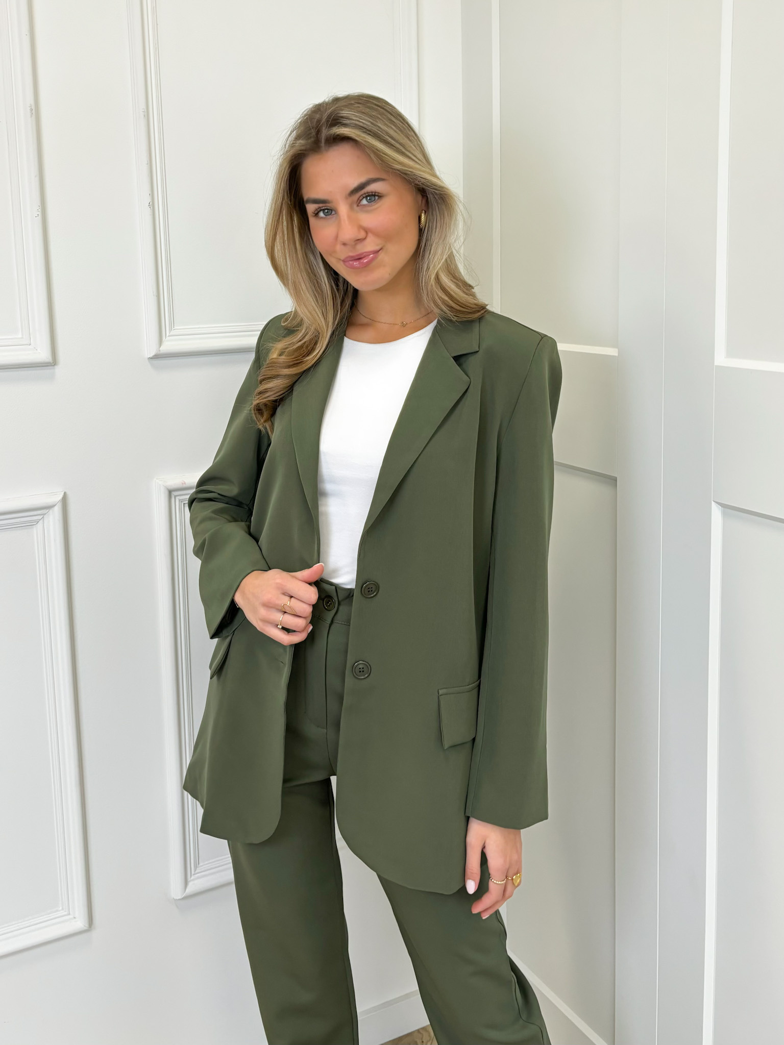 Een elegante blazer met nepzakjes aan de voorkant. Dit jasje heeft knoopjes aan de voorkant. Wil je de perfecte casual classy outfit? Aan de voorkant heeft ook een sier borstzakje Combineer dan deze prachtige blazer met de bijpassende Esther pantalon. Deze blazer shop je in meerdere kleuren!