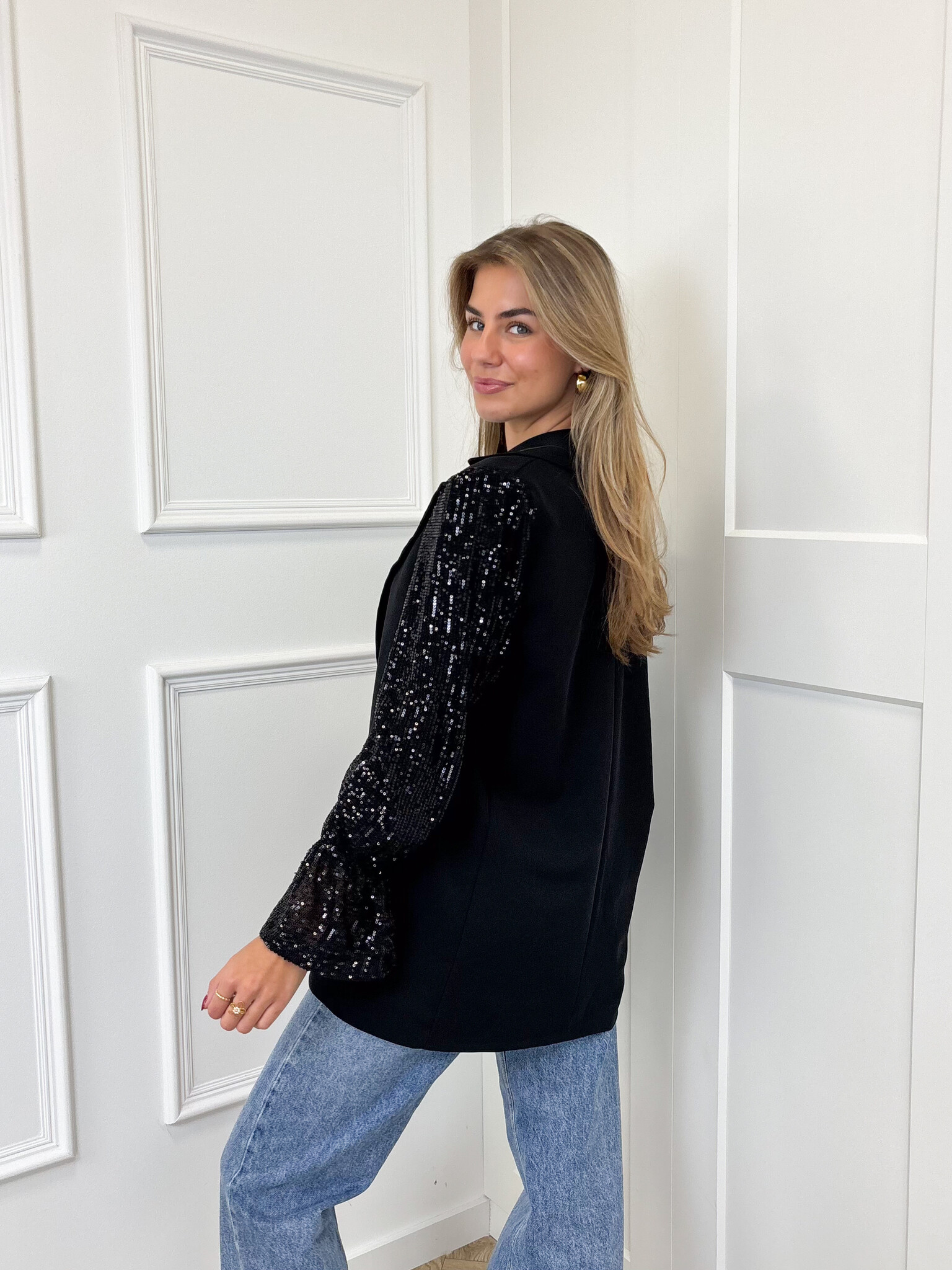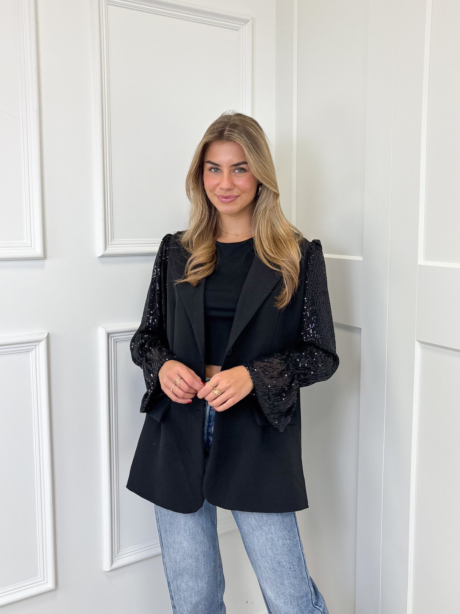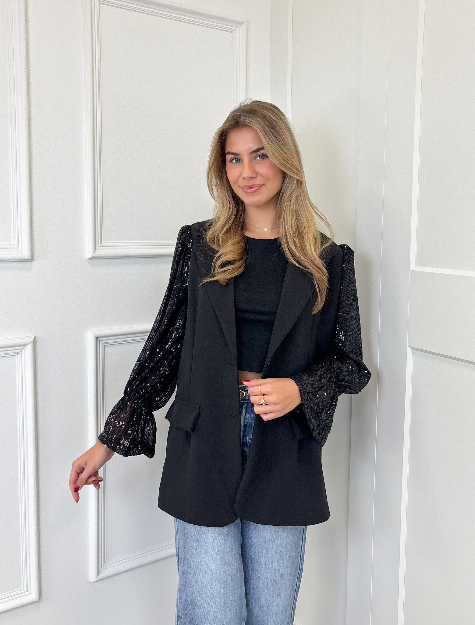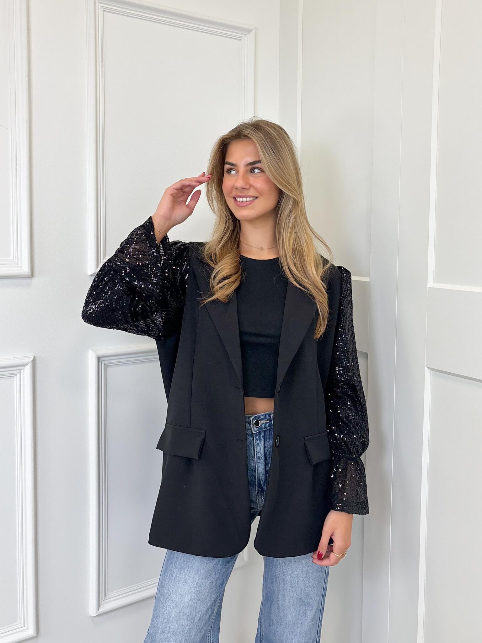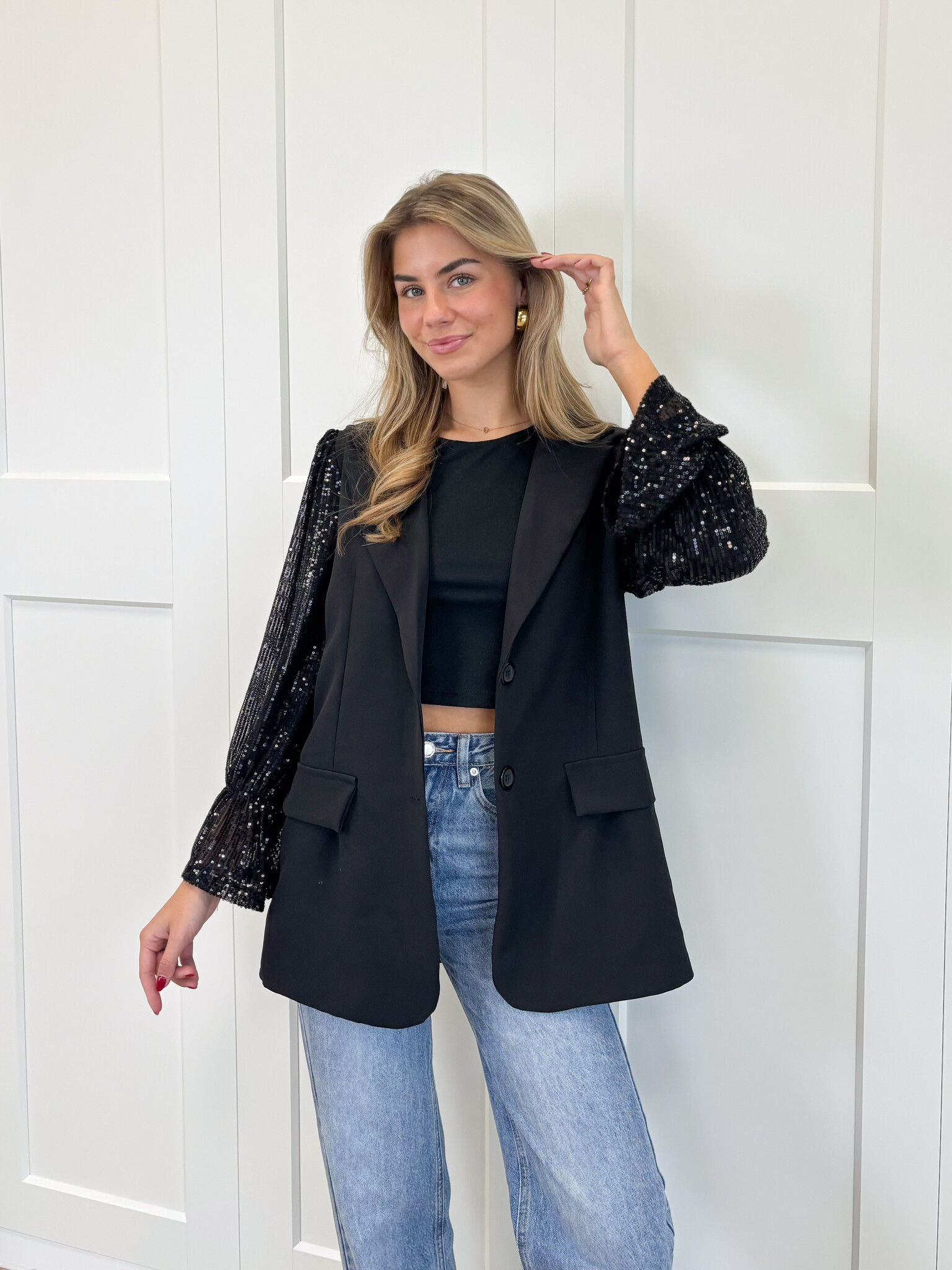 Een blazer is niet meer te missen in je kledingkast! Deze blazer met glitter mouwen maakt je party outfit helemaal af! Dit geeft je party outfit een echte boost! Het heeft sierzakken aan de voorkant en twee knopen. Je shopt deze eye catcher in twéé verschillende kleuren! De perfecte party item voor je party collectie!