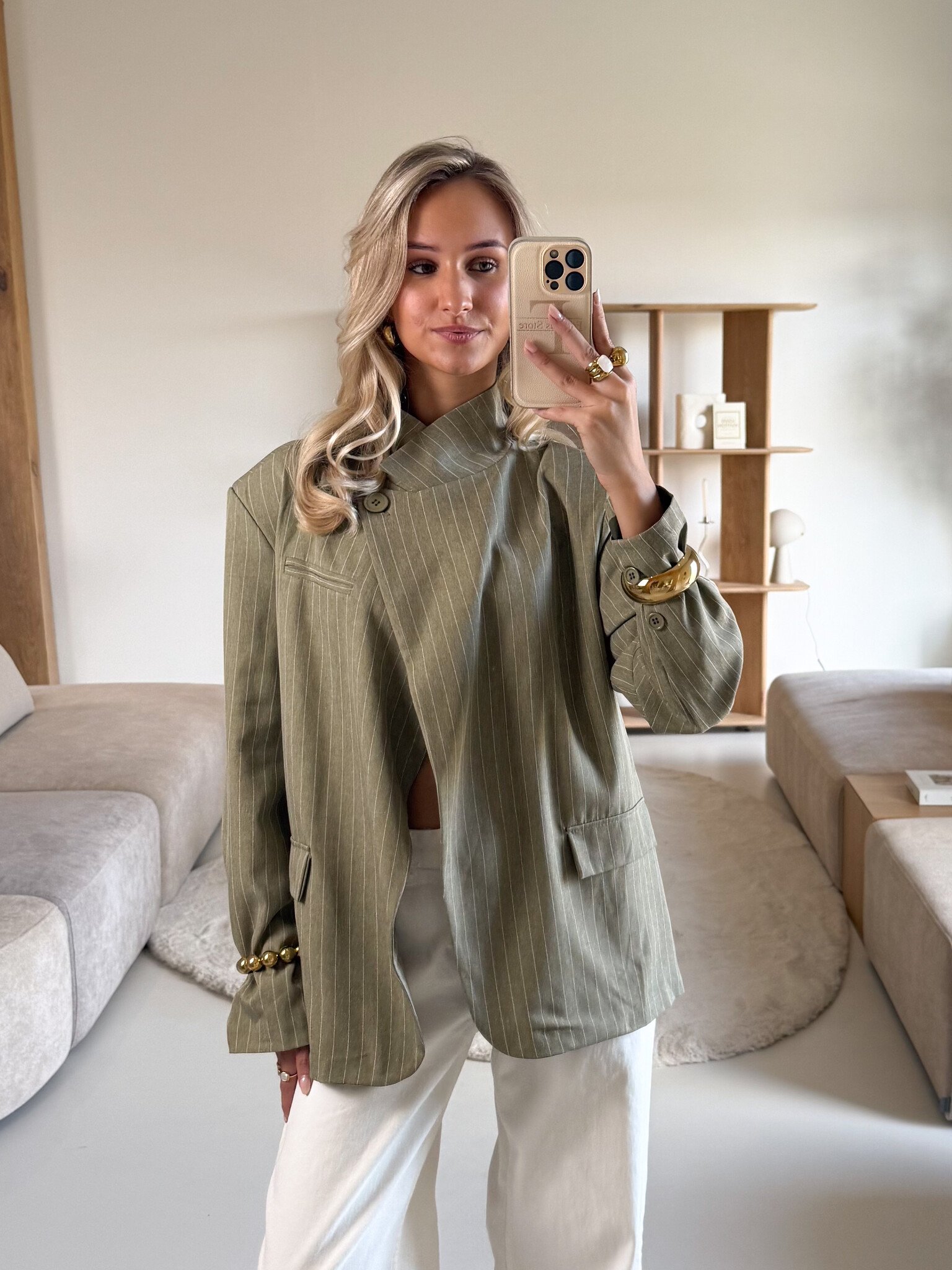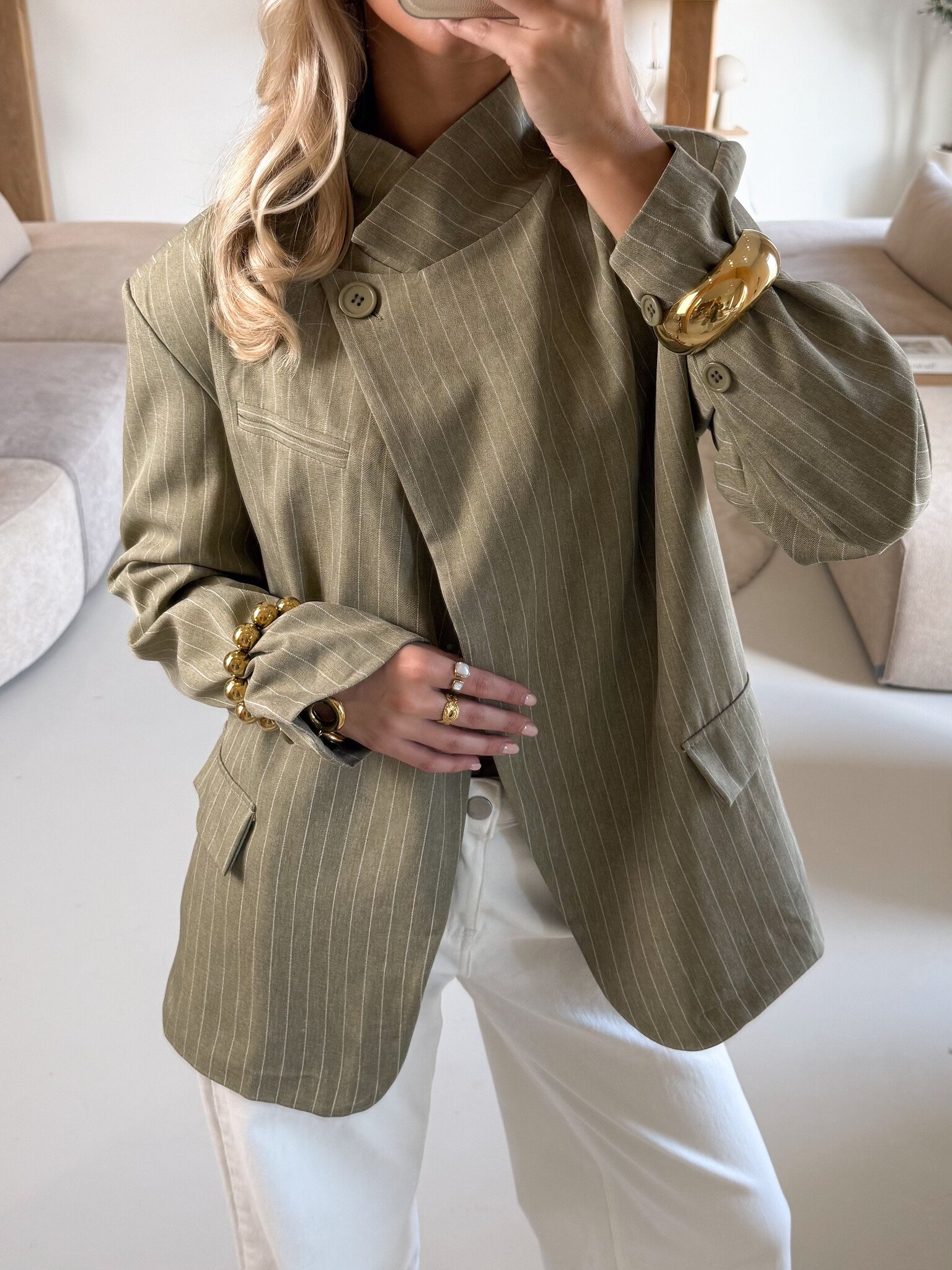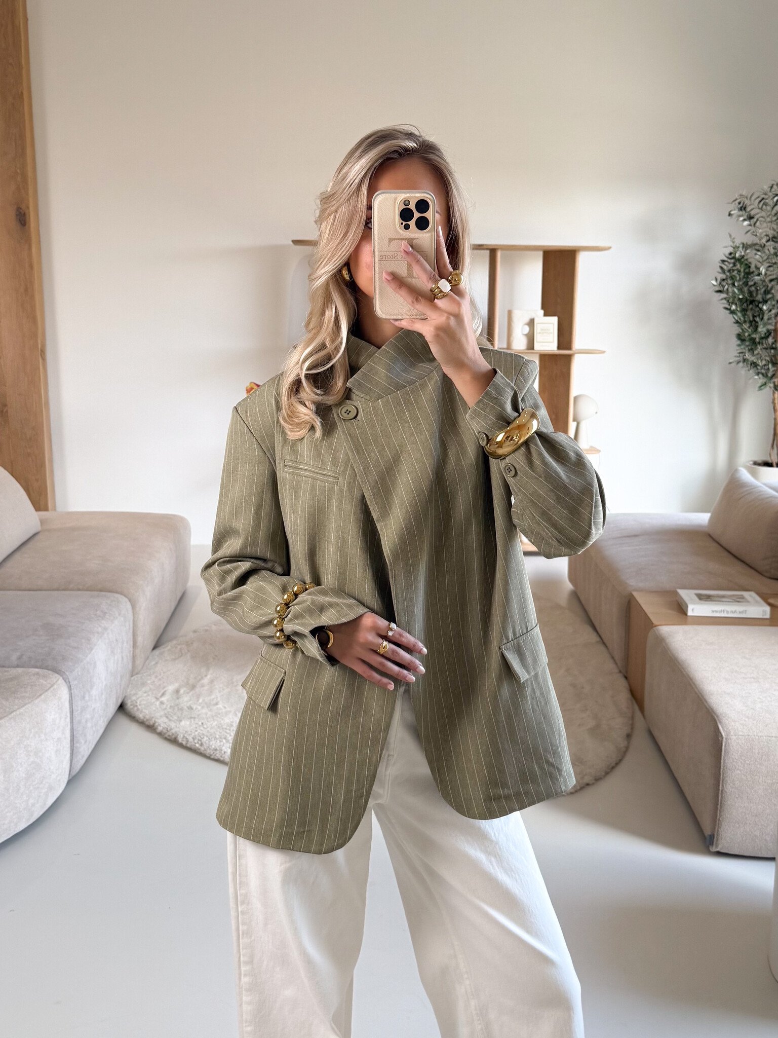Deze groene gestreepte blazer is de perfecte mix tussen classy en modern. Het model heeft één knoop aan de bovenkant waardoor je ‘m subtiel kunt sluiten, maar ook supermooi open kunt dragen voor een effortless vibe. De sierzakken aan de voorkant geven een stijlvolle touch en maken het geheel net wat speelser. De fijne pasvorm zorgt ervoor dat hij mooi valt zonder te strak te zitten. Combineer met een pantalon voor een power look of draag ‘m casual op een jeans met sneakers. Ideaal voor werk, een meeting, diner of een stijlvolle dag in de stad. Een echte wardrobe essential.