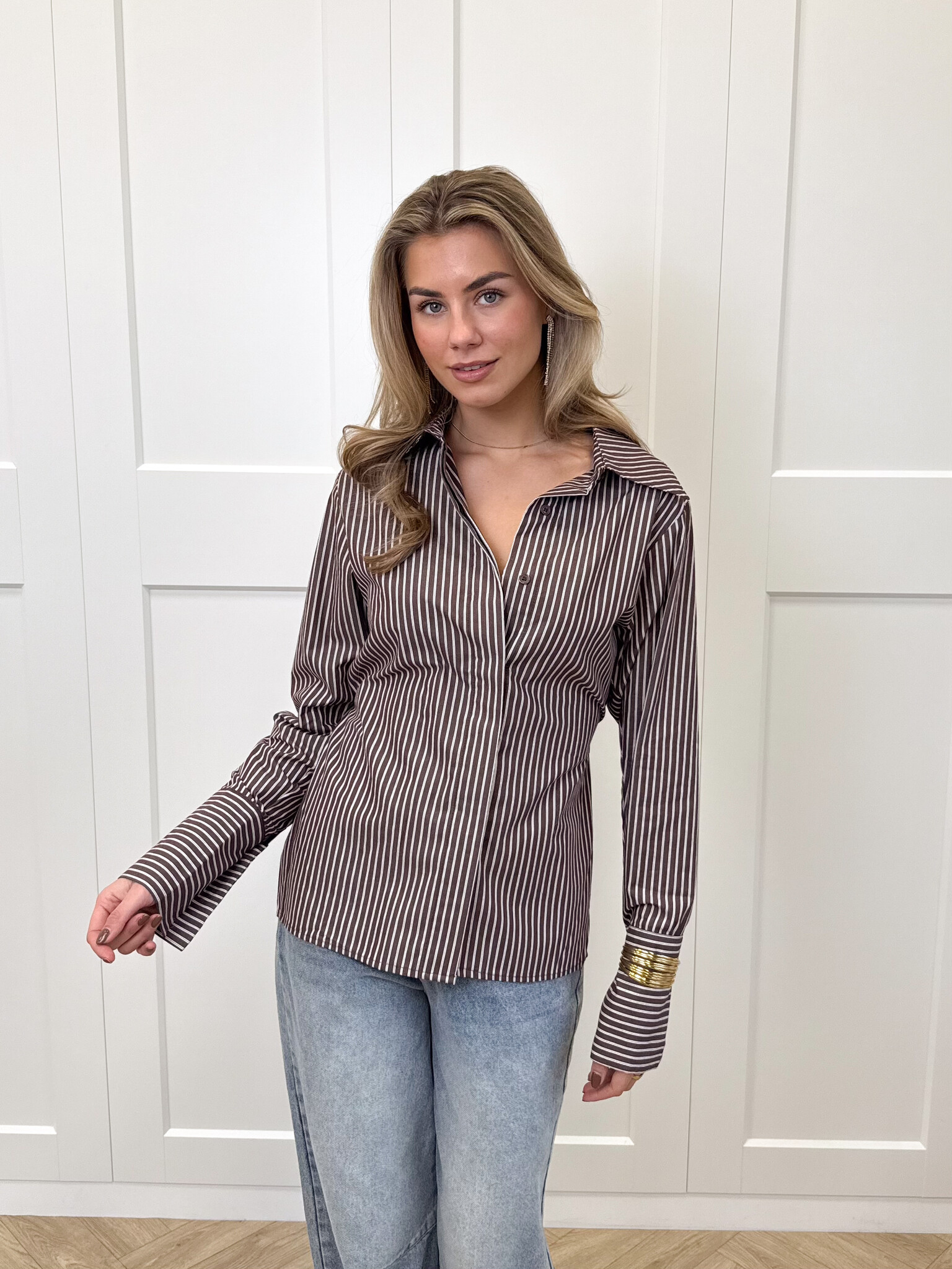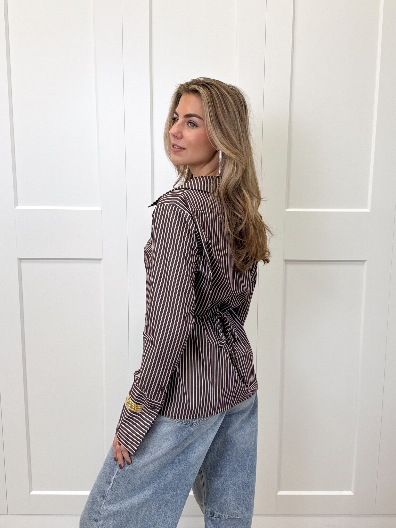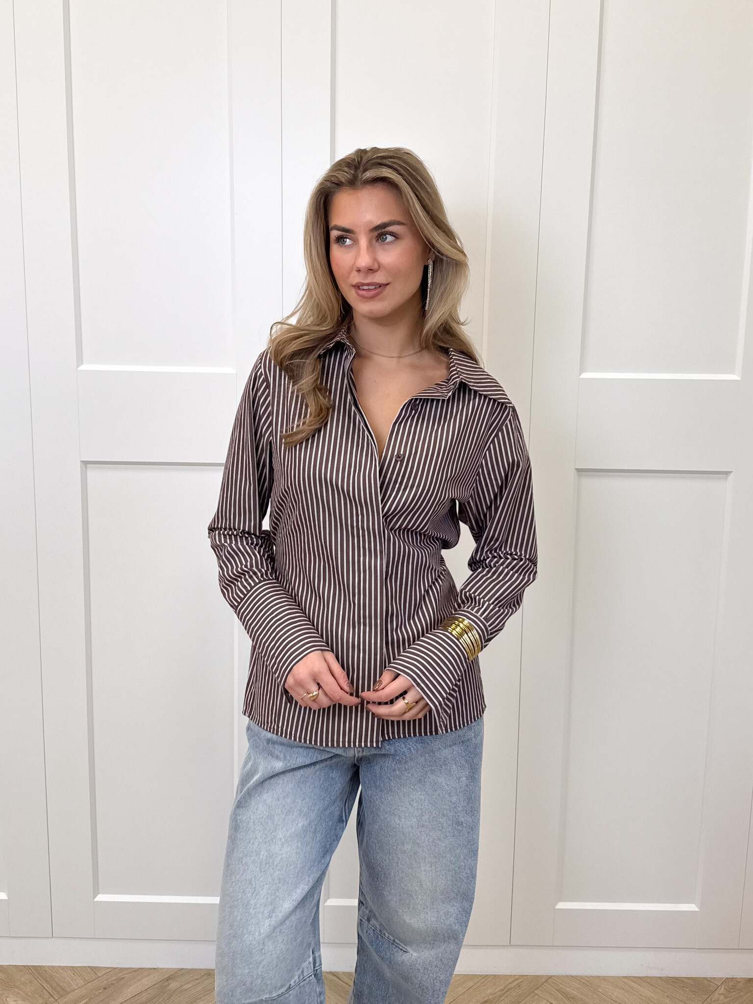 Deze gestreepte blouse combineert comfort en stijl moeiteloos. De kraag geeft een klassieke touch, terwijl de ceintuur aan de achterkant je taille accentueert voor een flatterende, vrouwelijke pasvorm. De blouse is licht getailleerd en valt soepel, waardoor hij zowel casual als chique gestyled kan worden. Perfect te dragen met een pantalon, jeans of rok voor een veelzijdige look die geschikt is voor werk, brunches of een casual avondje uit. De subtiele strepen zorgen voor een frisse en moderne uitstraling, terwijl de zachte stof comfortabel aanvoelt op de huid en de hele dag draagbaar blijft. Een echte essential voor meiden en vrouwen die hun everyday outfits willen upgraden met een classy en trendy item.