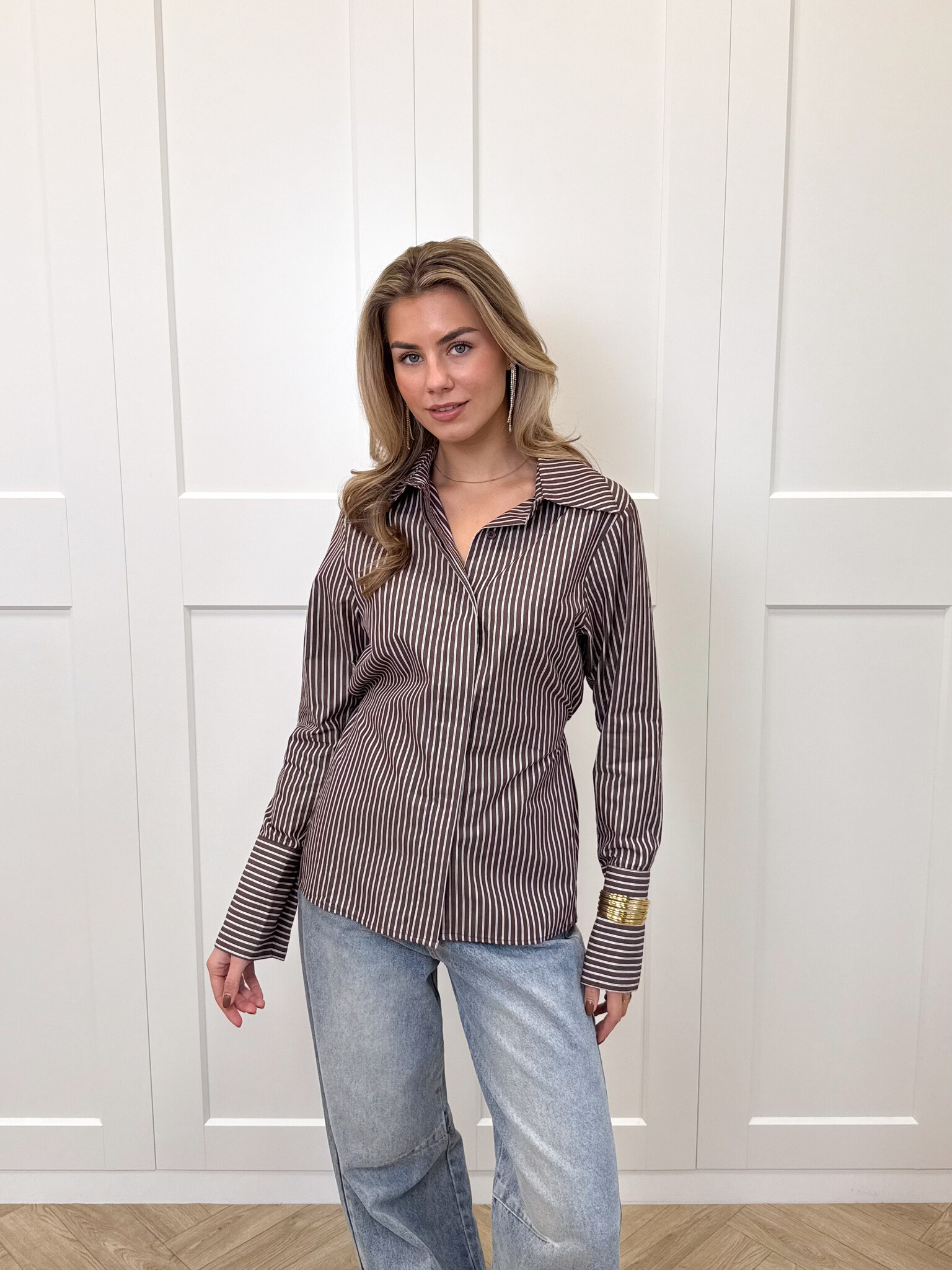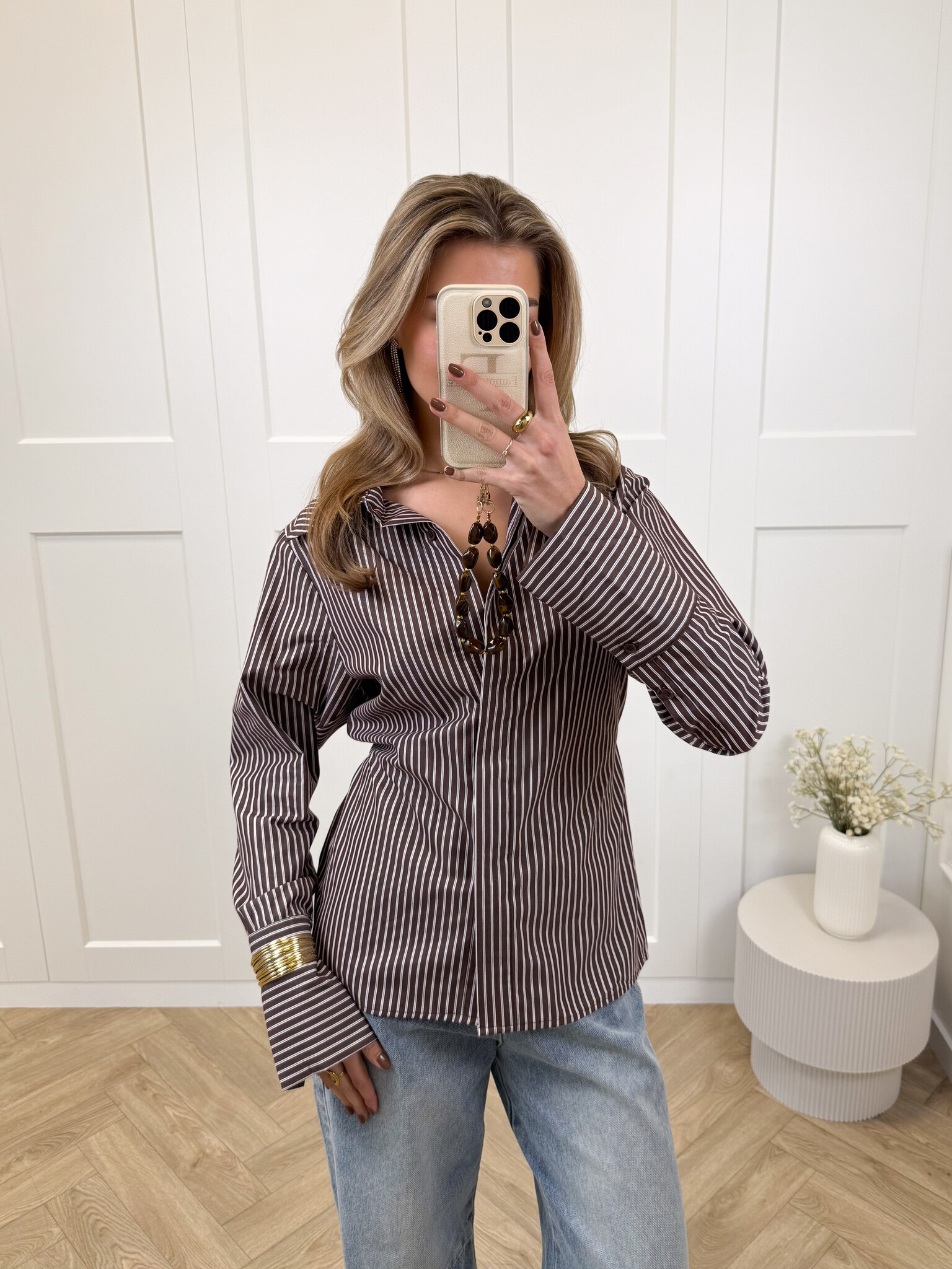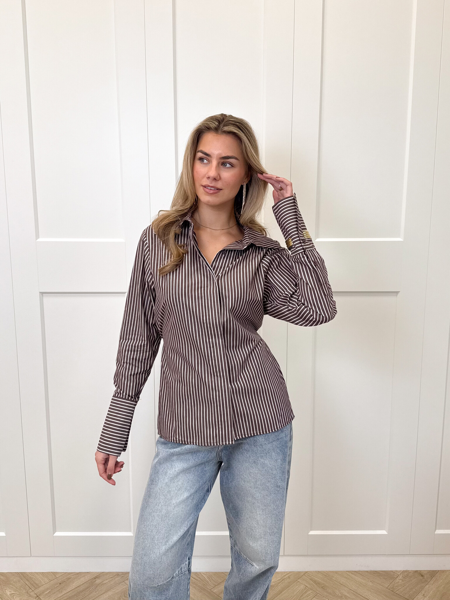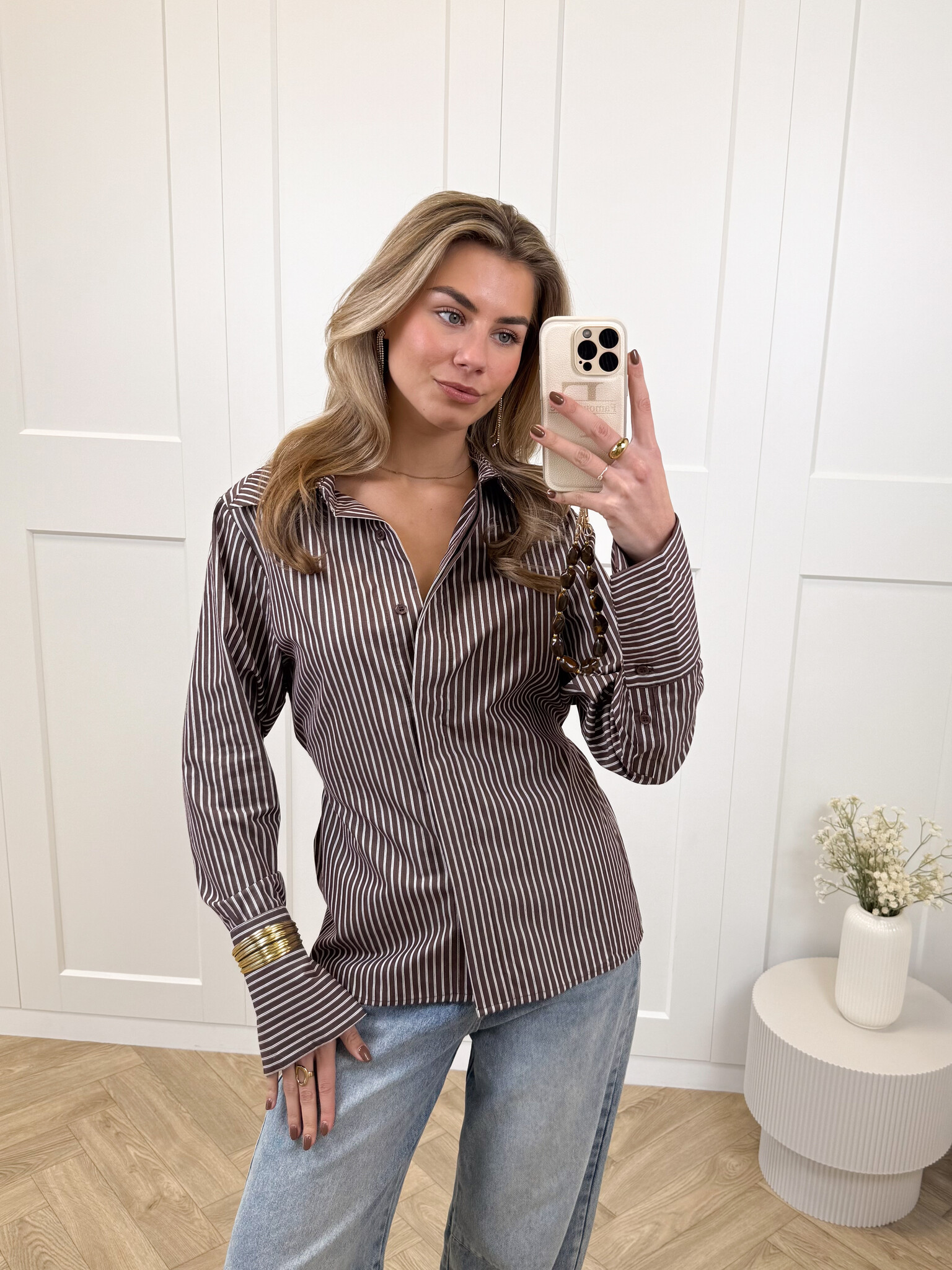 Deze gestreepte blouse combineert comfort en stijl moeiteloos. De kraag geeft een klassieke touch, terwijl de ceintuur aan de achterkant je taille accentueert voor een flatterende, vrouwelijke pasvorm. De blouse is licht getailleerd en valt soepel, waardoor hij zowel casual als chique gestyled kan worden. Perfect te dragen met een pantalon, jeans of rok voor een veelzijdige look die geschikt is voor werk, brunches of een casual avondje uit. De subtiele strepen zorgen voor een frisse en moderne uitstraling, terwijl de zachte stof comfortabel aanvoelt op de huid en de hele dag draagbaar blijft. Een echte essential voor meiden en vrouwen die hun everyday outfits willen upgraden met een classy en trendy item.