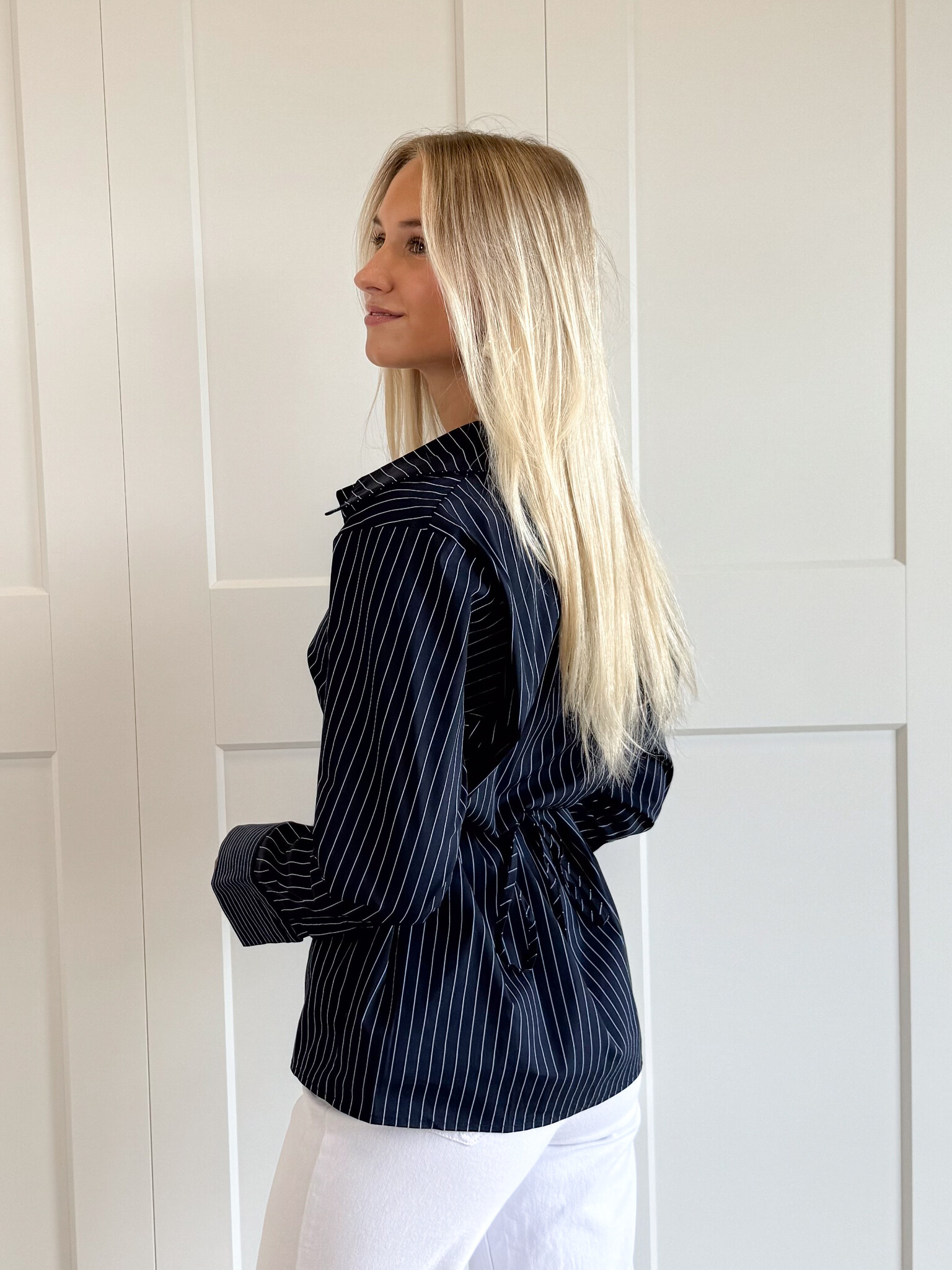 De soepele stof voelt comfortabel aan en zorgt ervoor dat de blouse mooi valt. Doordat het lint aan de achterkant zit, blijft de voorkant clean en strak, waardoor het geheel een moderne uitstraling behoudt. Het krijtstreepdesign maakt deze blouse bovendien tijdloos, zodat je hem seizoen na seizoen kunt blijven dragen.