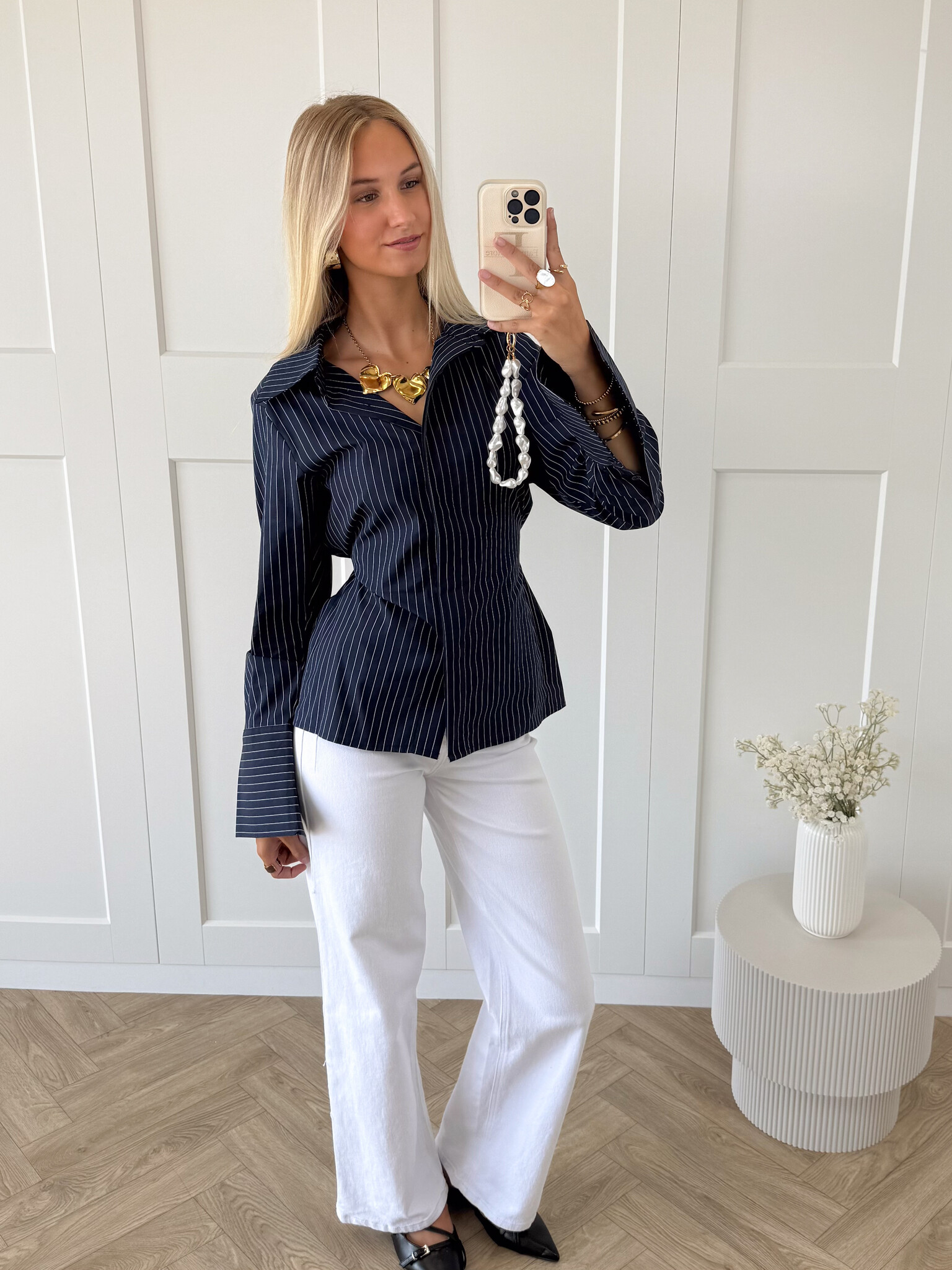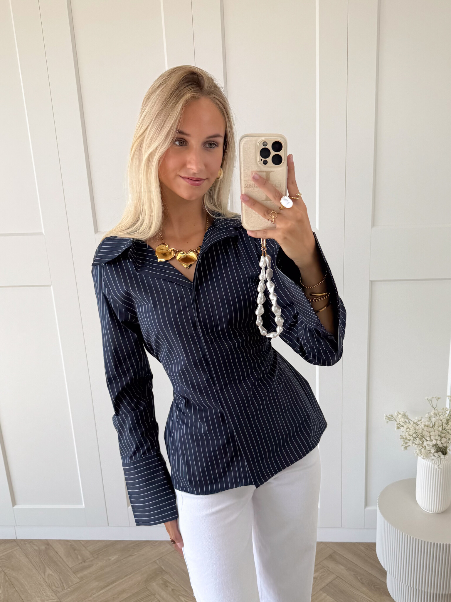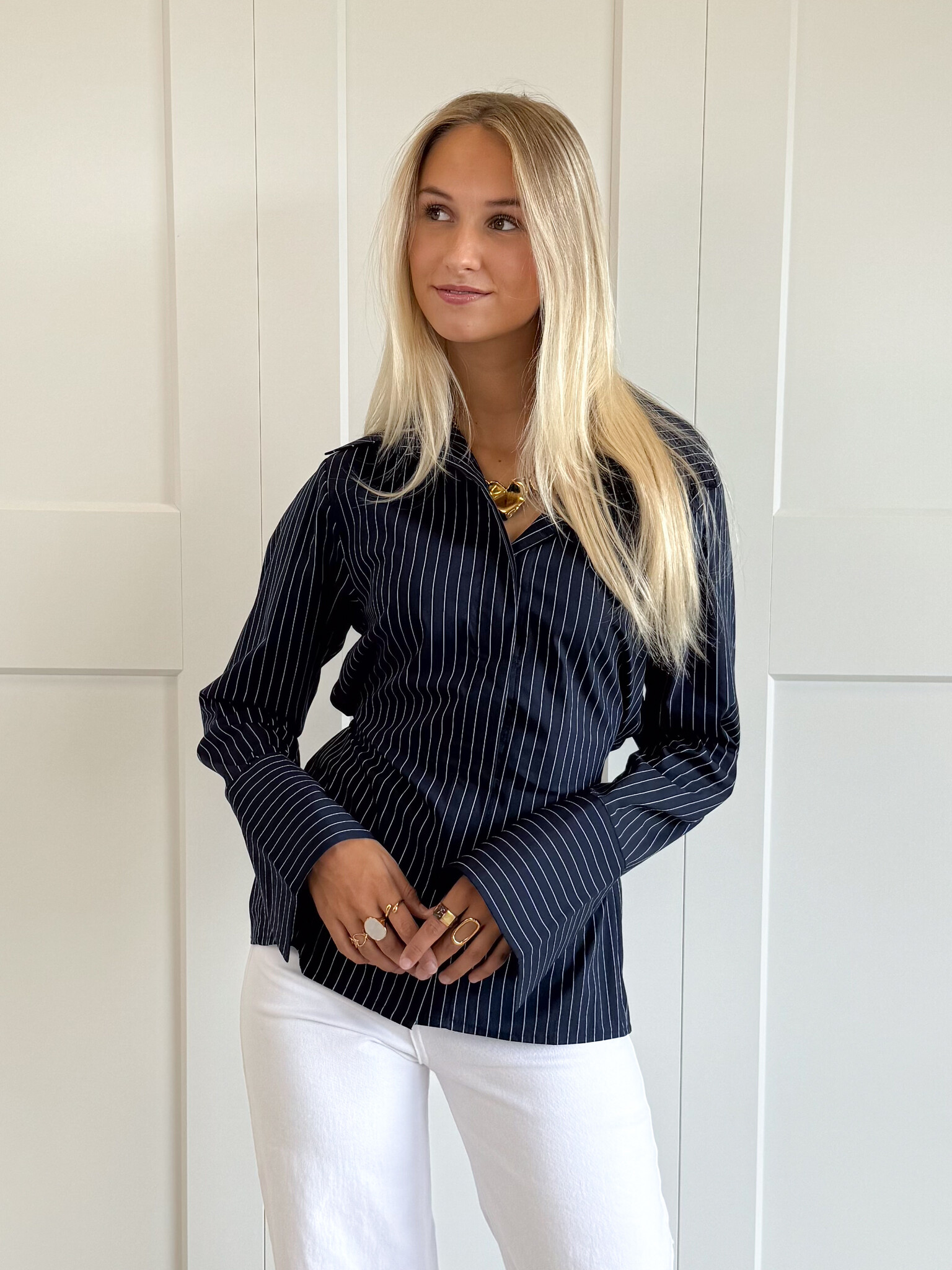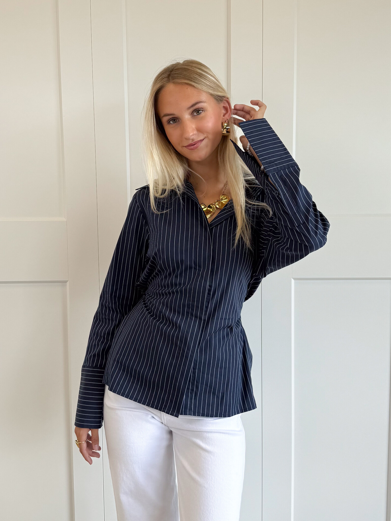 Deze navy blouse met krijtstrepen is hét item dat je outfit direct een classy upgrade geeft. Het tijdloze streeppatroon straalt elegantie uit, terwijl de subtiele details zorgen voor een moderne en vrouwelijke touch. De blouse heeft een klassieke kraag en een striklint aan de achterkant waarmee je je taille kunt accentueren. Zo creëer je eenvoudig een flatterend silhouet dat zowel vrouwelijk als stijlvol oogt.