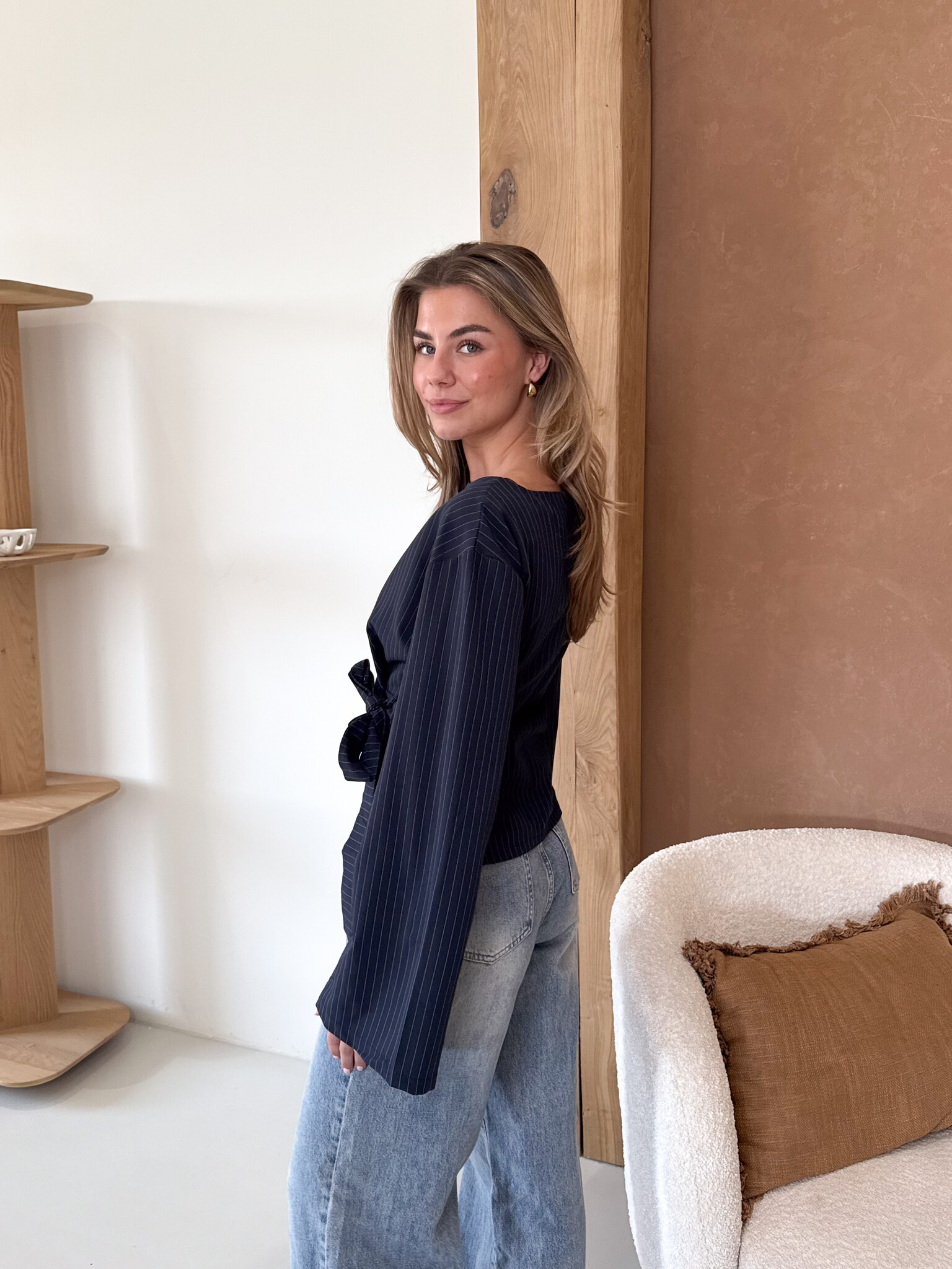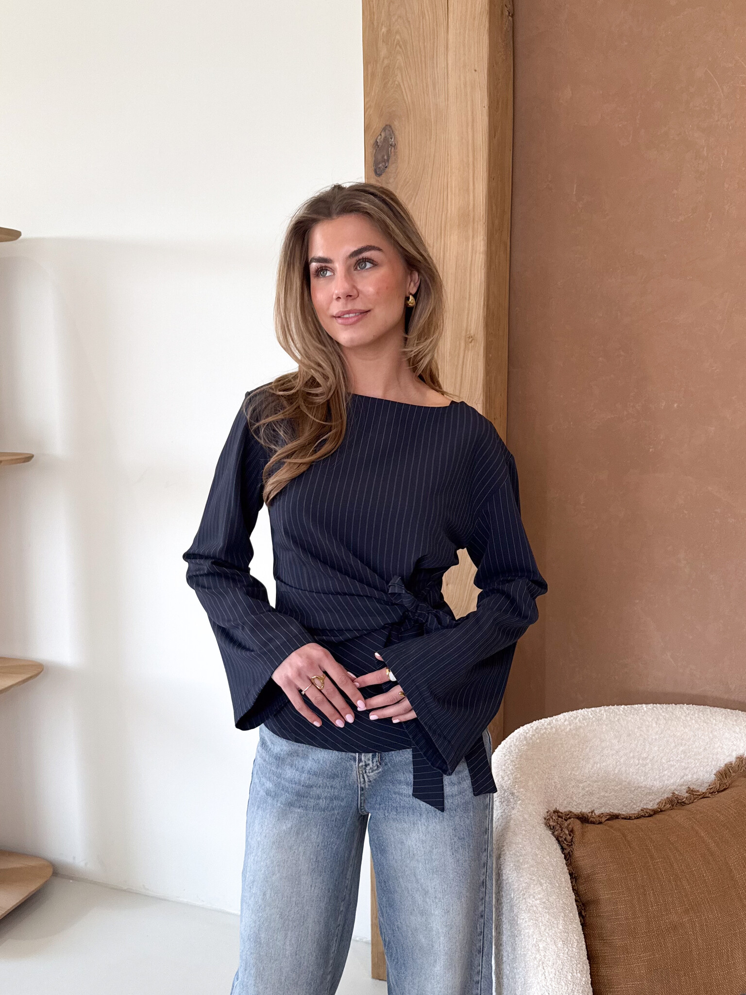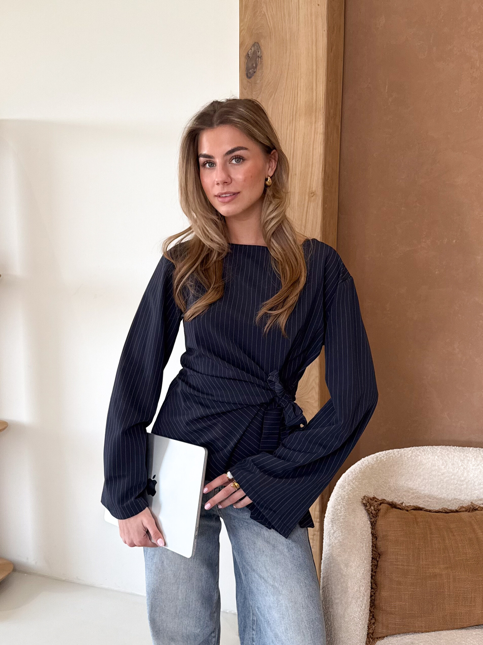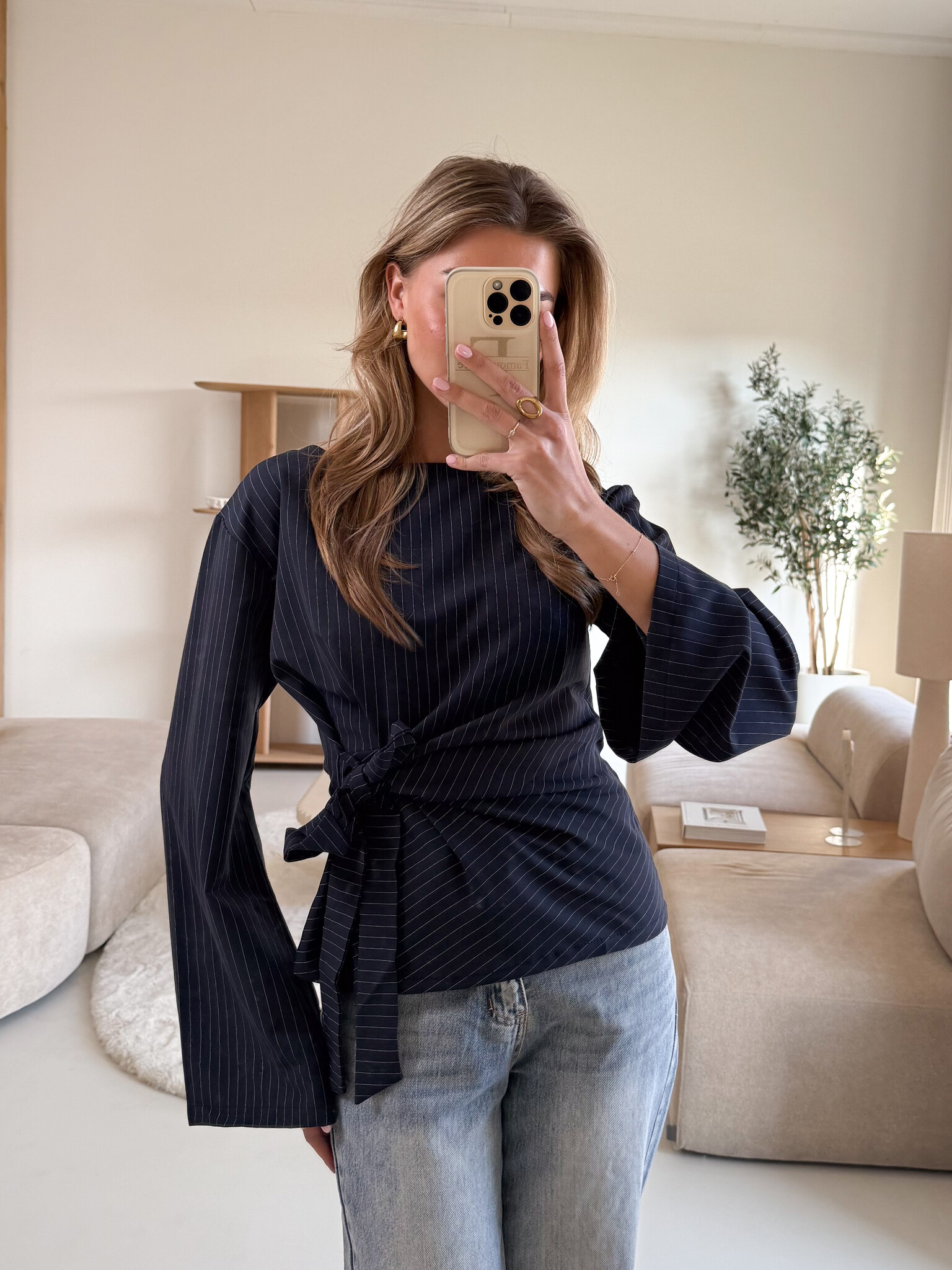 Deze strepen top straalt pure elegantie uit en is een echte eyecatcher in je garderobe. De lange mouwen en getailleerde pasvorm zorgen voor een vrouwelijke en flatterende look. Het extra stofdetail dat je kunt strikken geeft een speels maar chic accent en laat je taille mooi uitkomen. De zachte stof voelt comfortabel aan en maakt het item fijn om zowel overdag als ’s avonds te dragen. Combineer met een pantalon voor een classy vibe of met een jeans voor een meer casual maar stijlvolle outfit. Perfect voor etentjes, feestjes of een date night waar je net iets meer wilt shinen ✨