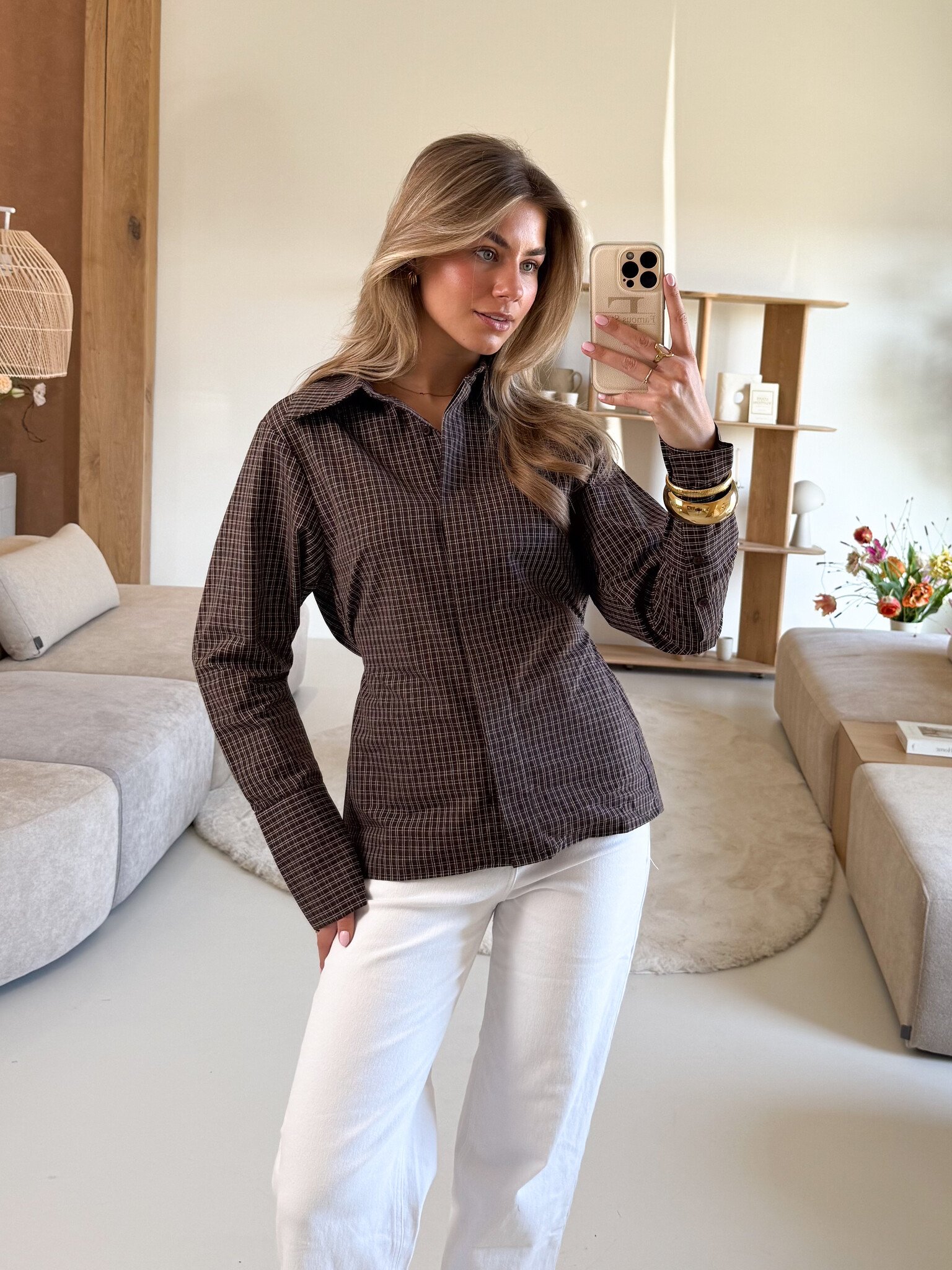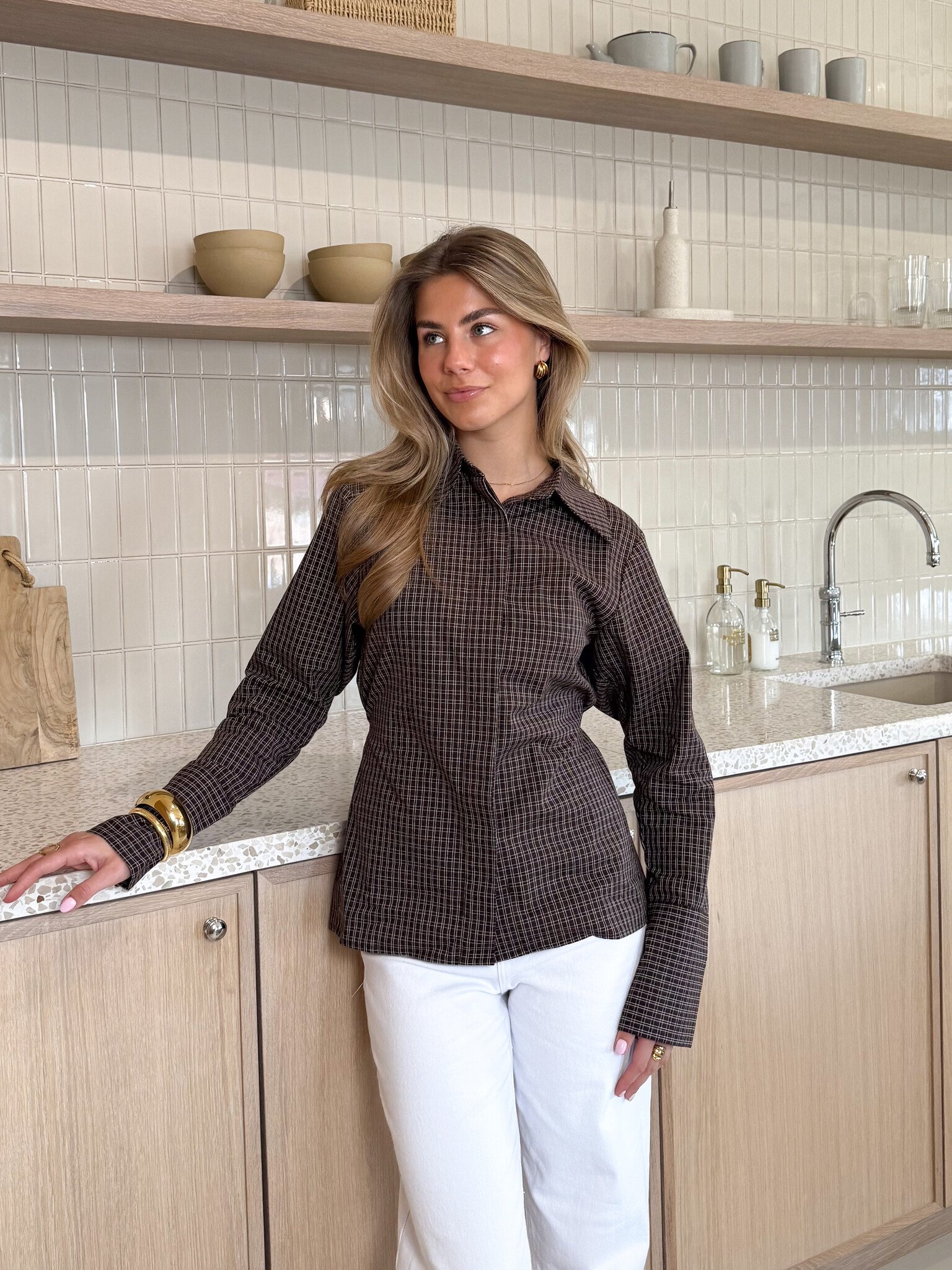 Deze geruite blouse is de perfecte mix van classy en girly. De subtiele ruitprint geeft een tijdloze uitstraling, terwijl de ceintuur aan de achterkant zorgt voor een mooi getailleerd effect. Hierdoor accentueer je je taille op een elegante manier zonder dat de blouse strak zit. De stof voelt comfortabel aan en valt soepel langs het lichaam. Ideaal voor werk, school, een lunchdate of een dagje stad. Een item dat je moeiteloos styled voor elke gelegenheid.