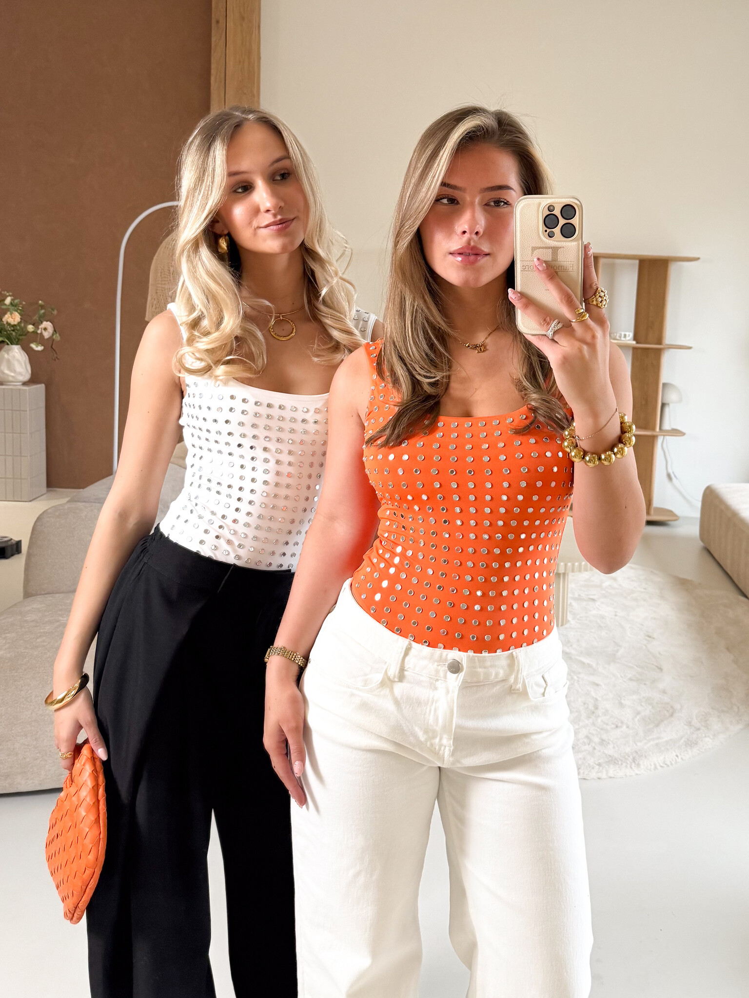 Deze body is perfect voor girls die houden van een statement look. De vierkante hals zorgt voor een vrouwelijke en trendy uitstraling, terwijl de studs een stoere, feestelijke touch geven. Dankzij de stretchstof sluit de body mooi aan op je lichaam en zit hij comfortabel, ook tijdens een lange avond uit. De pasvorm accentueert je silhouet en blijft goed op zijn plek, ideaal om te combineren met een high waist jeans, rok of pantalon. Of je nu naar een feestje, een clubnight of een avondje cocktails gaat, met dit item steel je gegarandeerd de show. Selena combineert girly vibes met een edgy twist en maakt elke party outfit compleet.