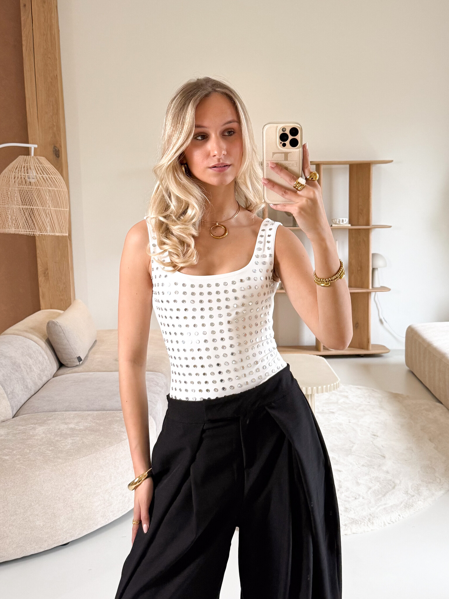 Deze body is perfect voor girls die houden van een statement look. De vierkante hals zorgt voor een vrouwelijke en trendy uitstraling, terwijl de studs een stoere, feestelijke touch geven. Dankzij de stretchstof sluit de body mooi aan op je lichaam en zit hij comfortabel, ook tijdens een lange avond uit. De pasvorm accentueert je silhouet en blijft goed op zijn plek, ideaal om te combineren met een high waist jeans, rok of pantalon. Of je nu naar een feestje, een clubnight of een avondje cocktails gaat, met dit item steel je gegarandeerd de show. Selena combineert girly vibes met een edgy twist en maakt elke party outfit compleet.