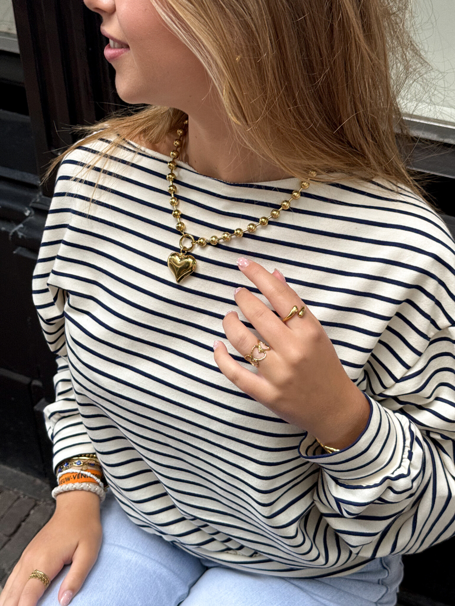 Maak kennis met deze gouden kralenketting. Een statement sieraad met een hartbedel in het midden. De combinatie van dikke gouden kralen en een opvallende hartbedel geeft een krachtige, liefdevolle uitstraling. Dankzij de korte lengte sluit de ketting mooi aan bij de halslijn, waardoor hij perfect opvalt boven een eenvoudig shirt of jurk. Een eyecatcher die zowel stoer als elegant is, en elke outfit direct een liefdevolle touch geeft.