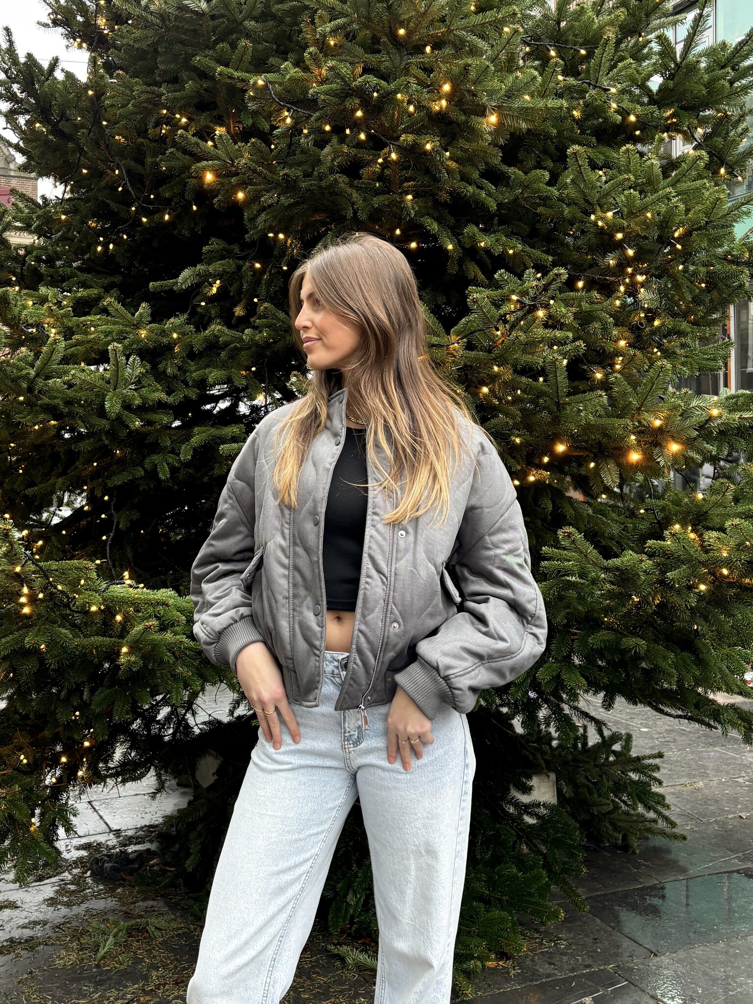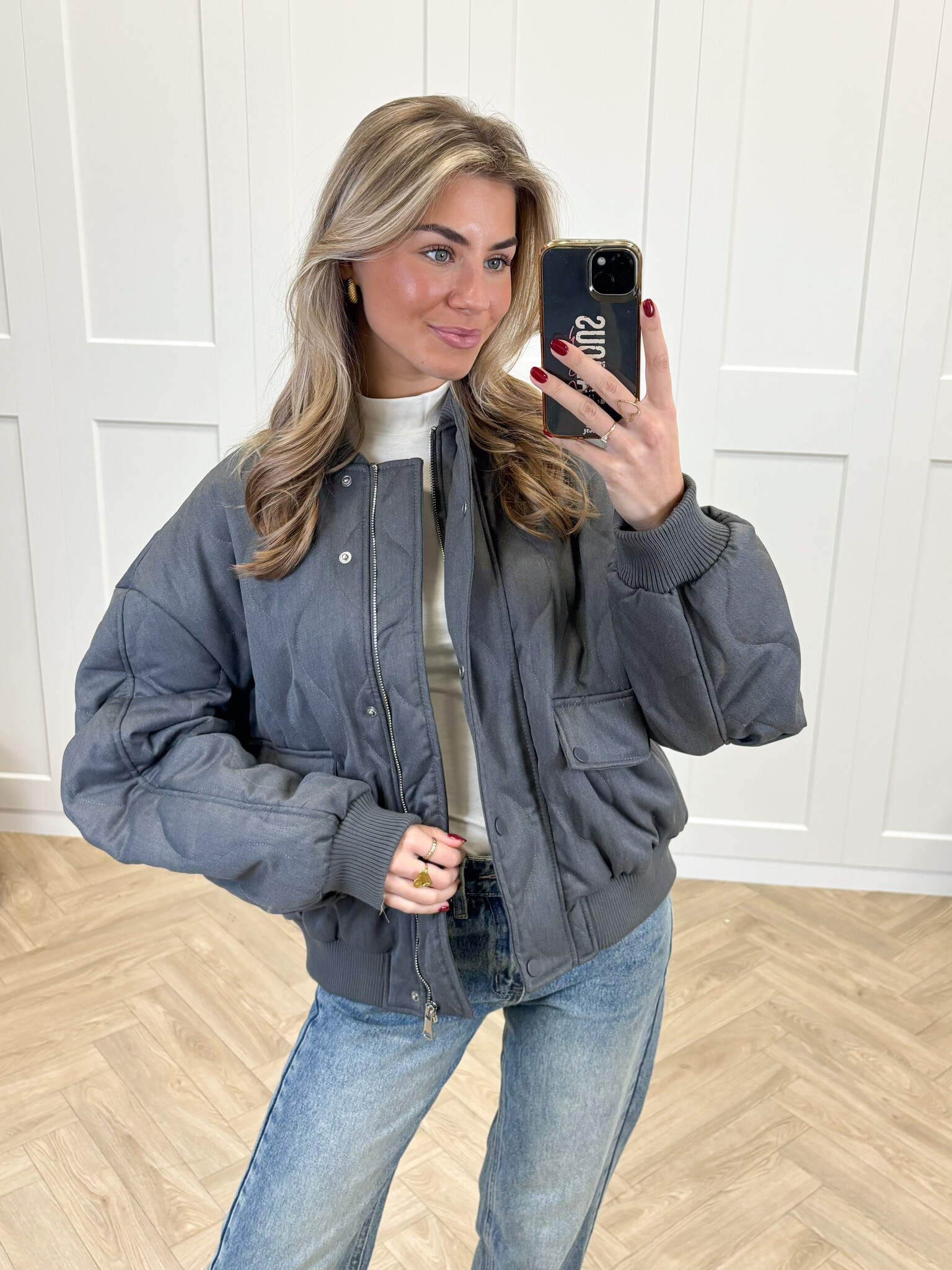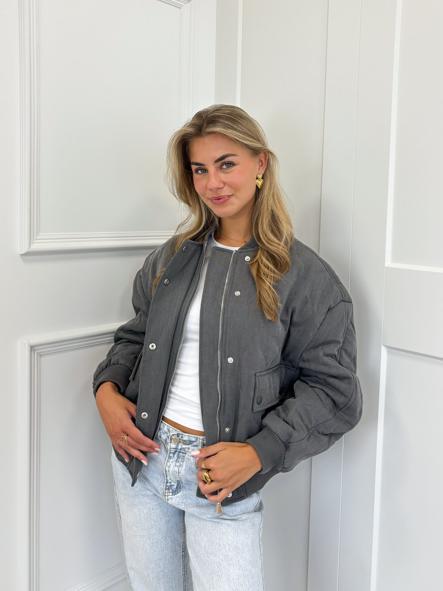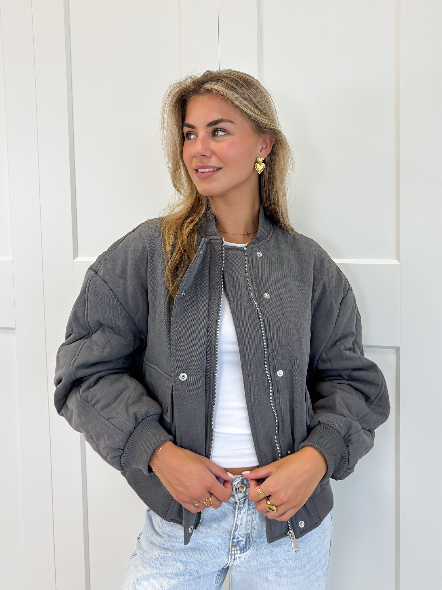 Loop er helemaal trendy bij dit najaar met deze bomber jas! Een tijdloze trend die je altijd leuk kan stylen. Een tussen jas die je goed warm houd voor de koudere dagen. Er zit aan de voorkant knoopjes en een ritssluiting. Het valt een klein beetje oversized en heeft een gewatteerde effect wat het een echte eyecatcher maakt. Je shopt deze bomber jas in meerdere kleuren!
