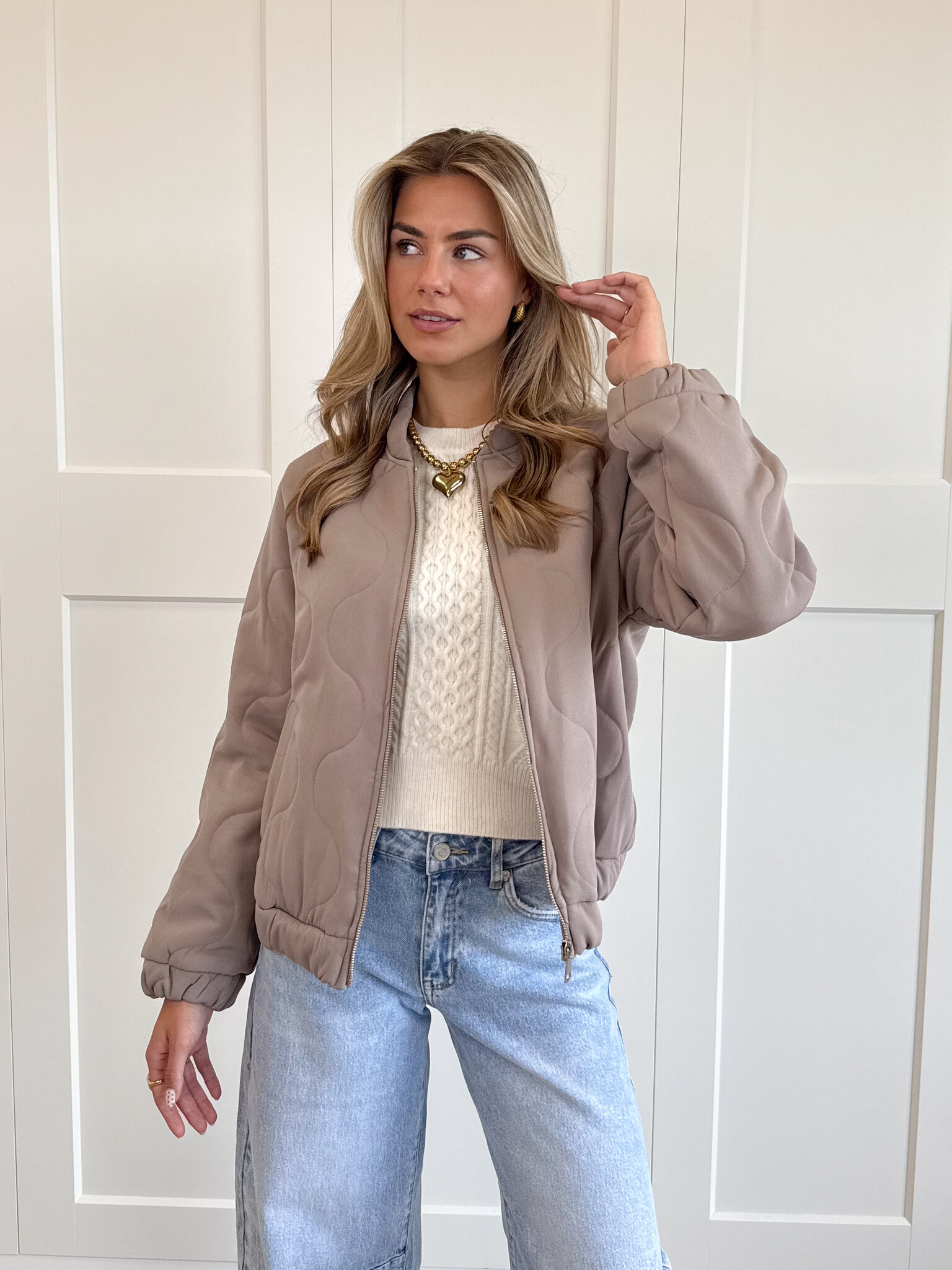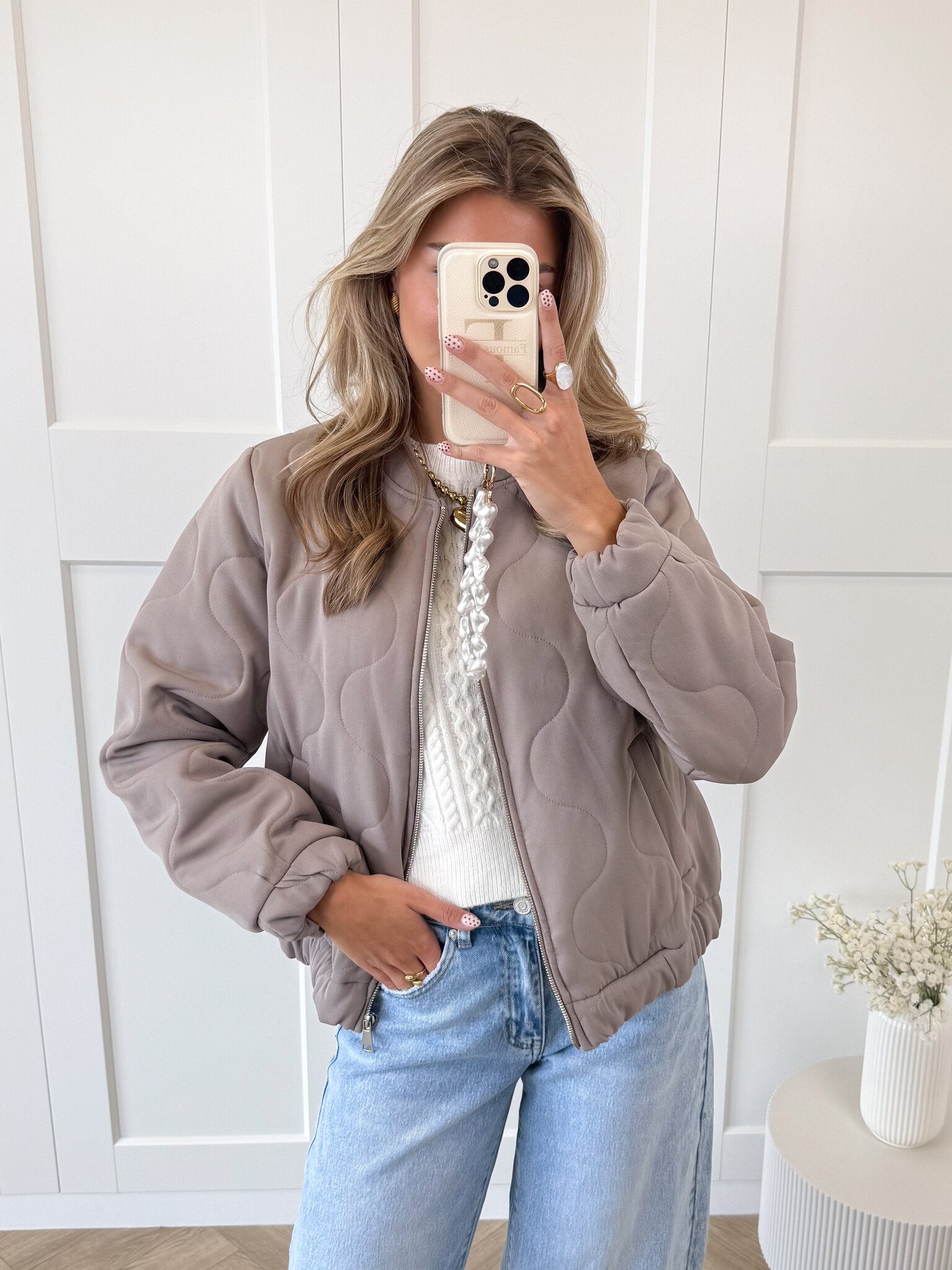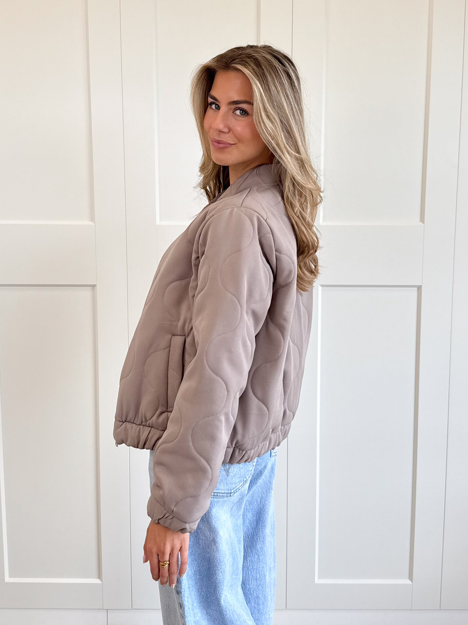 Meet Mosa, de taupe gewatteerde bomber die jouw garderobe compleet maakt. Het doorgestikte patroon in golvende lijnen geeft deze jas een moderne twist, terwijl de zachte stof en lichte vulling zorgen voor optimaal draagcomfort. Met de rits, elastische boorden en relaxte fit is Mosa de perfecte tussenjas: stijlvol, praktisch en makkelijk te combineren.