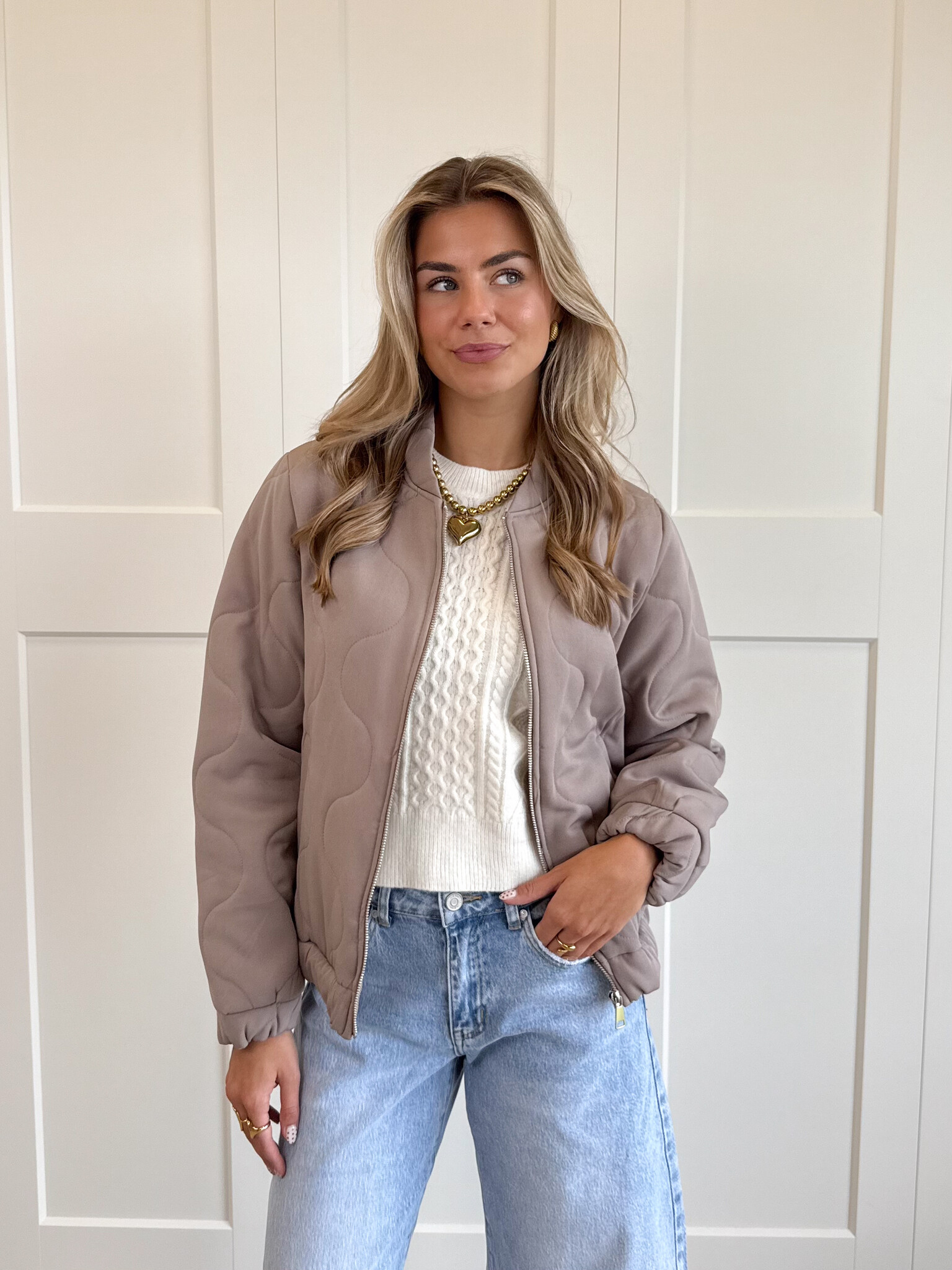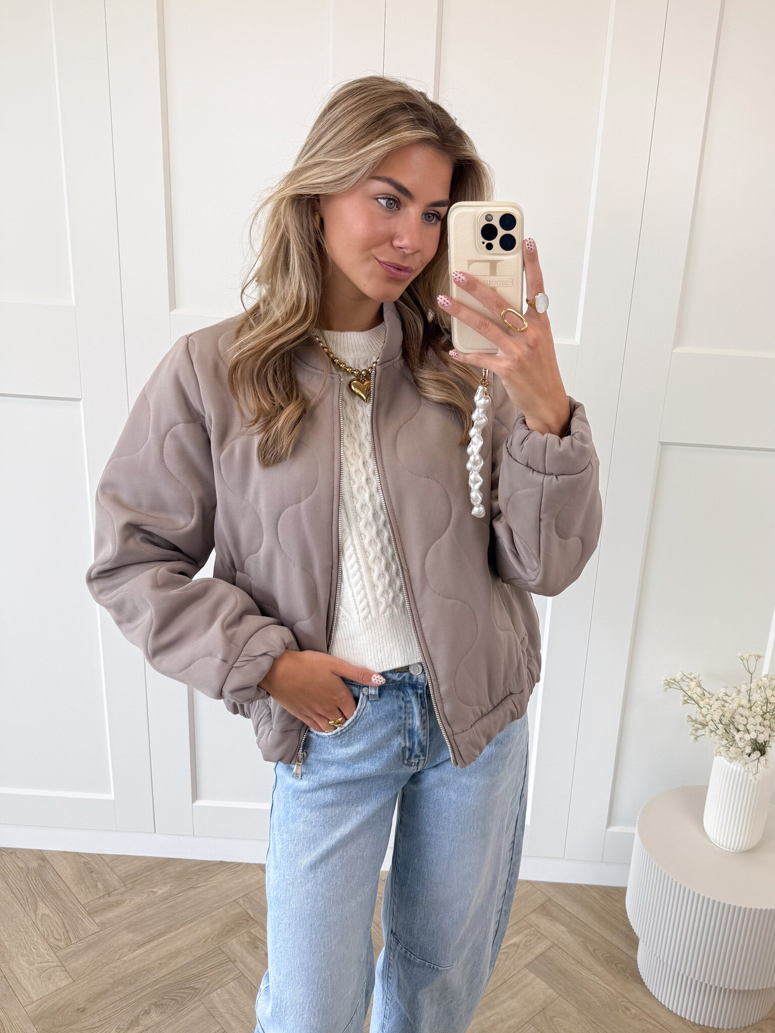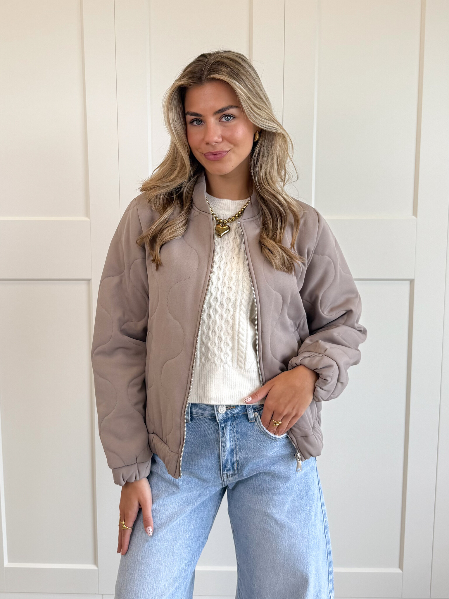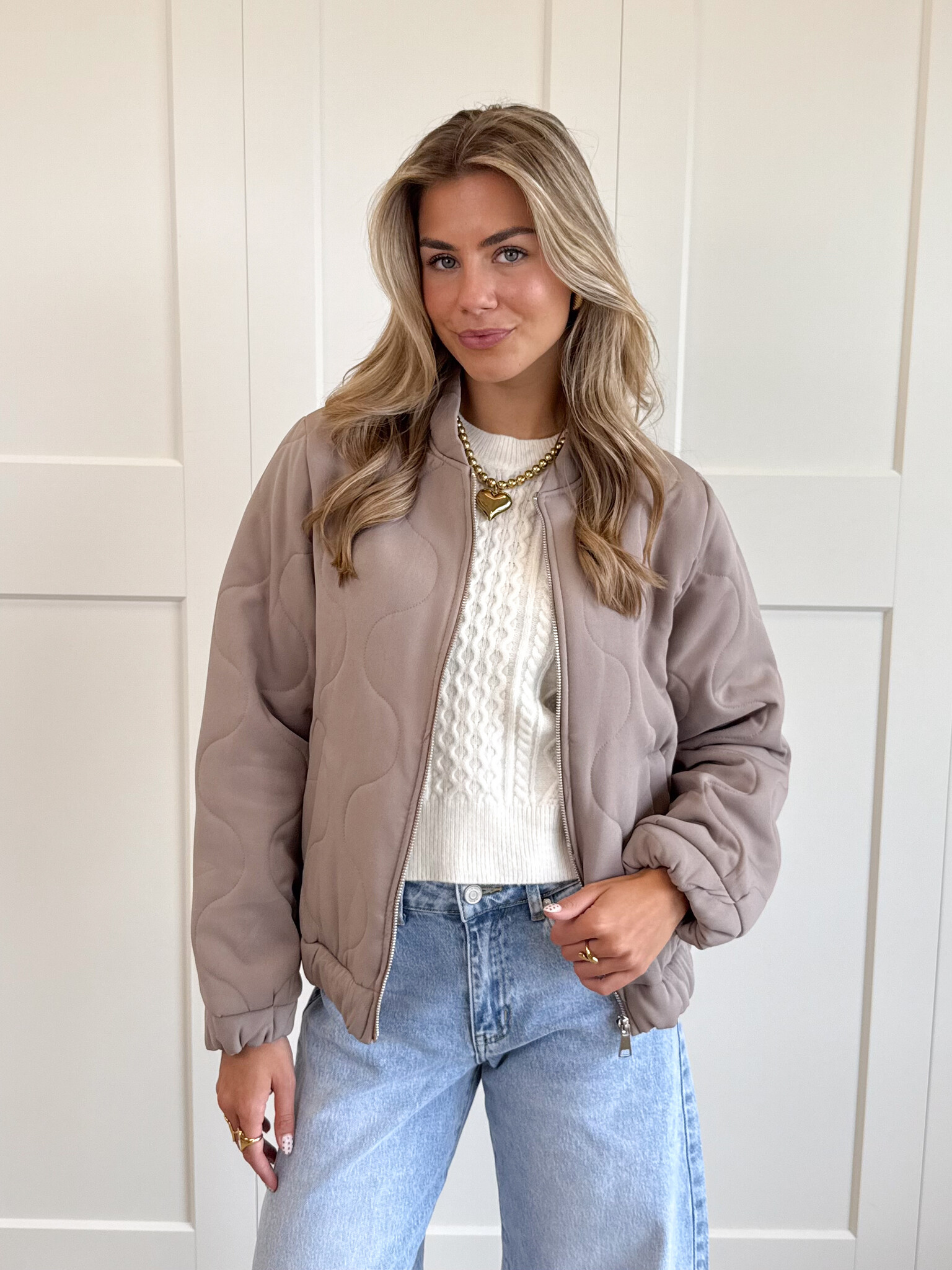 Meet Mosa, de taupe gewatteerde bomber die jouw garderobe compleet maakt. Het doorgestikte patroon in golvende lijnen geeft deze jas een moderne twist, terwijl de zachte stof en lichte vulling zorgen voor optimaal draagcomfort. Met de rits, elastische boorden en relaxte fit is Mosa de perfecte tussenjas: stijlvol, praktisch en makkelijk te combineren.