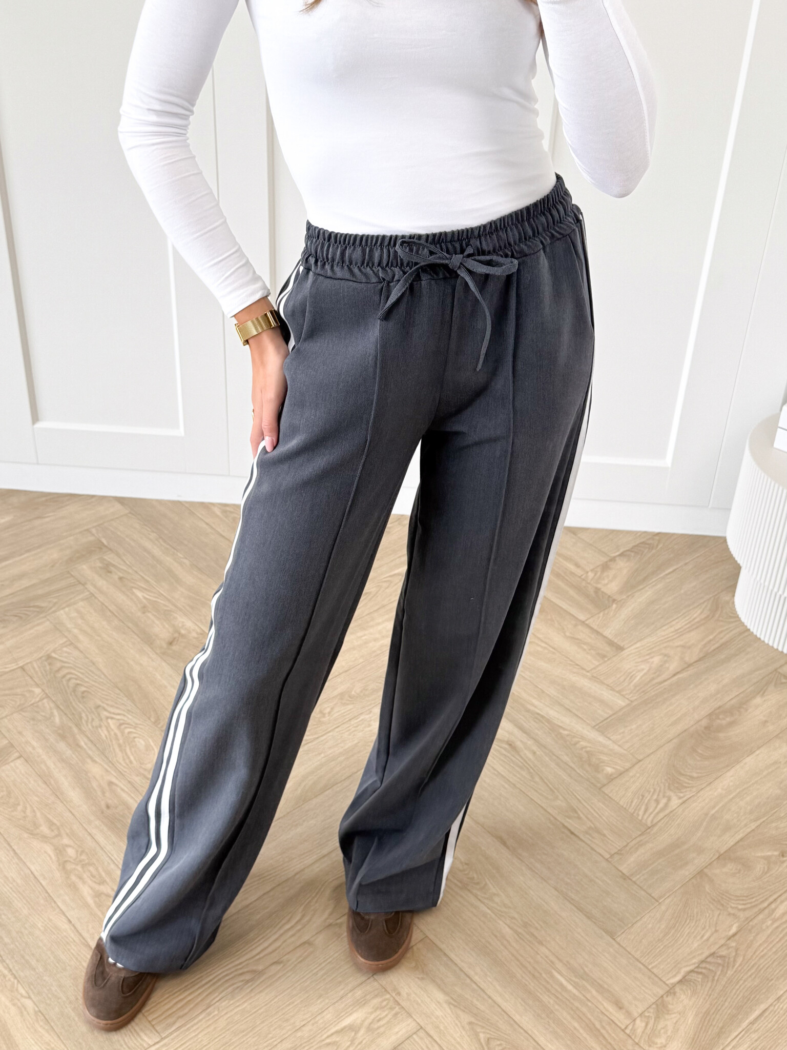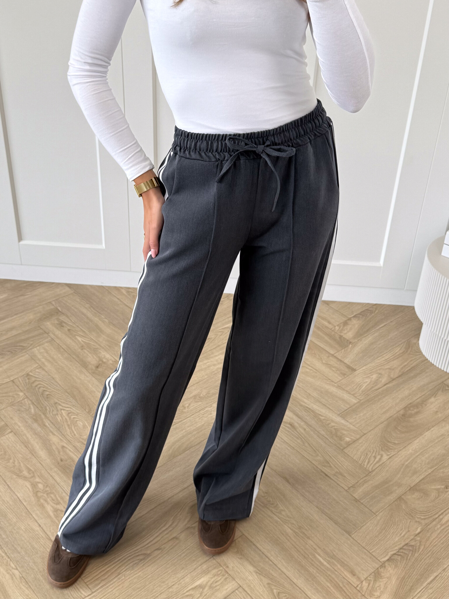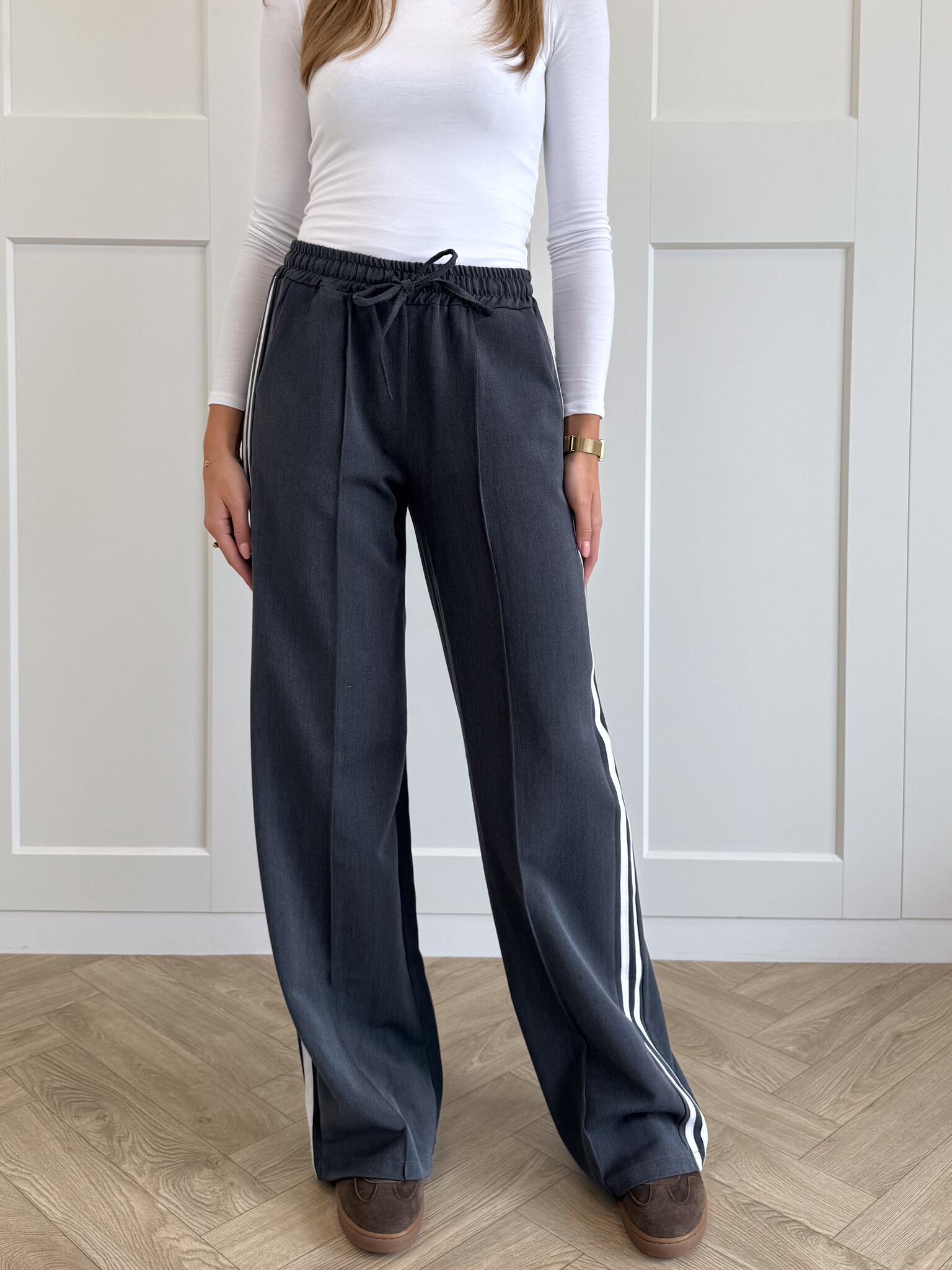 Deze grijze trainingsbroek is de perfecte mix van comfort en stijl. Gemaakt van een zachte, soepelvallende stof die heerlijk zit, met een elastische taille en verstelbare touwtjes voor de ideale fit. De strepen langs de zijkanten geven die sporty vibe en de straight fit maakt hem ook super draagbaar als casual pantalon. Combineer met sneakers en een oversized tee voor een relaxte look, of draag hem met een blazer voor een sporty chic outfit!