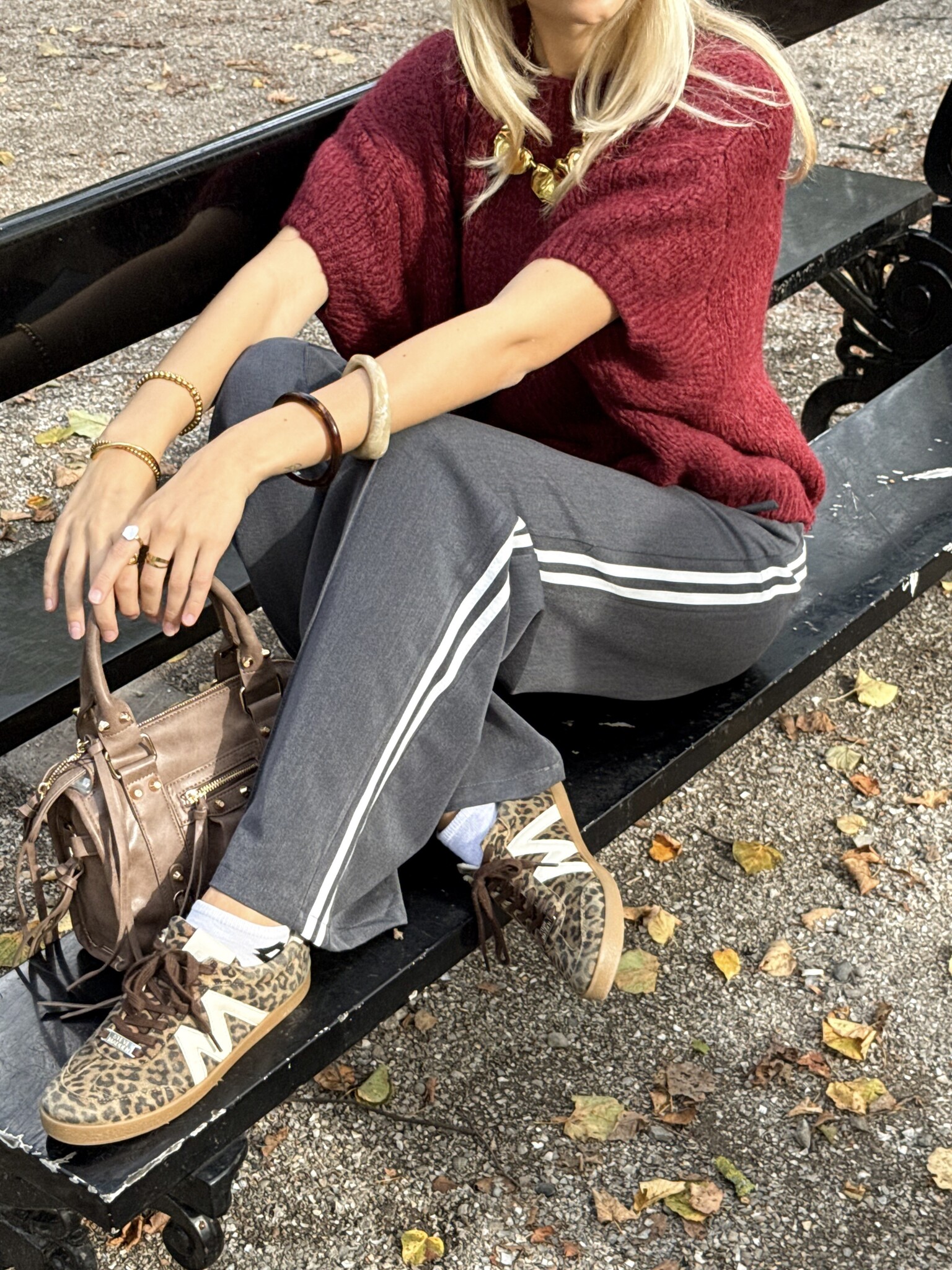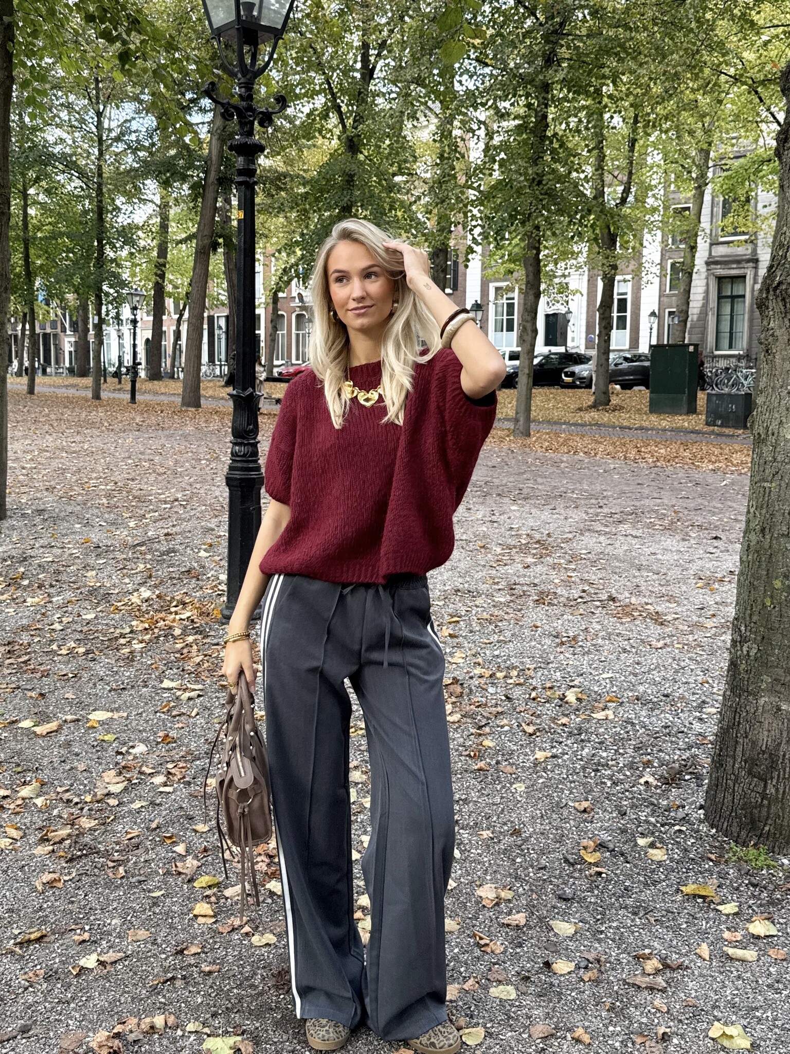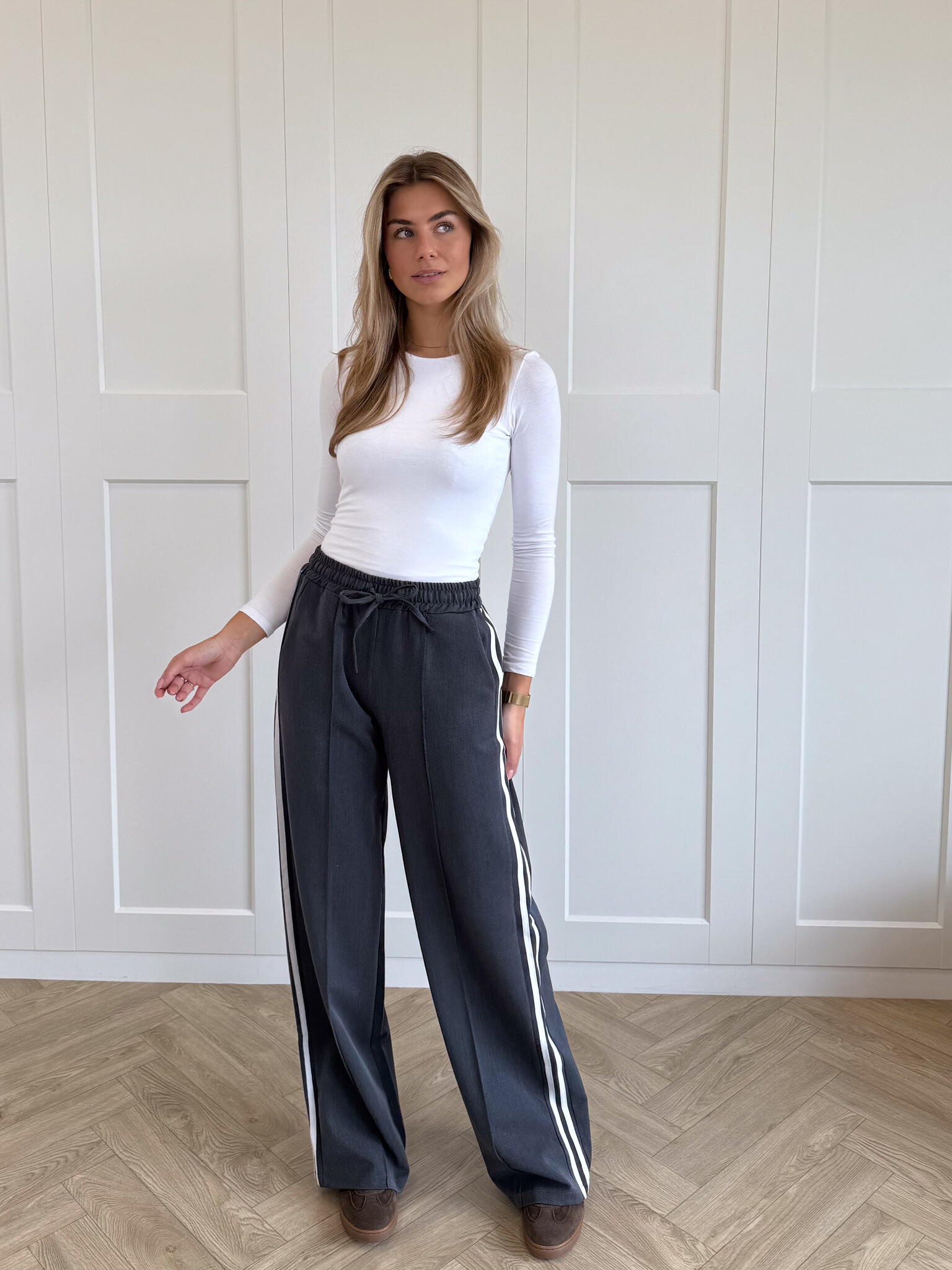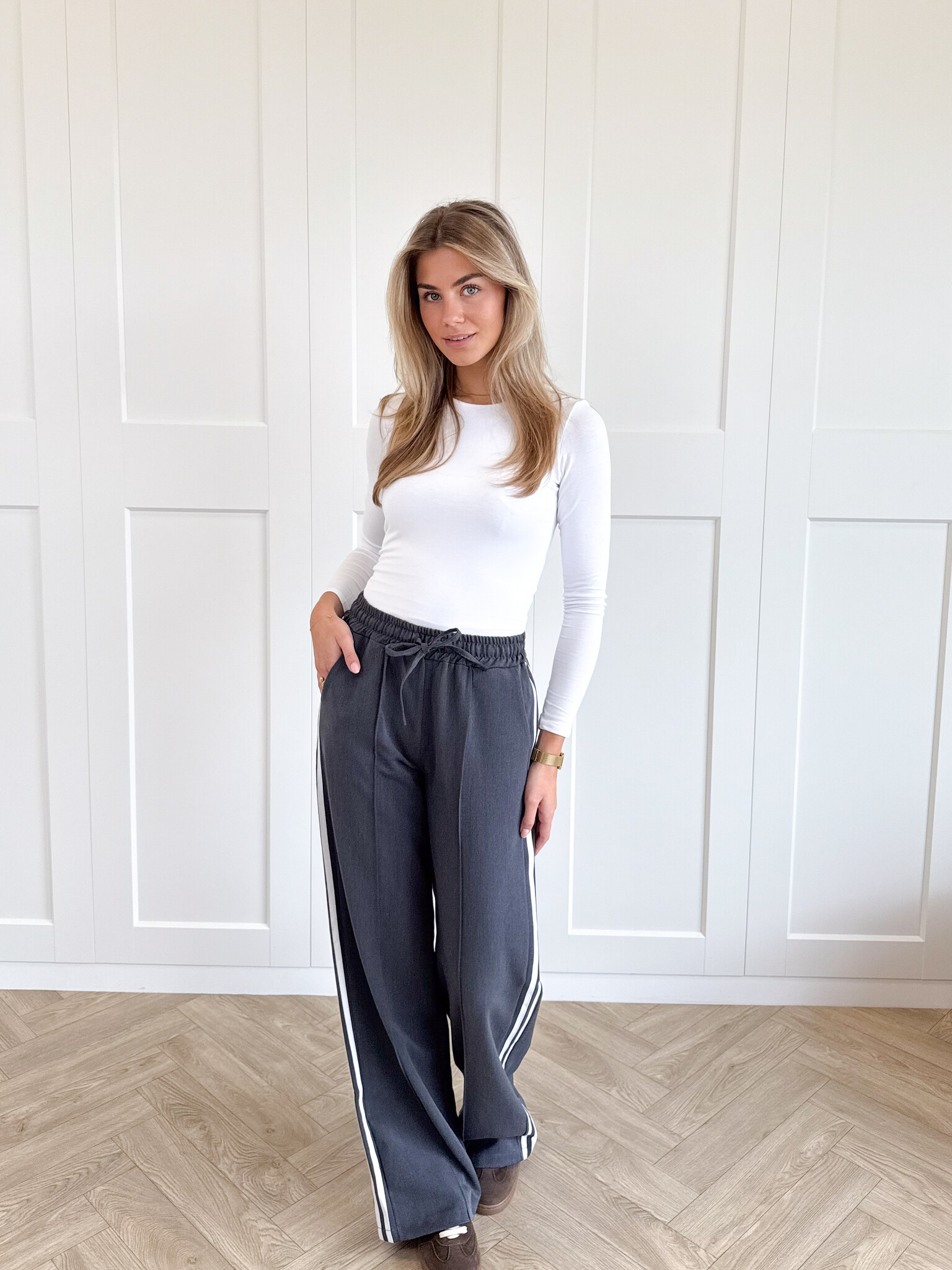 Deze grijze trainingsbroek is de perfecte mix van comfort en stijl. Gemaakt van een zachte, soepelvallende stof die heerlijk zit, met een elastische taille en verstelbare touwtjes voor de ideale fit. De strepen langs de zijkanten geven die sporty vibe en de straight fit maakt hem ook super draagbaar als casual pantalon. Combineer met sneakers en een oversized tee voor een relaxte look, of draag hem met een blazer voor een sporty chic outfit!