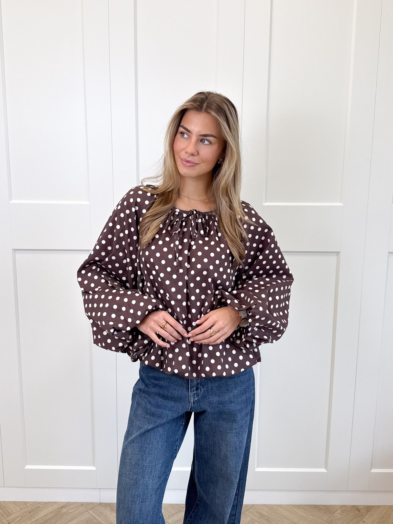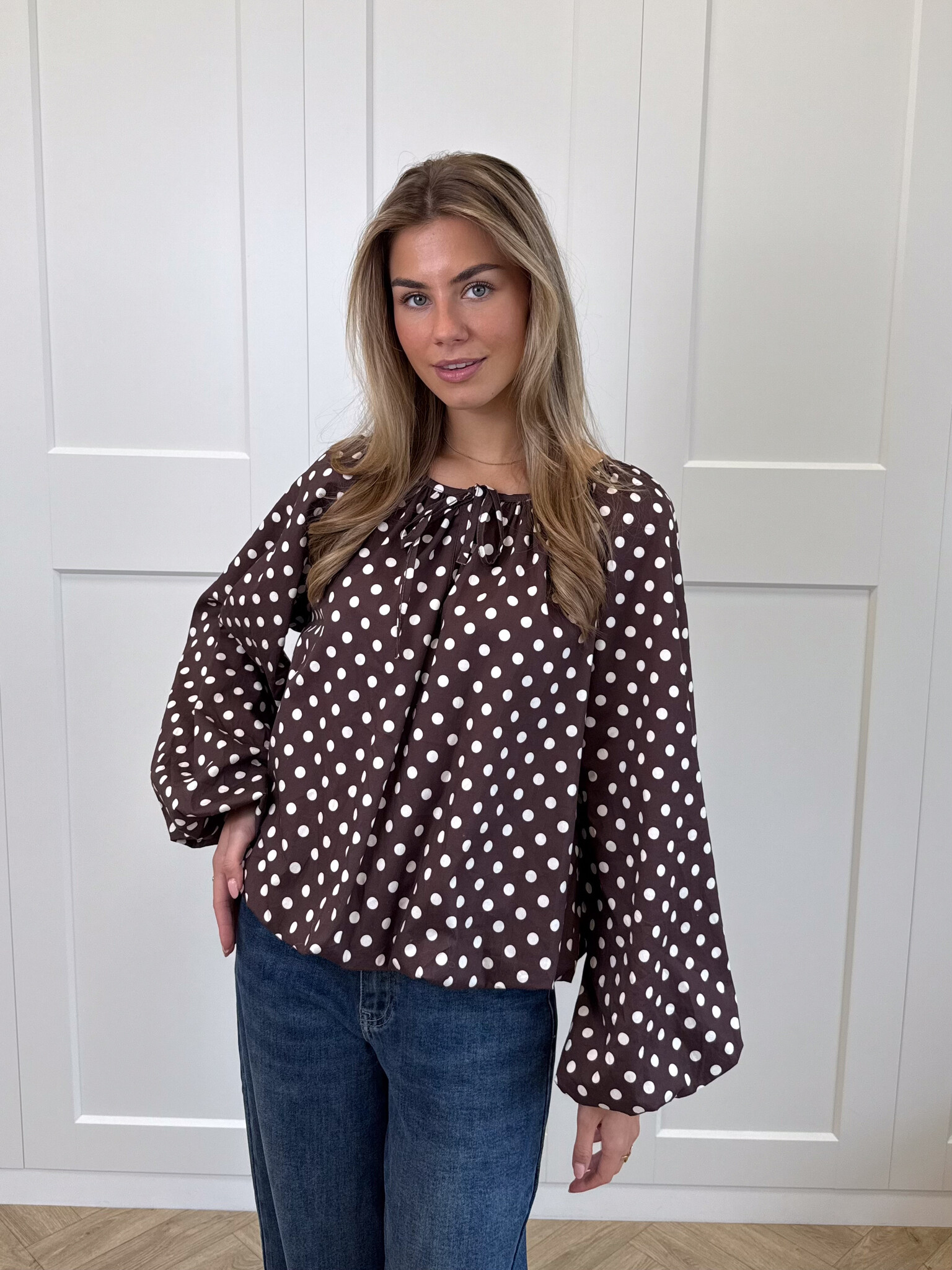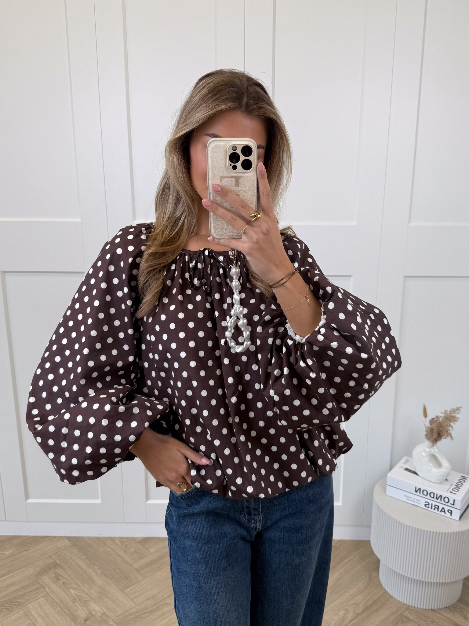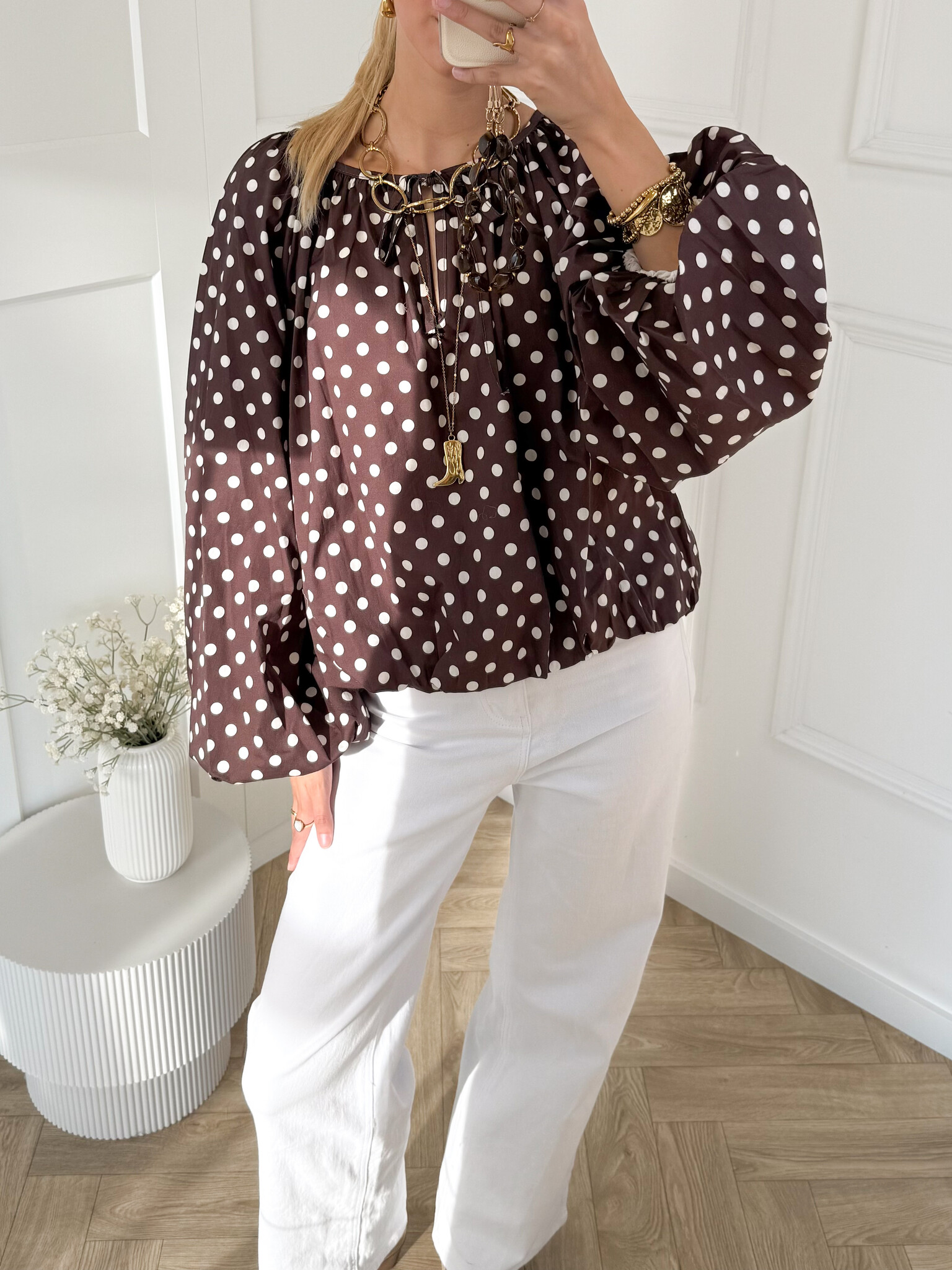 Deze top in bruine kleur met beige polkadots/ witte stippen is een elegante en vrouwelijke toevoeging aan je garderobe. Het getailleerde model en de lange pofmouwen en hoge boothals met strikje geven een speelse uitstraling. Perfect te combineren met een jeans voor een casual look of een rok voor een nettere outfit.