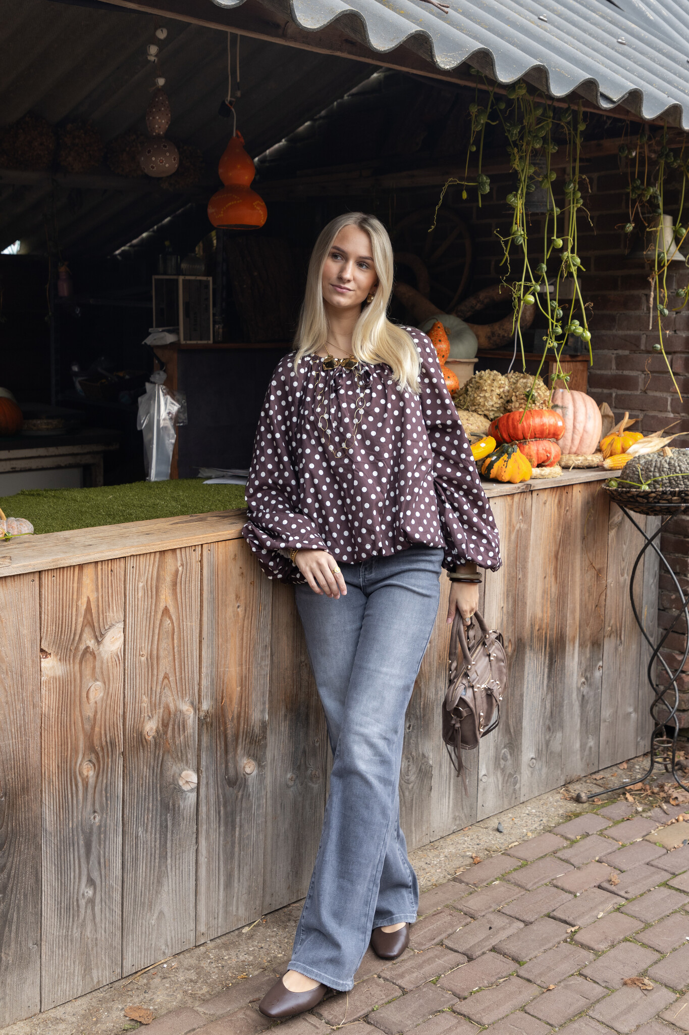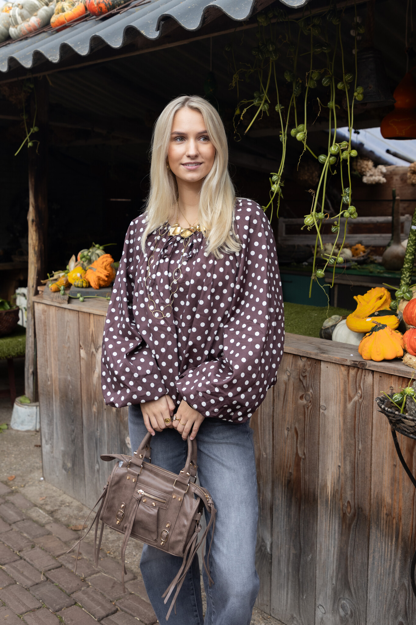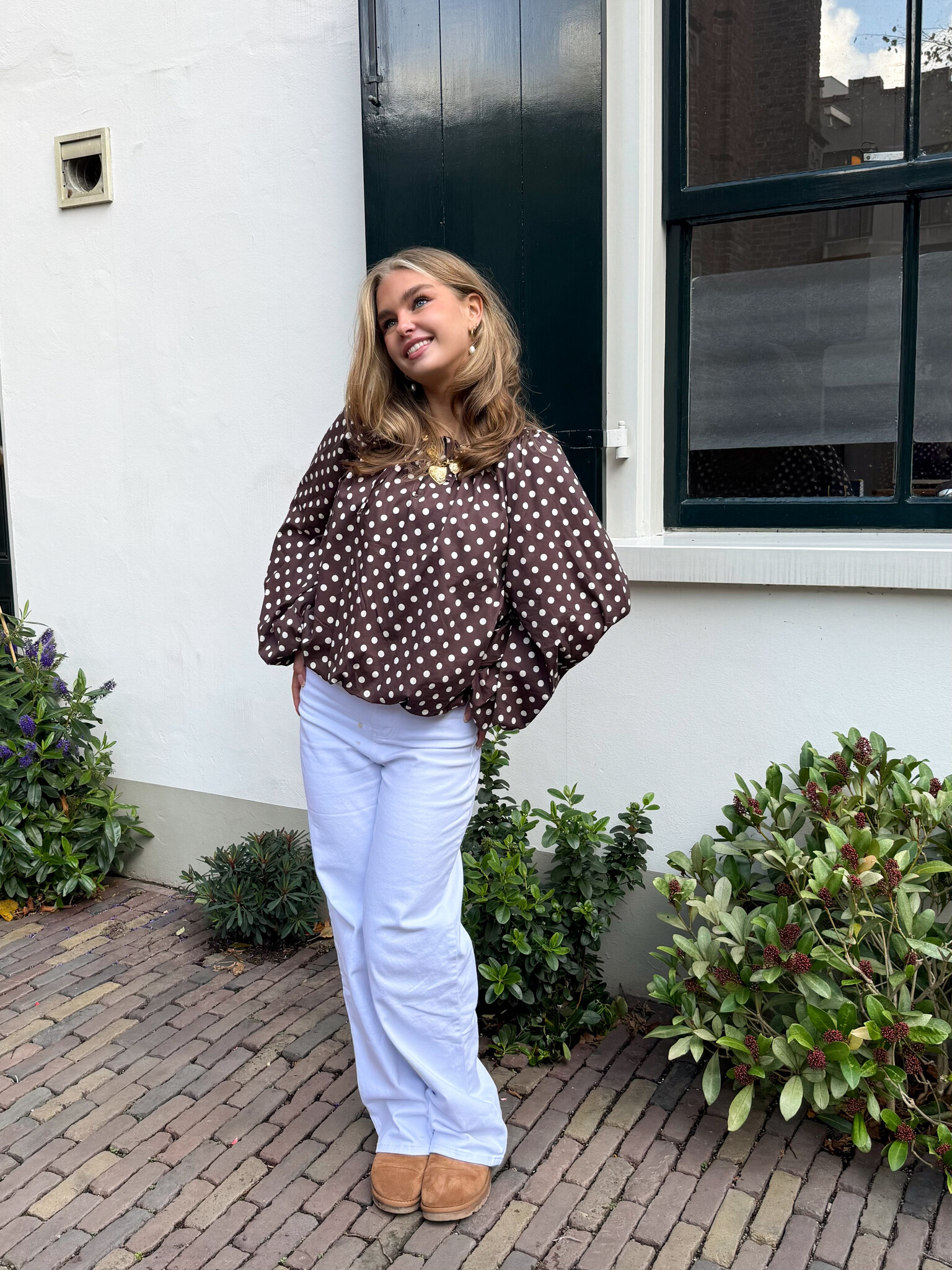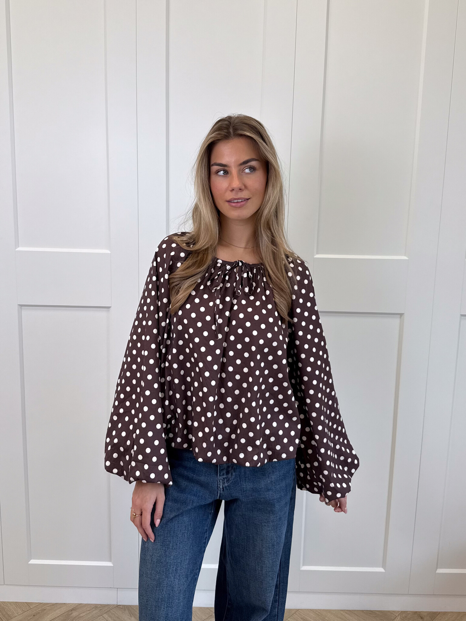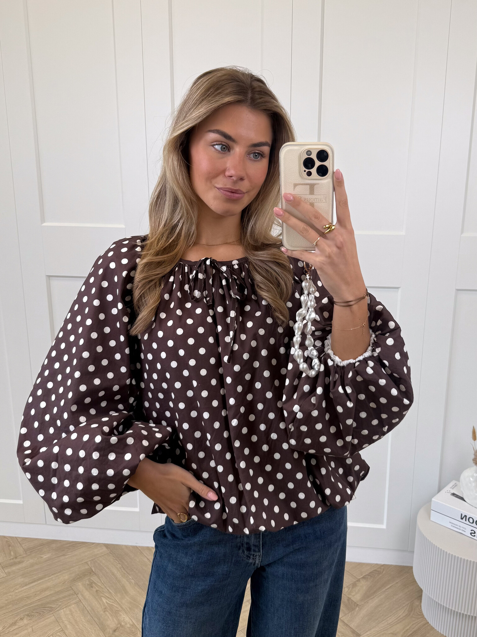 Deze top in bruine kleur met beige polkadots/ witte stippen is een elegante en vrouwelijke toevoeging aan je garderobe. Het getailleerde model en de lange pofmouwen en hoge boothals met strikje geven een speelse uitstraling. Perfect te combineren met een jeans voor een casual look of een rok voor een nettere outfit.
