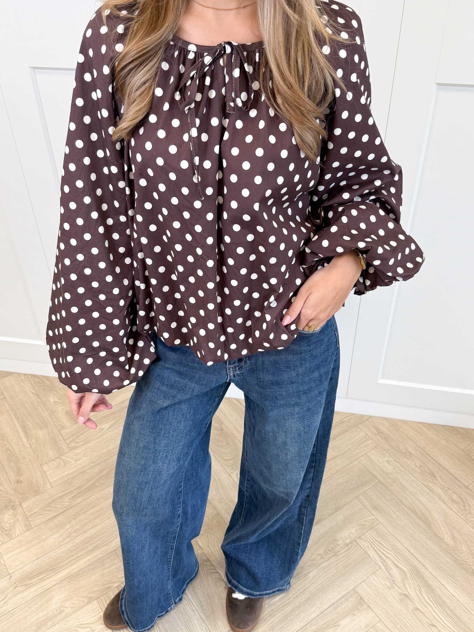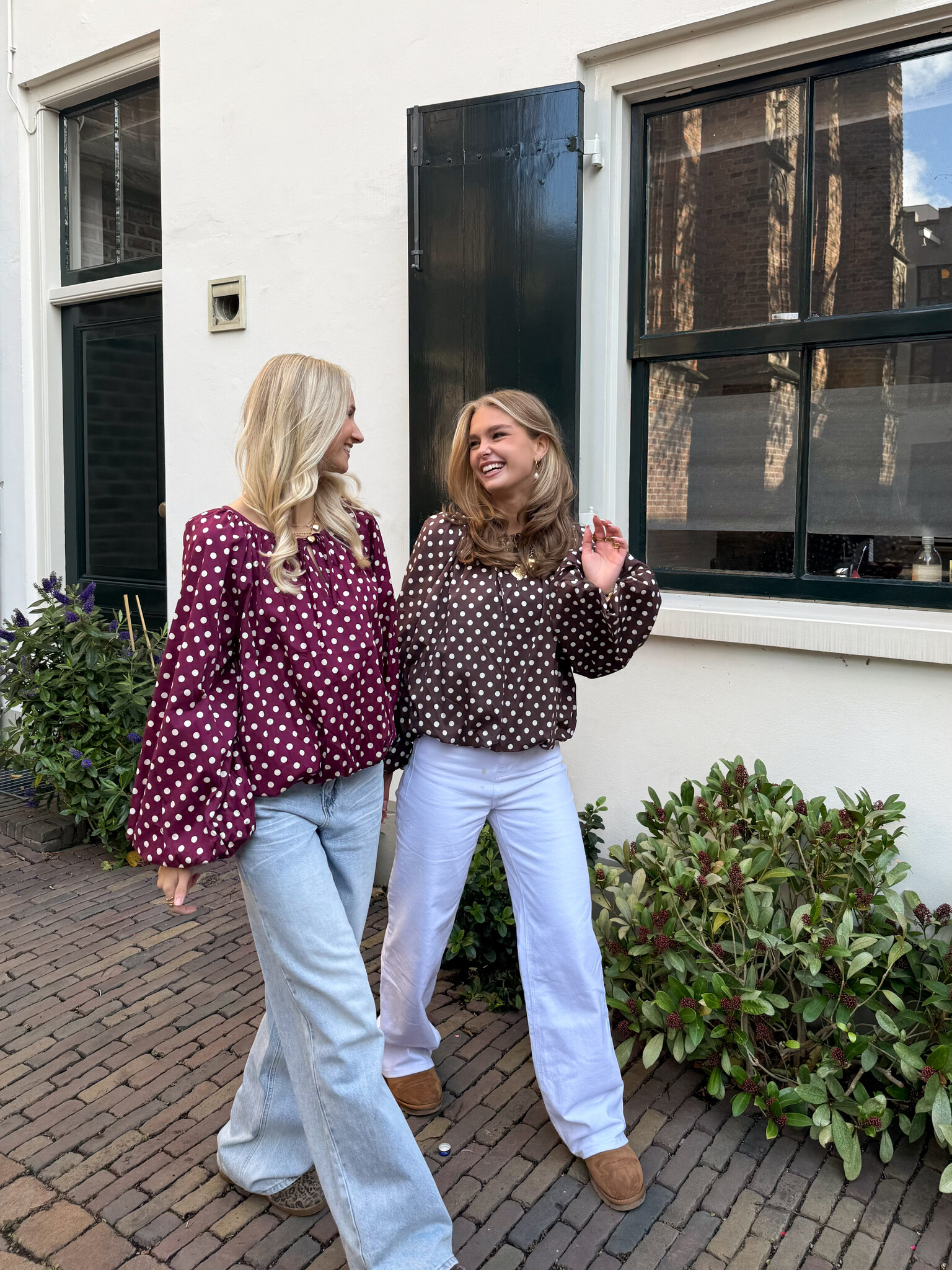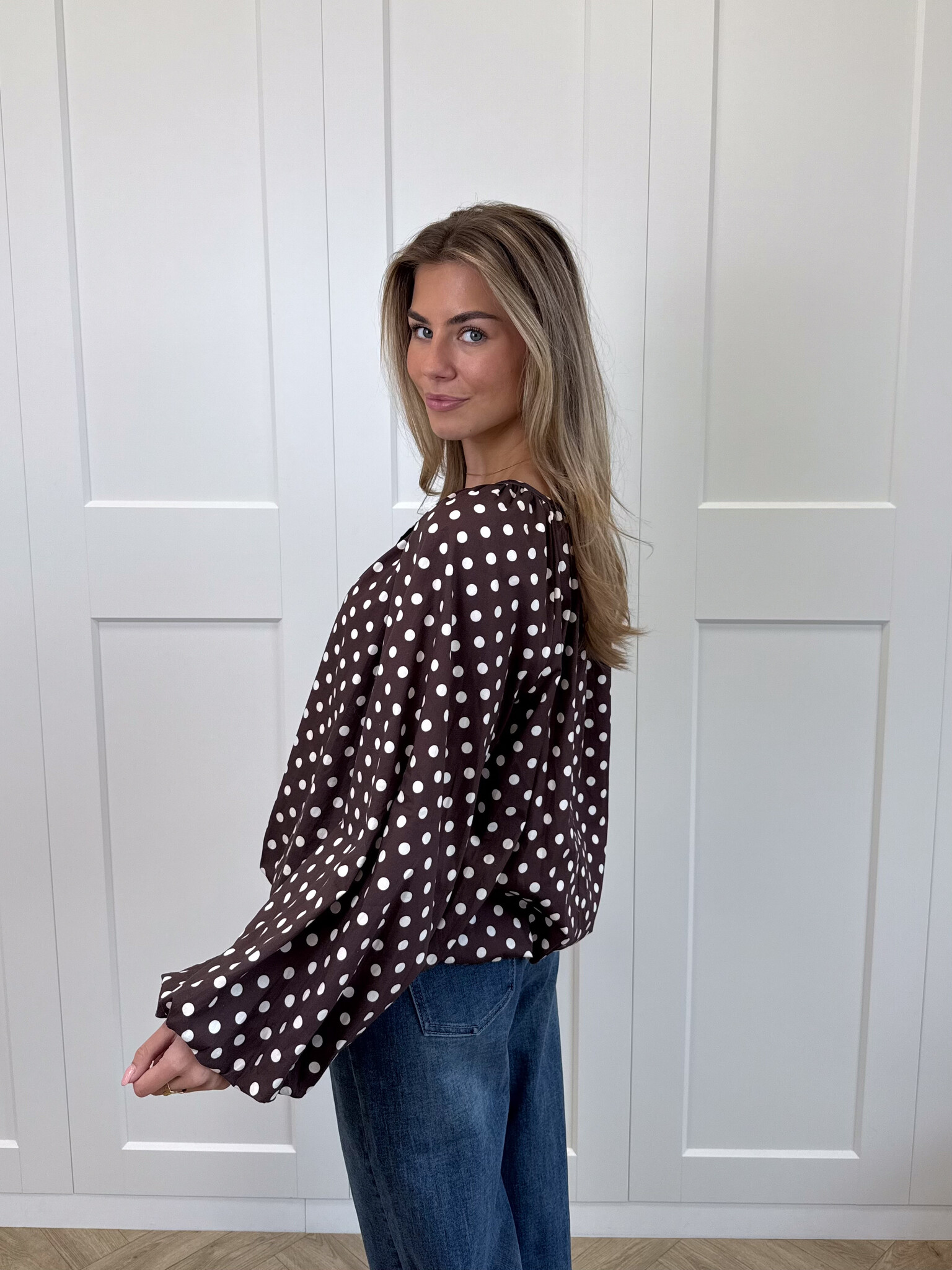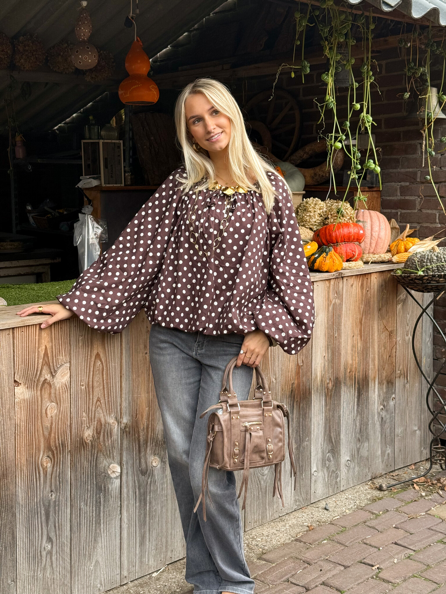 Deze top in bruine kleur met beige polkadots/ witte stippen is een elegante en vrouwelijke toevoeging aan je garderobe. Het getailleerde model en de lange pofmouwen en hoge boothals met strikje geven een speelse uitstraling. Perfect te combineren met een jeans voor een casual look of een rok voor een nettere outfit.