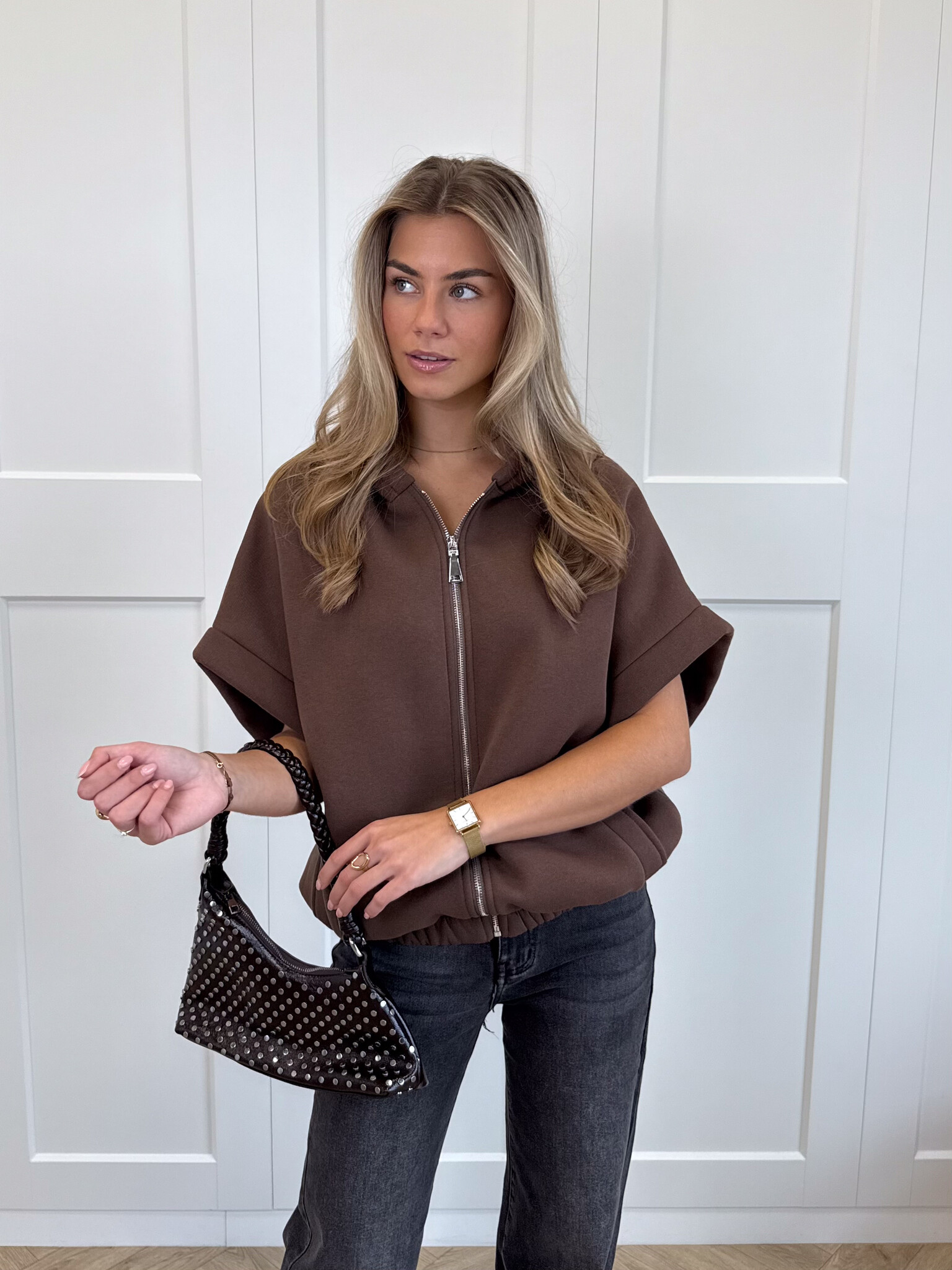 Meet je nieuwe go-to voor relaxte days! Dit bruine korte-mouwen zippervest is oversized voor een comfy fit en heeft een zachte, warme stof die je heerlijk omhult. De capuchon voegt een casual, sporty touch toe, terwijl de handige zakken perfect zijn voor je telefoon of lipgloss. Dankzij de korte mouwen kun je het vest makkelijk layeren over tops of hoodies en het is ideaal voor alles van festivals tot lazy weekend vibes. Een must-have item dat stijl en comfort moeiteloos combineert en je outfit instant een chill, trendy vibe geeft.