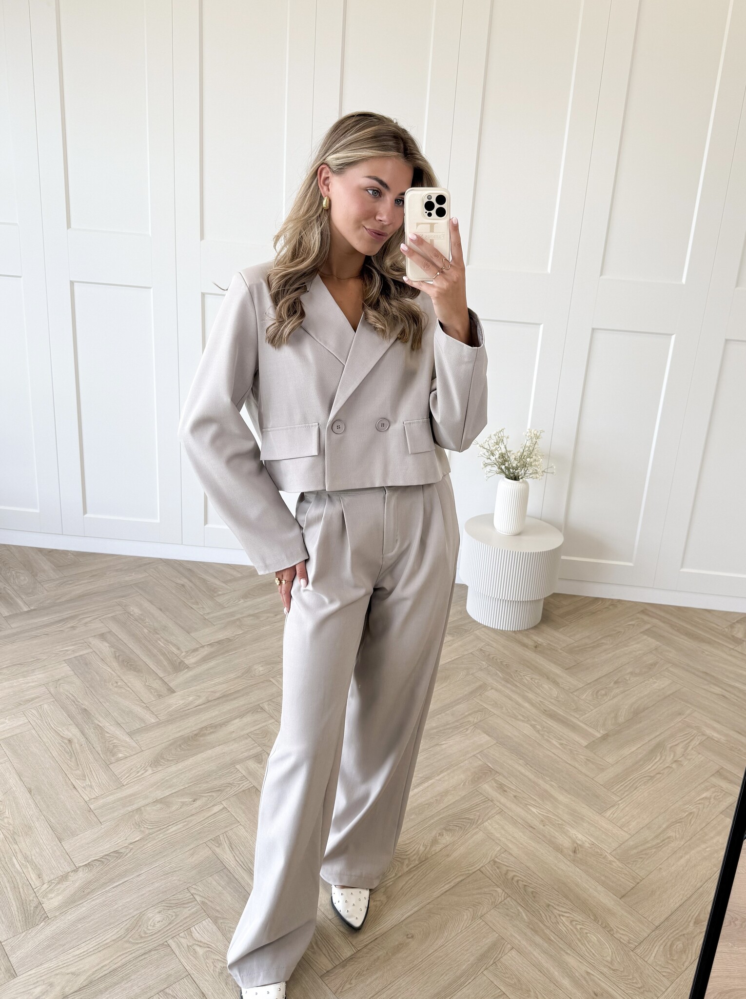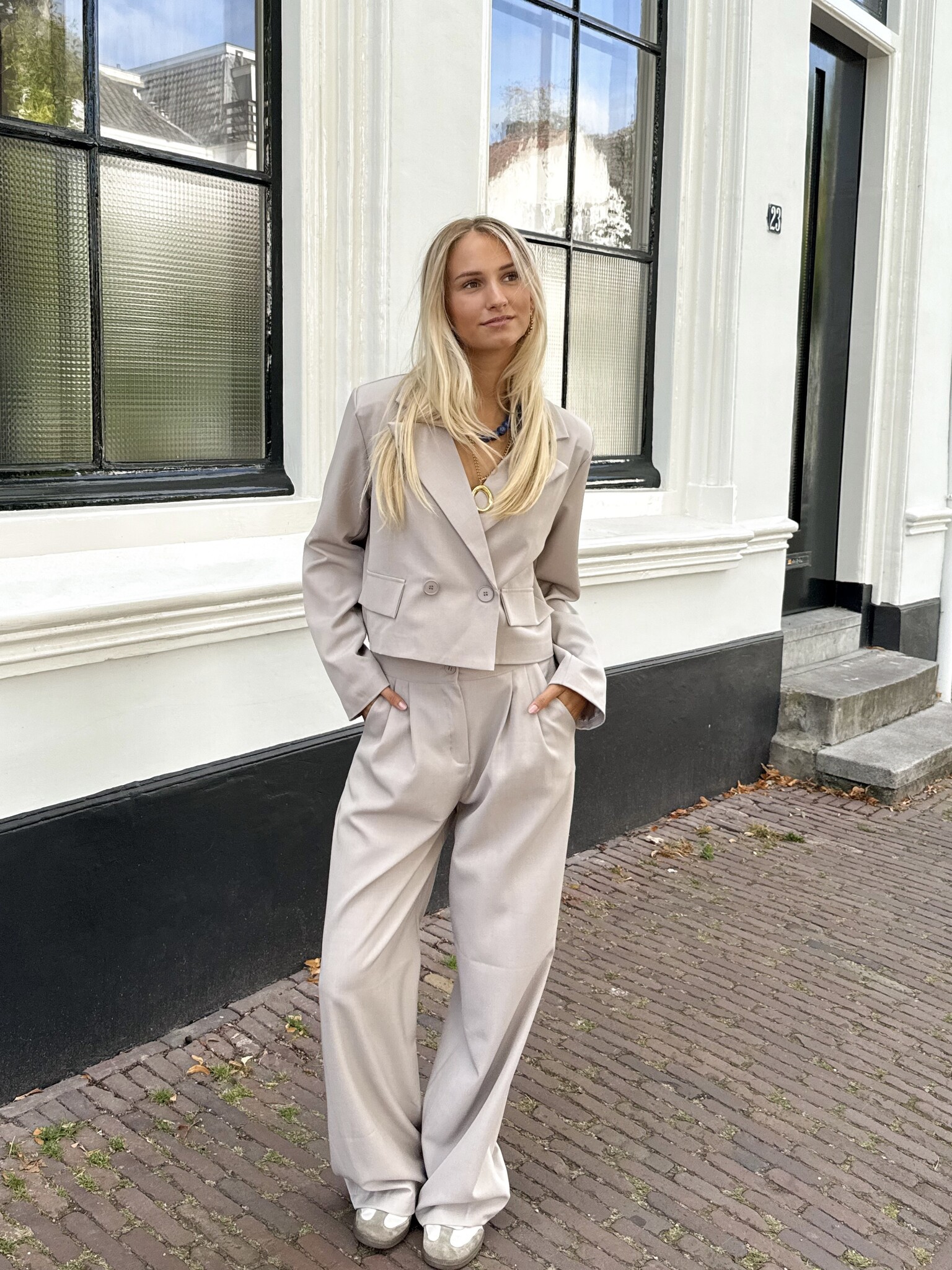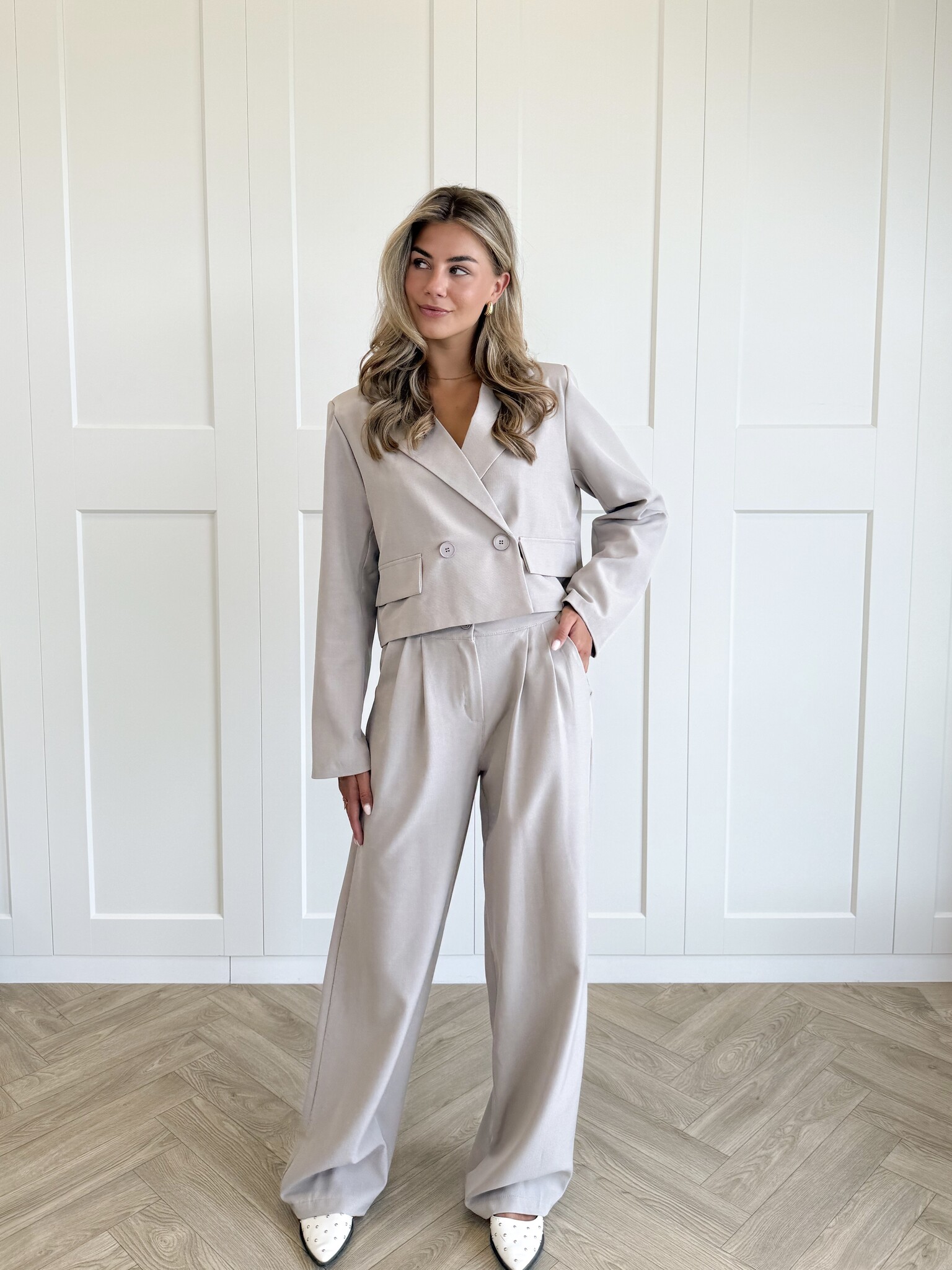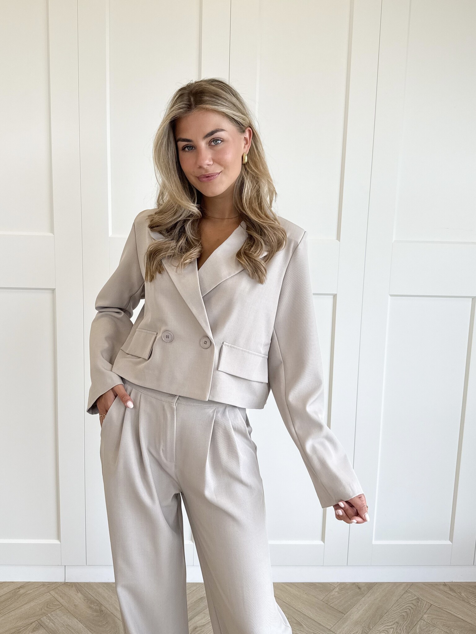 Maak kennis met je nieuwe statement set! Deze taupe co-ord bestaat uit een oversized, cropped blazer en een pantalon met elastische band, allemaal gemaakt van soepel, niet kreukend materiaal. De one size pasvorm valt relaxed en chic, perfect voor werk, events of een stylish street look. Combineer met hakken voor elegant of sneakers voor casual – deze set kan het allemaal.