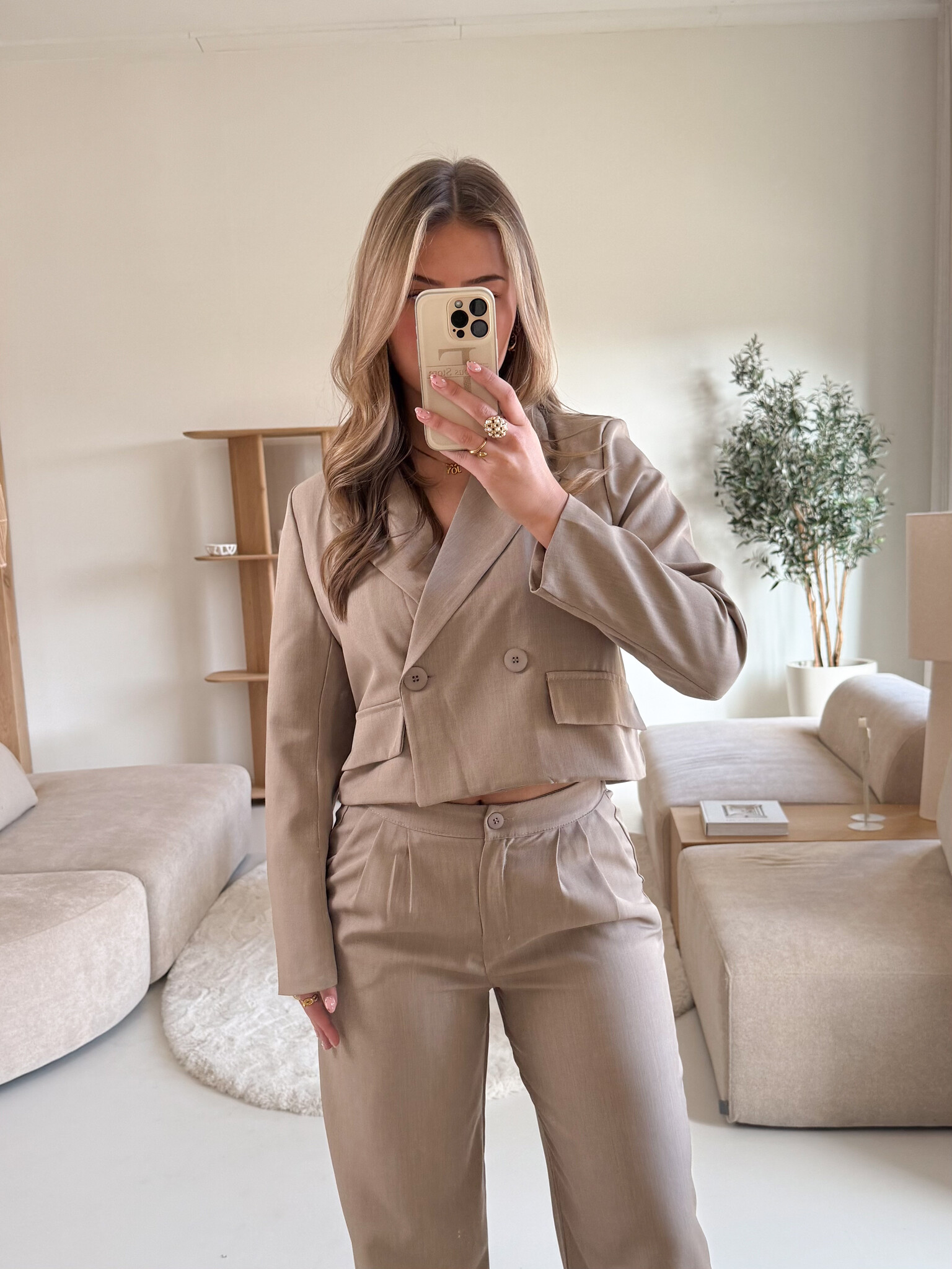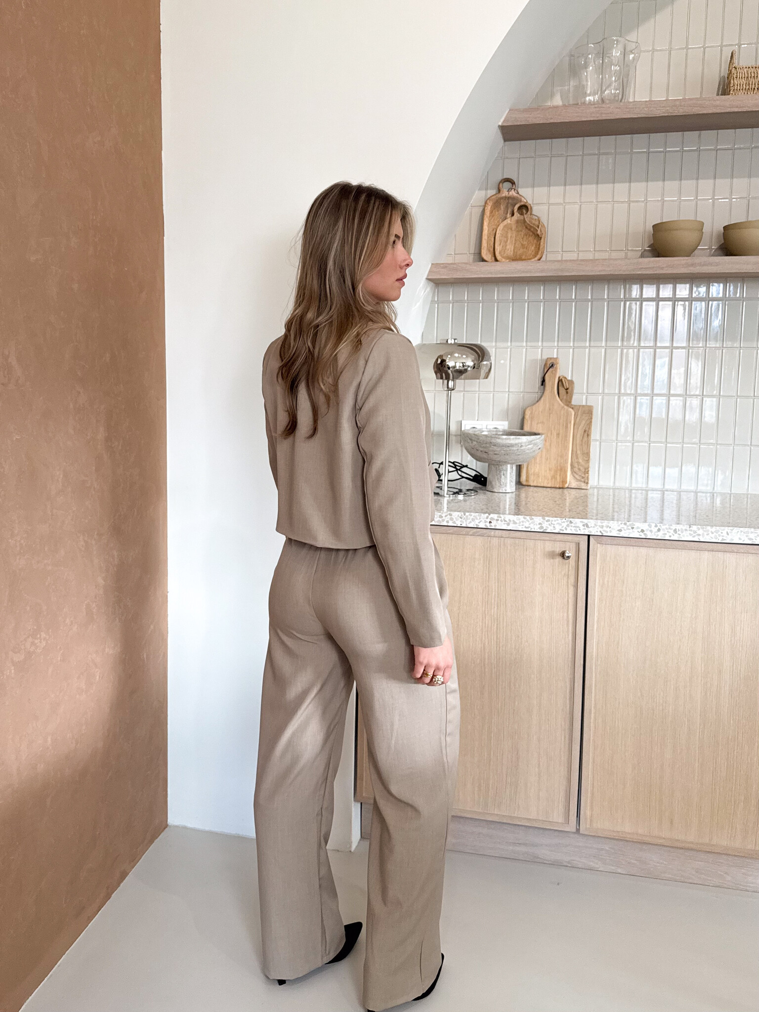 Maak kennis met je nieuwe statement set! Deze taupe co-ord bestaat uit een oversized, cropped blazer en een pantalon met elastische band, allemaal gemaakt van soepel, niet kreukend materiaal. De one size pasvorm valt relaxed en chic, perfect voor werk, events of een stylish street look. Combineer met hakken voor elegant of sneakers voor casual. Deze set kan het allemaal.