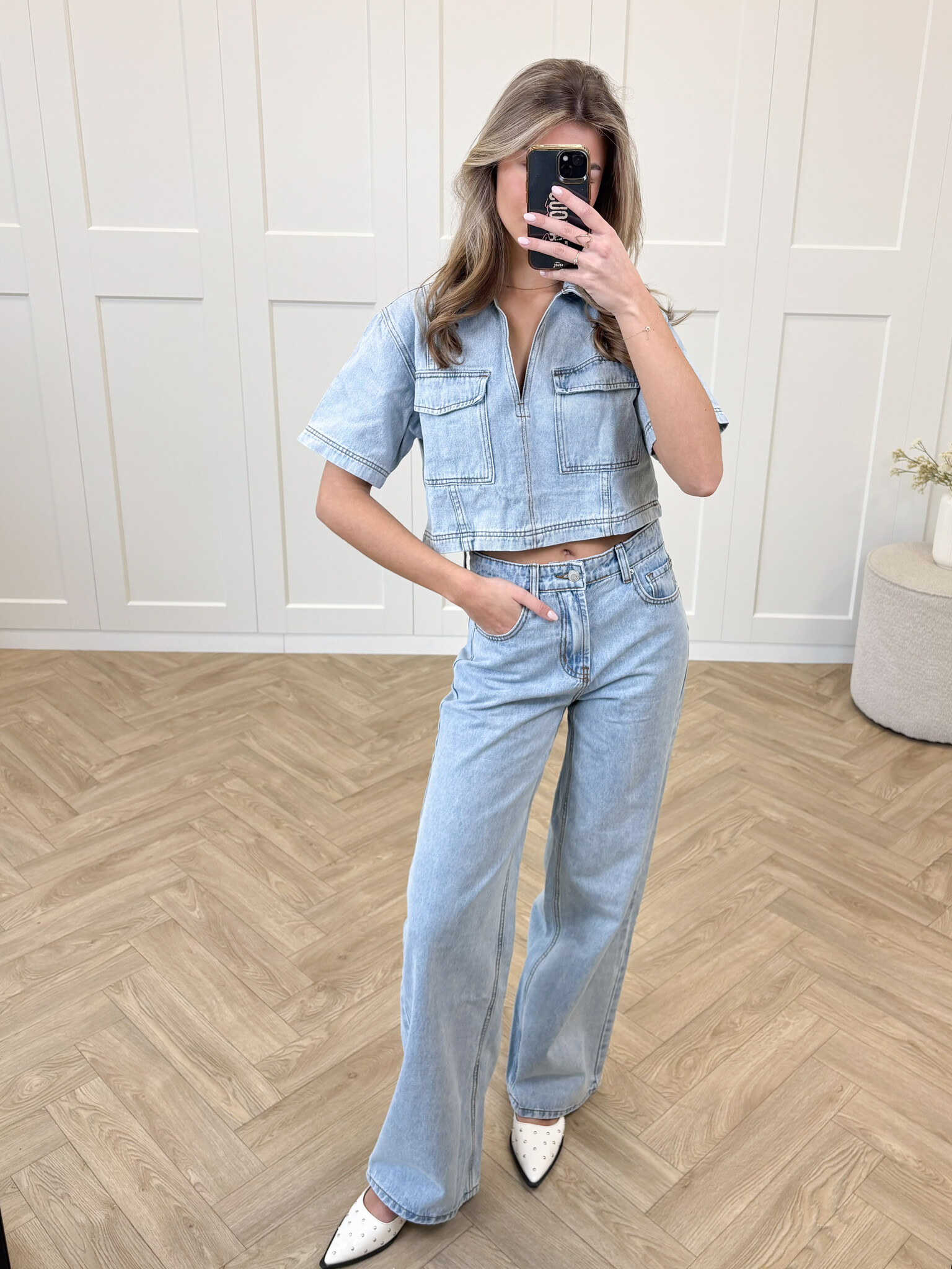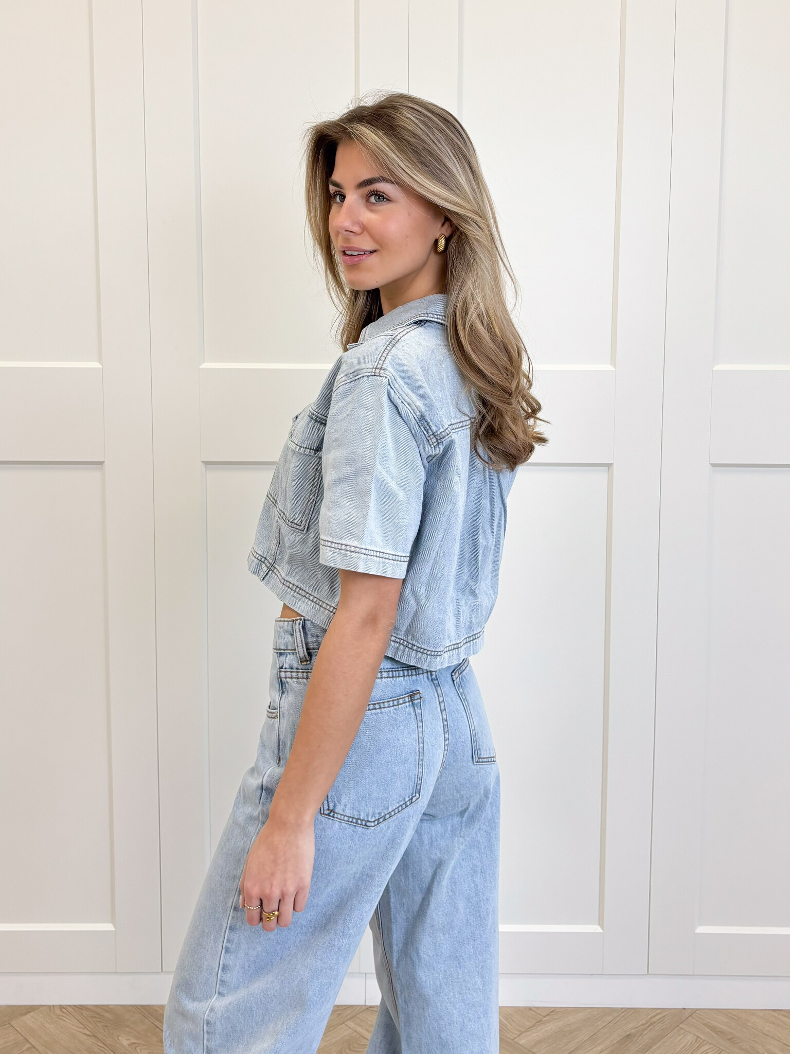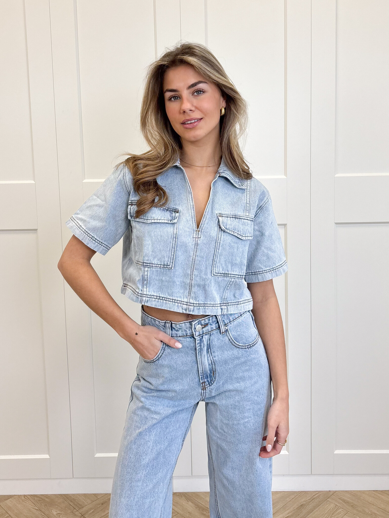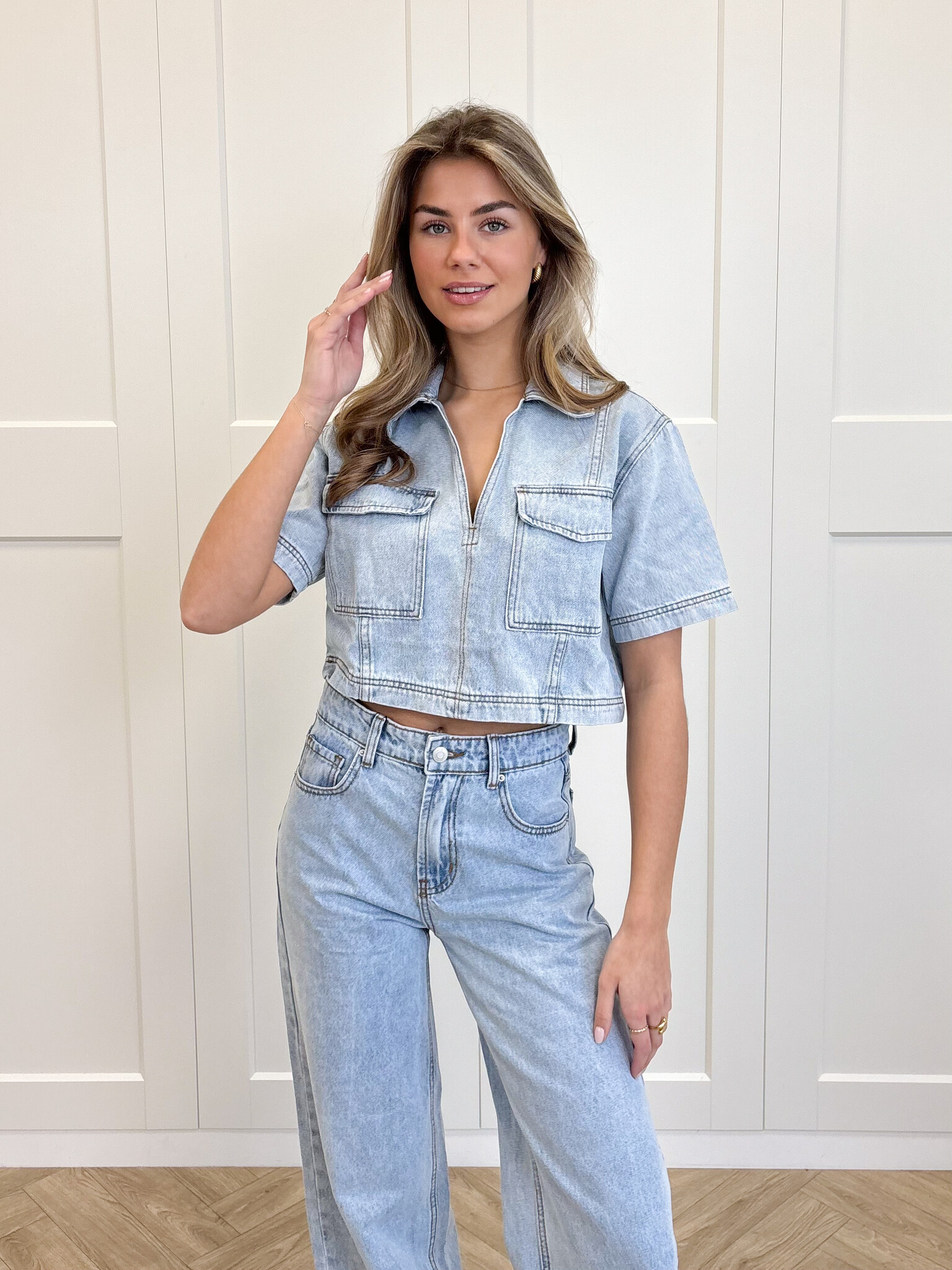 Deze top is gemaakt van jeans stof. De top heeft een cropped model en valt ruim. Denim on Denim is helemaal trendy. Je kan deze top goed combineren met onze Lina jeans. Te leuk om te dragen naar een festival!