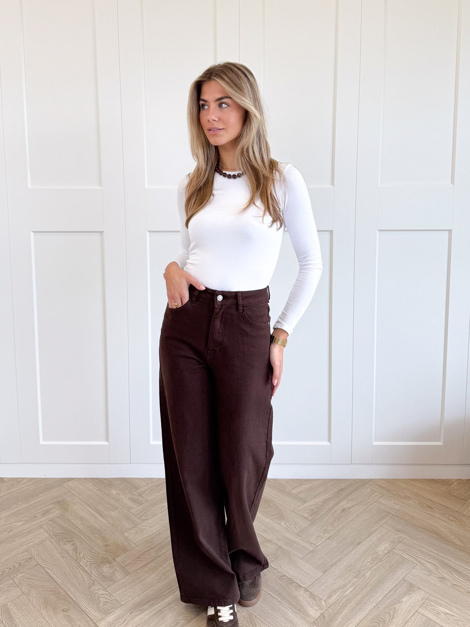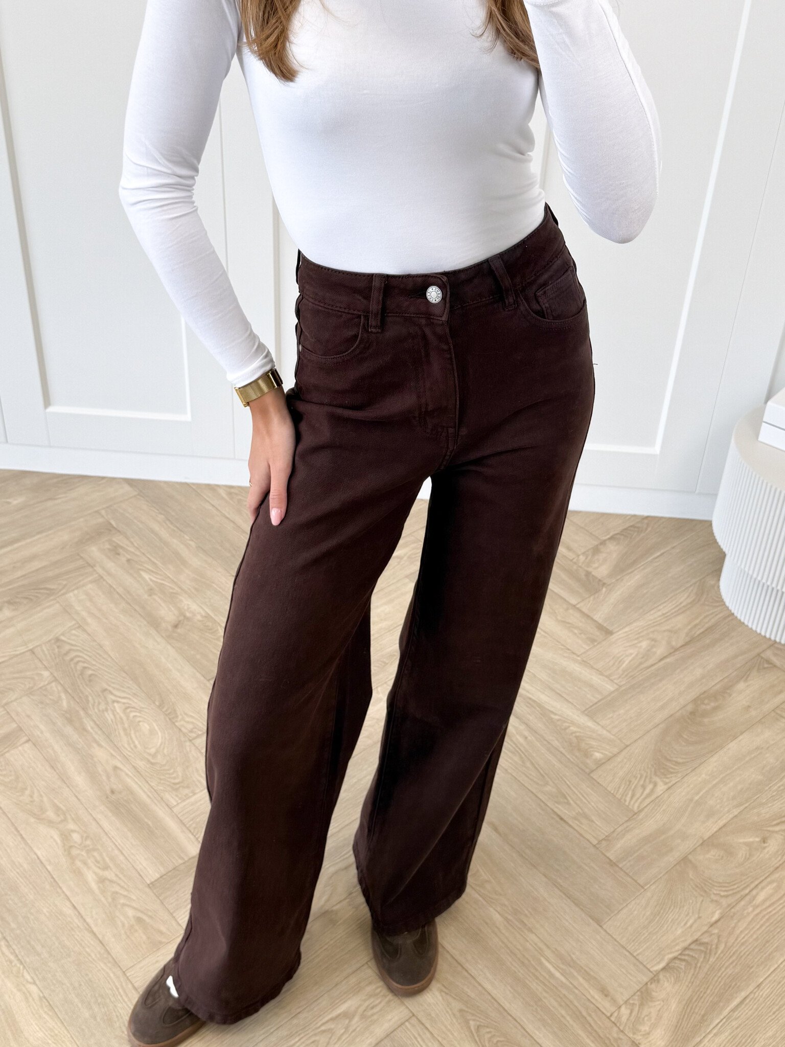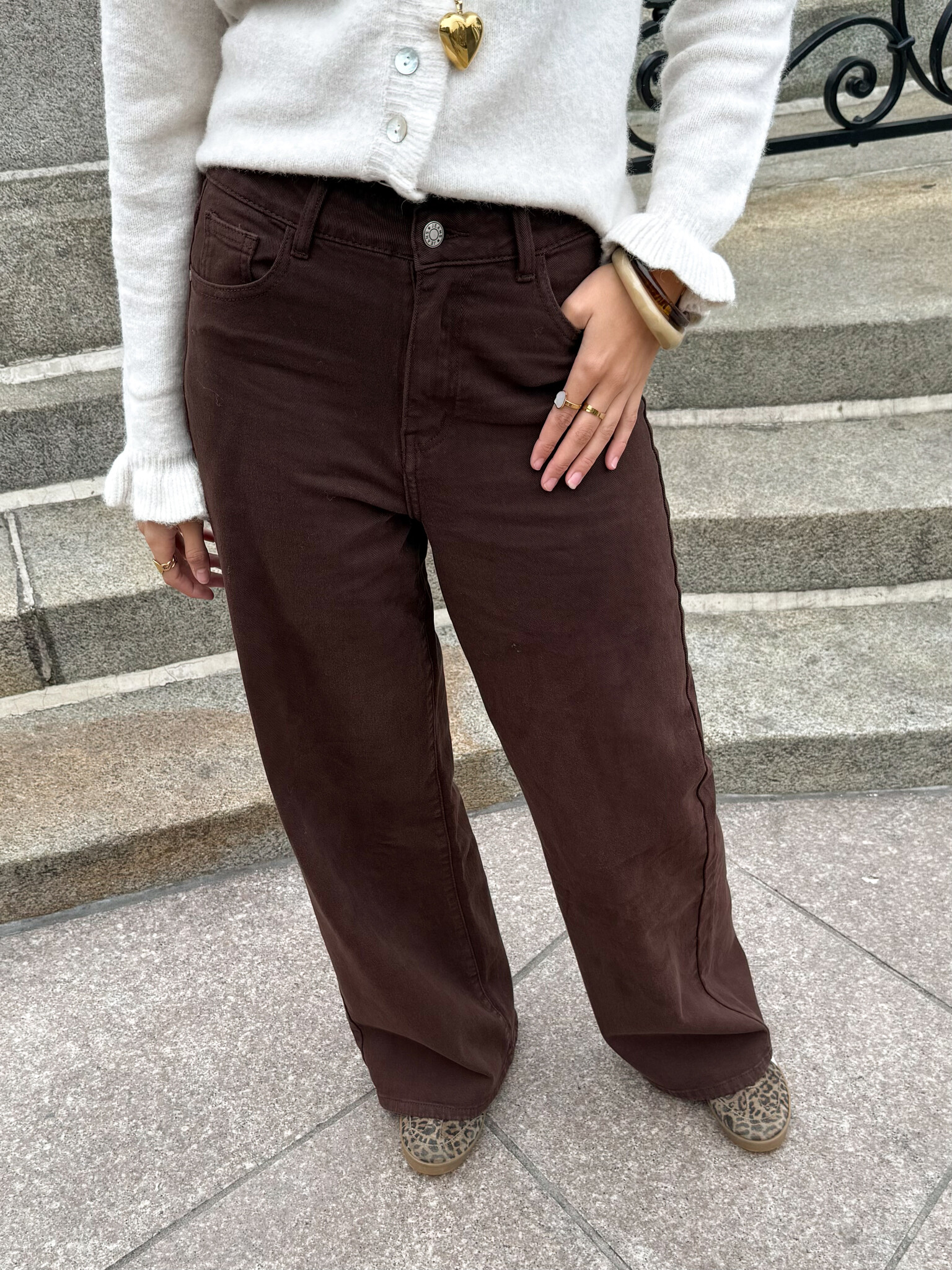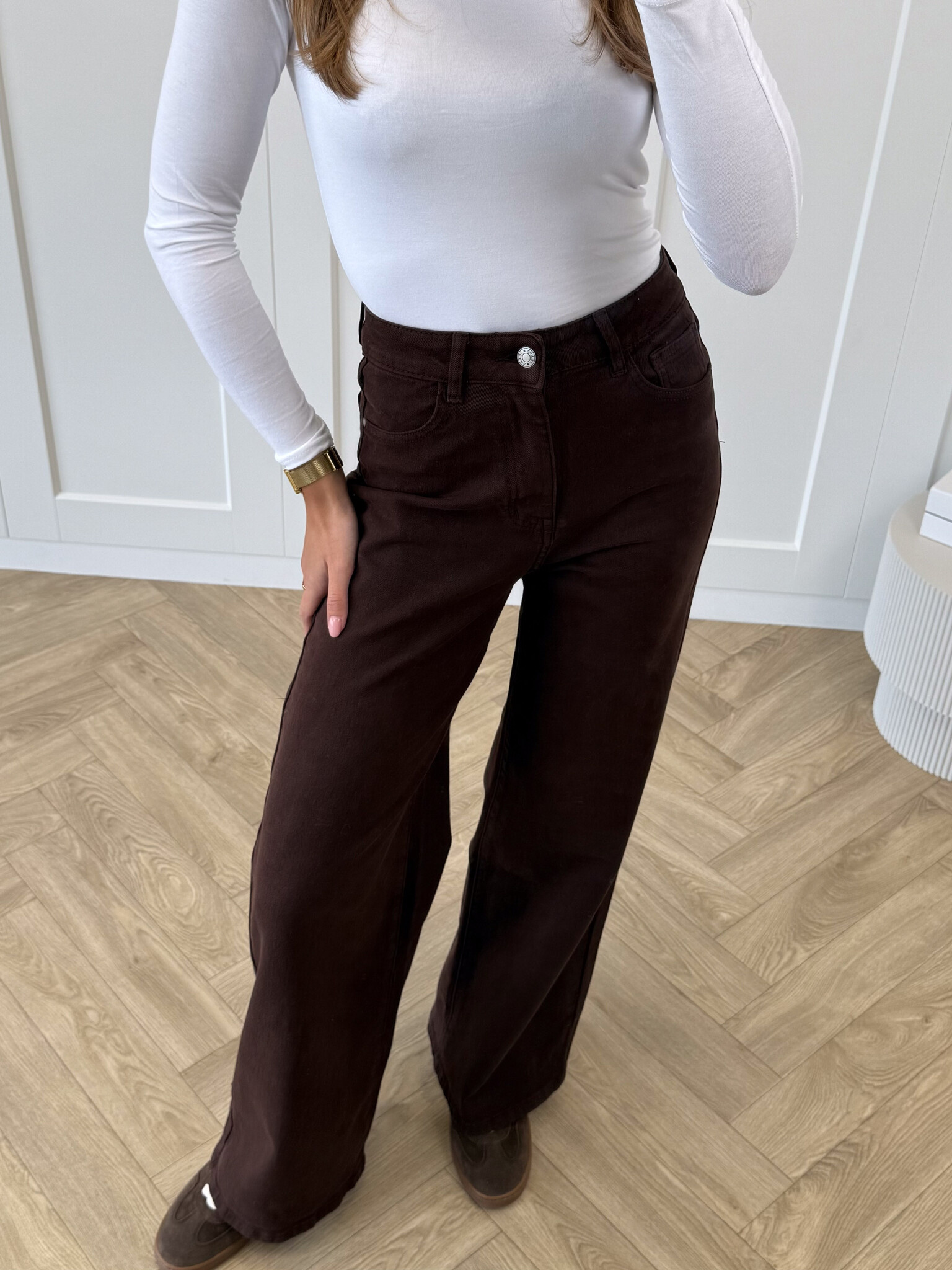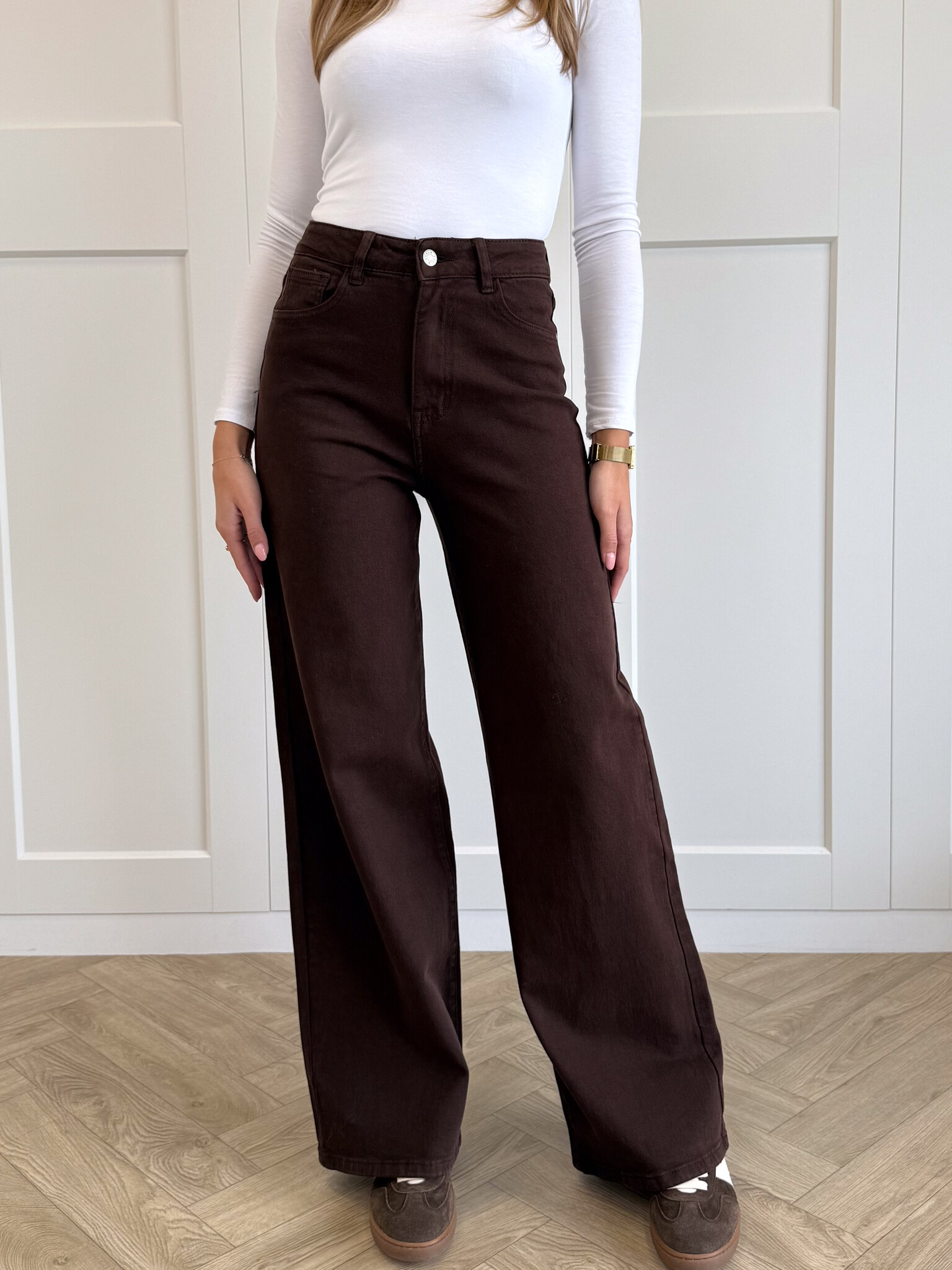 Deze bruine jeans is de perfecte combinatie van comfort en stijl. Dankzij de stretchy stof sluit hij mooi aan zonder strak te zitten. Ideaal voor lange dagen of een avondje uit. De warme bruine kleur geeft een trendy twist aan je denimcollectie en laat zich makkelijk combineren met lichte en donkere tinten. Of je nu gaat voor een casual look met een oversized trui en sneakers, of een chique vibe met hakken. Deze jeans past bij elke mood! De fijne pasvorm en soepele stof maken hem een absolute favoriet die je het liefst elke dag draagt.