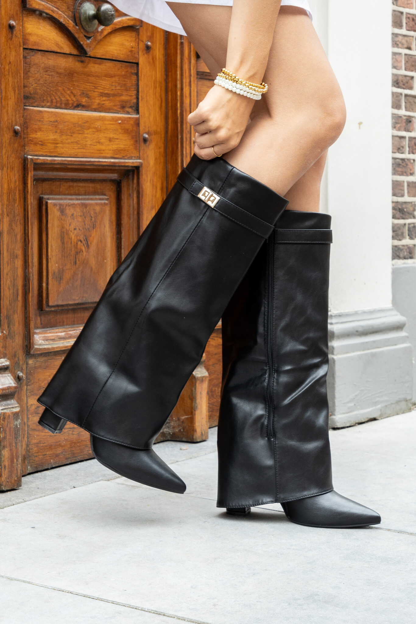 Meiden, dit is ‘m: onze zwarte laars in leer-look met coole overlap en een chique gouden detail op de schacht. De vouwen in het bovenwerk geven ‘m die nonchalante, trendy vibe waar je naar zoekt, terwijl het gouden accent net wat extra luxe toevoegt.
