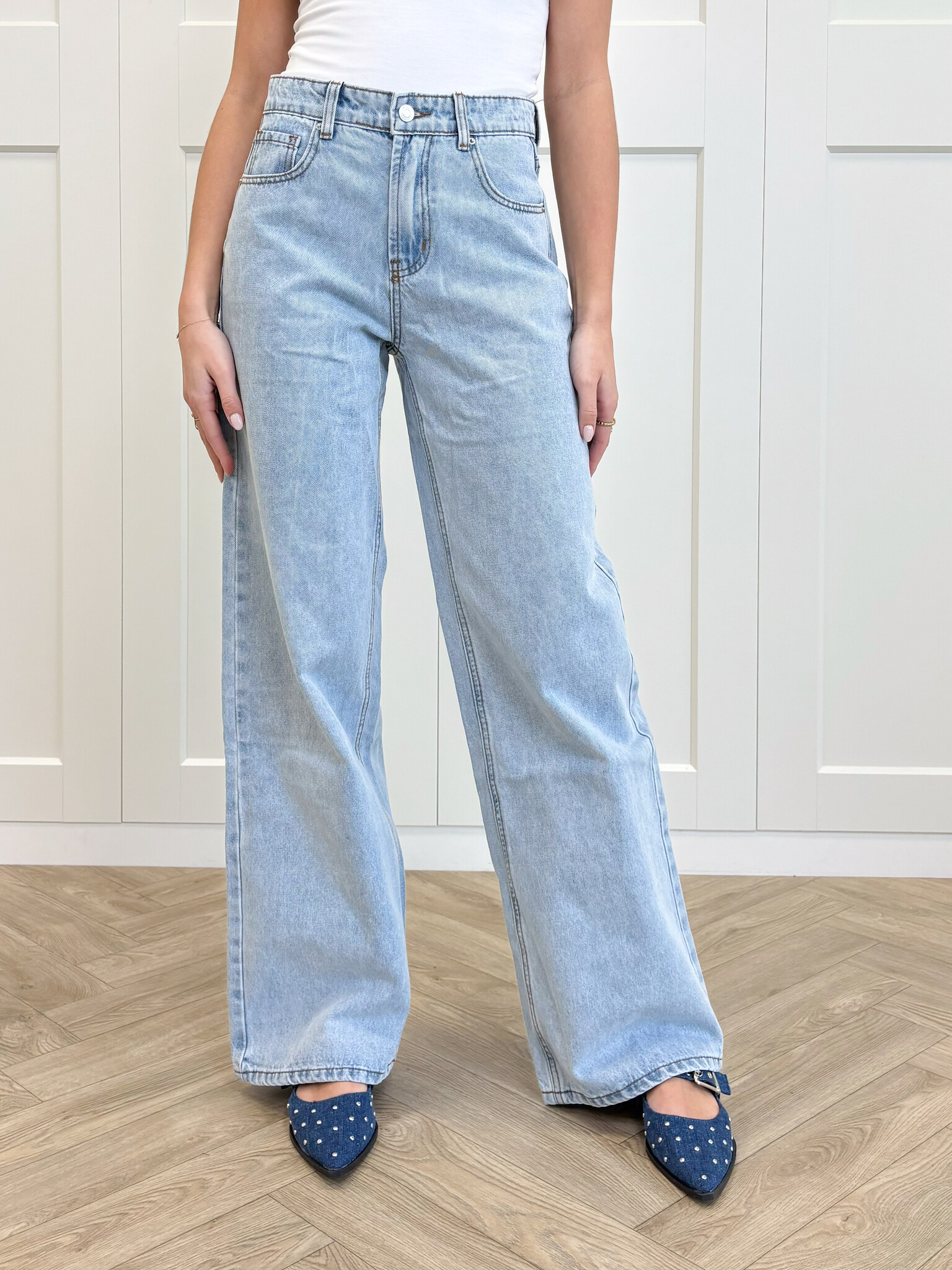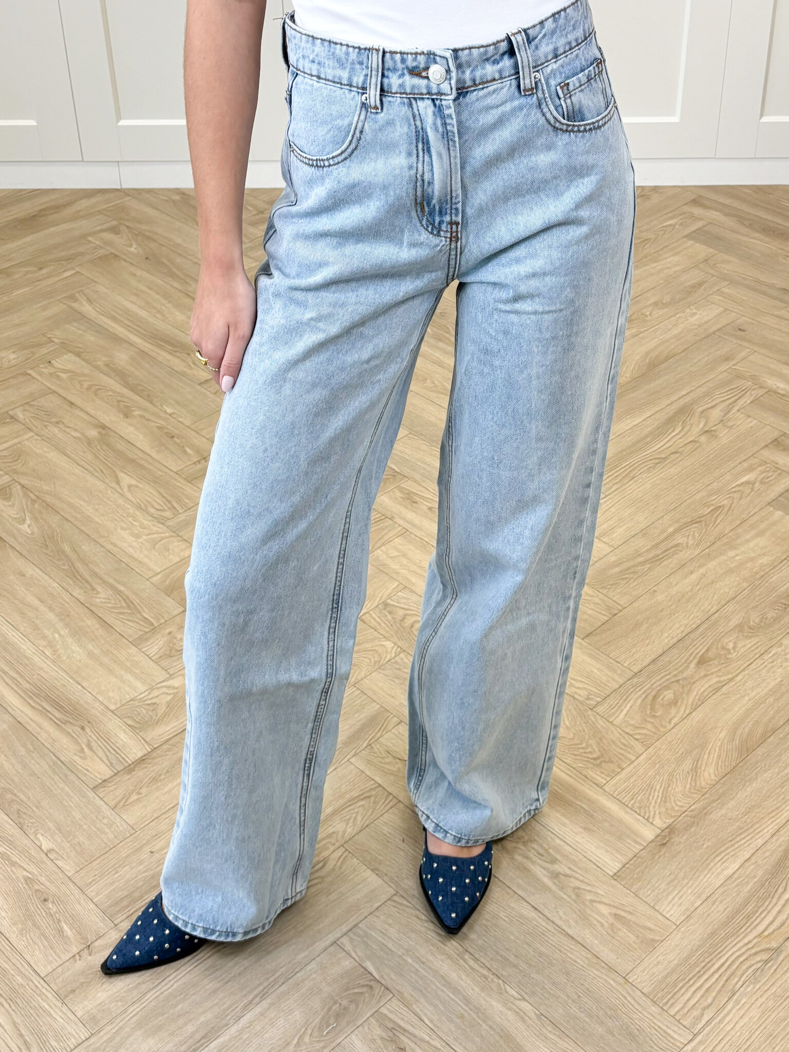 Deze tall jeans heeft een wide leg pasvorm en een lichtgewassen kleur, wat zorgt voor een casual look. Het model valt licht baggy, waardoor hij extra comfortabel zit, en de mid-waist taille maakt hem perfect voor elke dag. Combineer met onze Lina top voor de perfecte set!