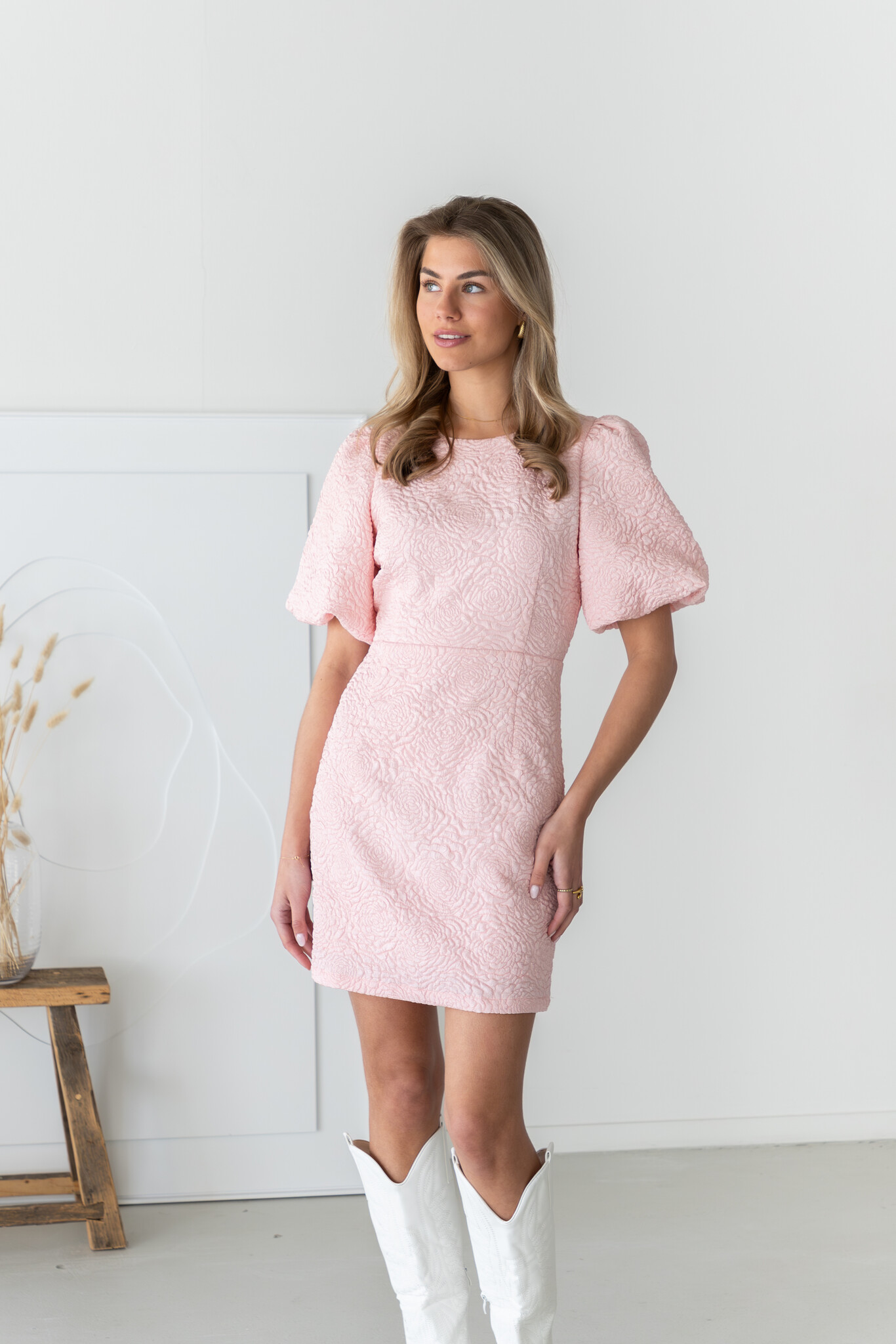 SPRING INTO STYLE - De Mira roze jurk is gemaakt van een stof met bloemen textuur en heeft pofmouwtjes. De achterkant is voorzien van een ritssluiting. De perfecte pink dress voor een avondje uit, een diner of als diploma, gala outfit.