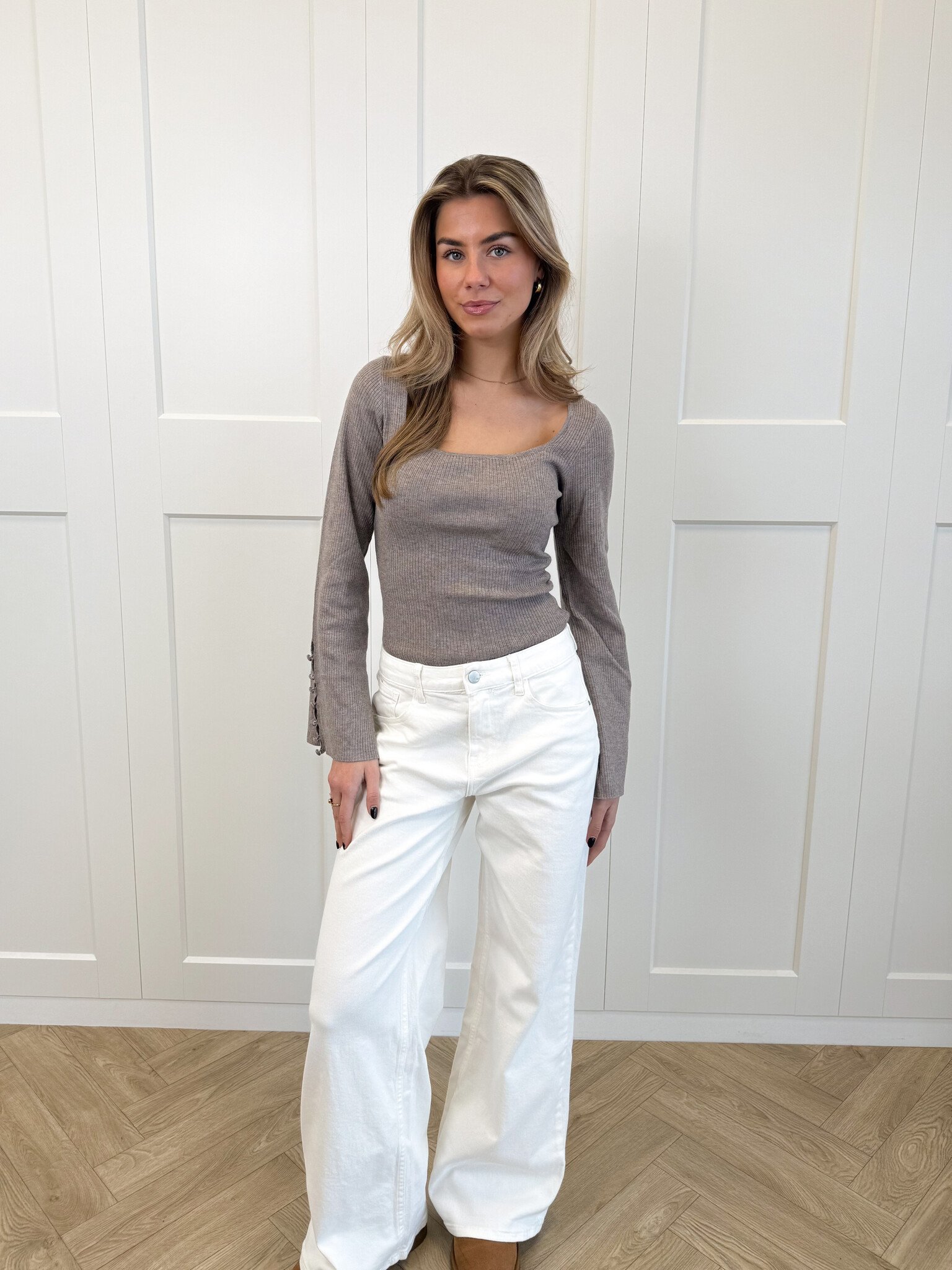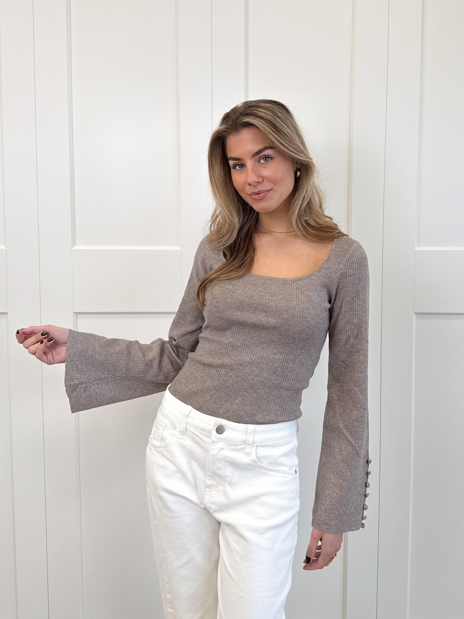 Deze top is een echte must-have voor je garderobe. De vierkante hals zorgt voor een vrouwelijke en trendy uitstraling, terwijl de zachte gebreide stof heerlijk comfortabel aanvoelt. De lange flair mouwen geven een speelse en elegante look, met subtiele knoopjes bij de mouwen als extra detail. Makkelijk te combineren met een jeans, rok of pantalon en perfect voor zowel casual als meer geklede outfits. Draag ‘m naar school, werk, een koffiedate of een dagje shoppen. Een veelzijdig item dat comfort en stijl samenbrengt en je outfit een girly, fashionable touch geeft.