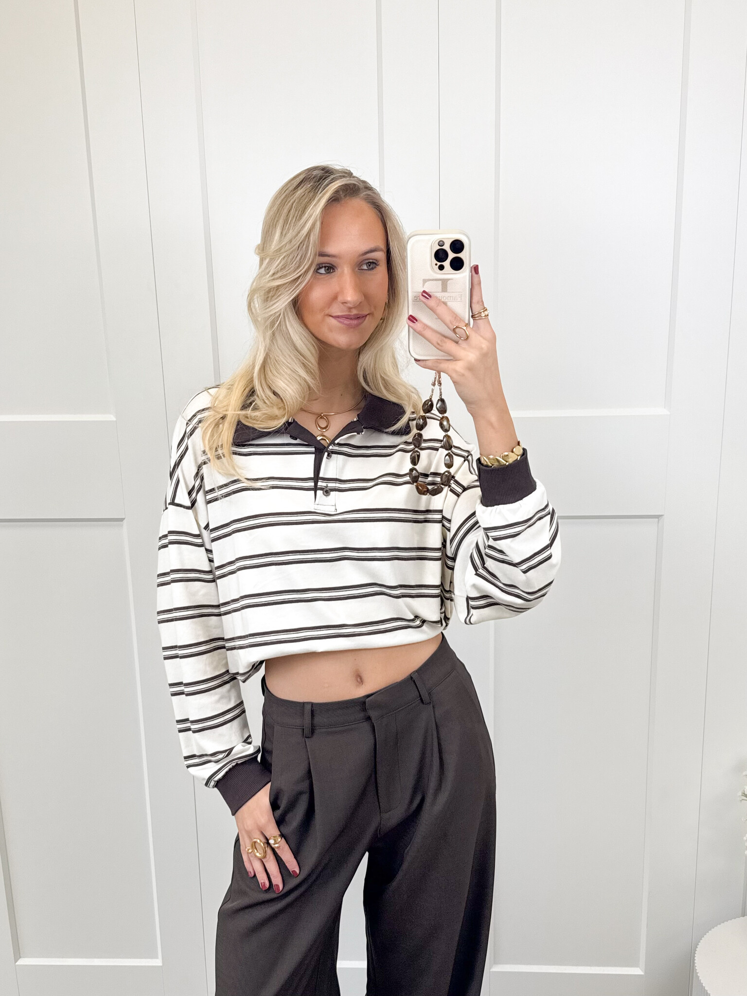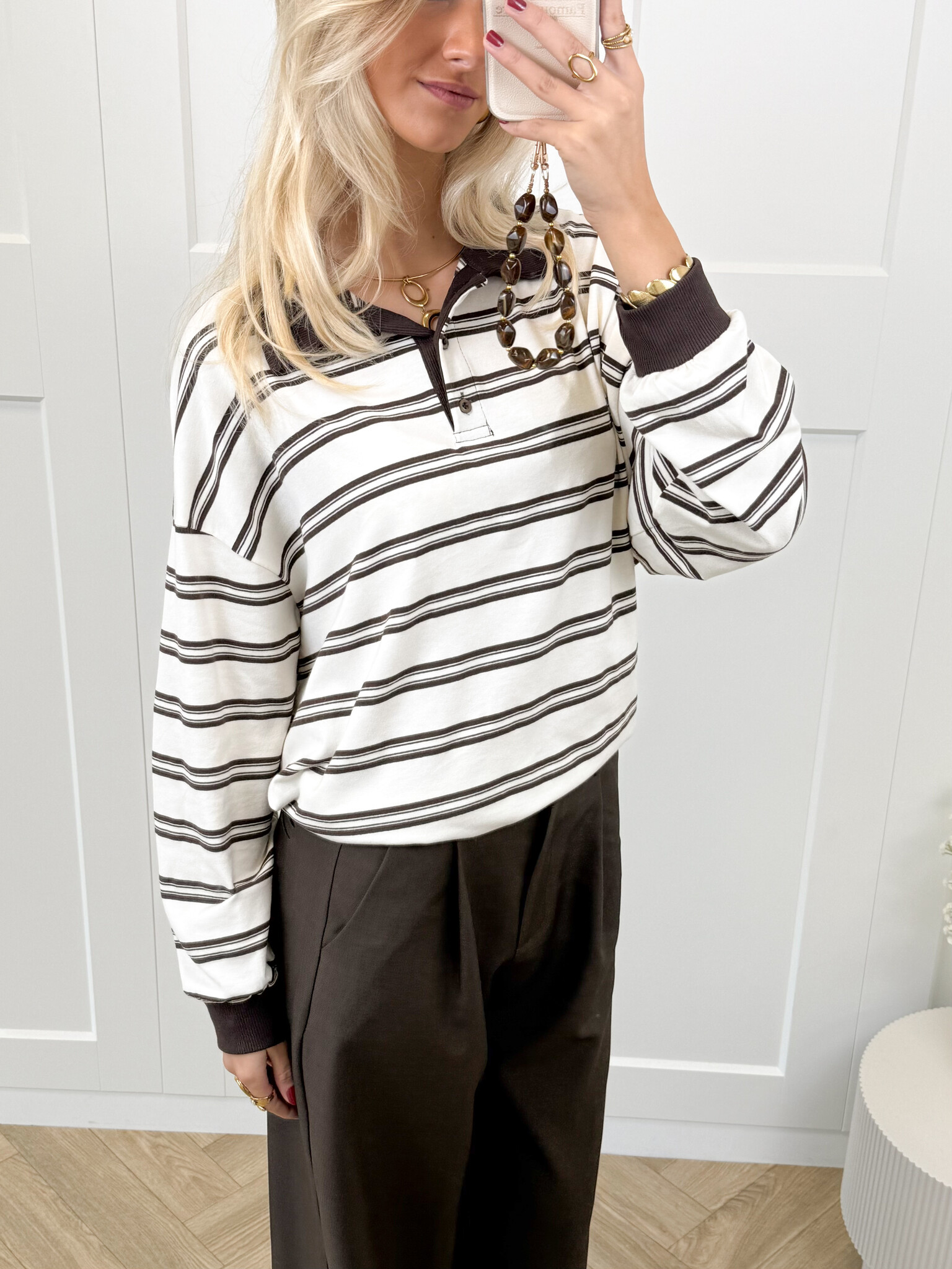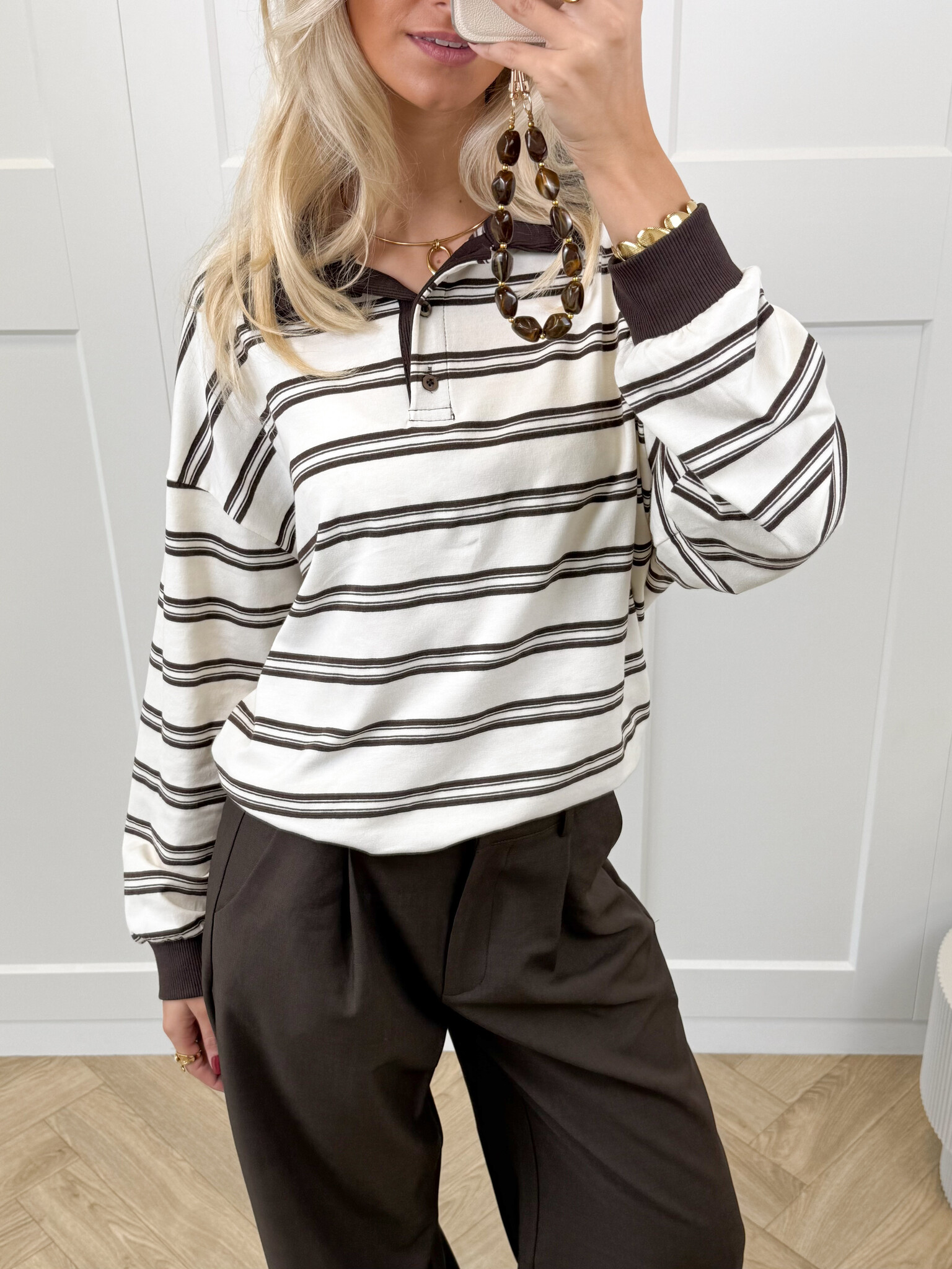 Deze oversized polo sweater is dé mix van comfort en stijl. De losse pasvorm geeft een relaxte vibe en zit heerlijk de hele dag door. De klassieke kraag met knoopjes bij de hals zorgt voor een speelse twist, waardoor de look net wat chiquer oogt zonder stijf te worden. De strepen geven een frisse, modieuze uitstraling die makkelijk te combineren is met een jeans, leren broek of pantalon. Draag ‘m los voor een nonchalante look of half ingestopt voor extra shape. Ideaal voor dagen waarop je comfy wilt zijn, maar er toch fashionable uit wilt zien. Perfect voor school, een dagje shoppen of een casual lunchdate met vriendinnen.