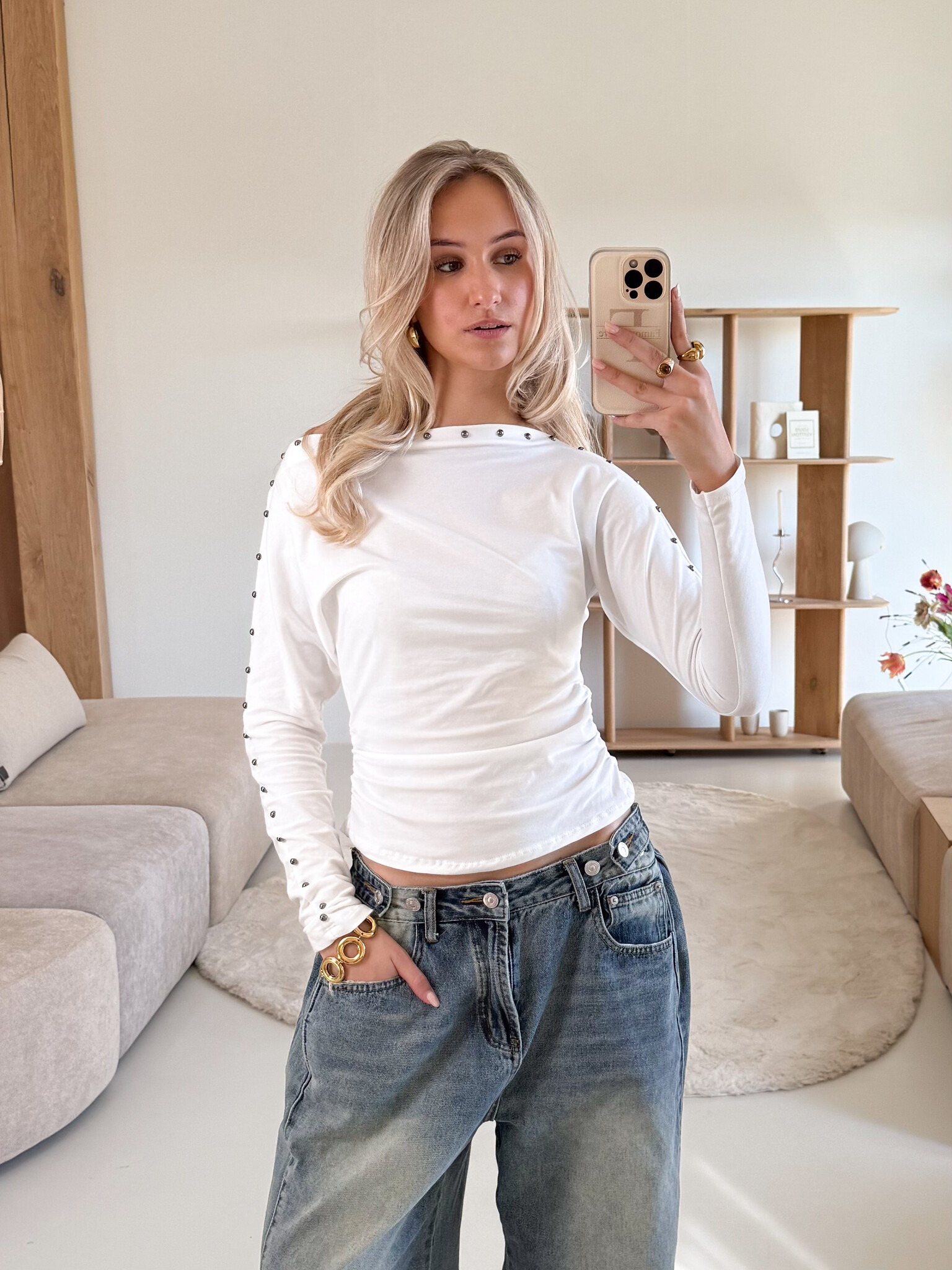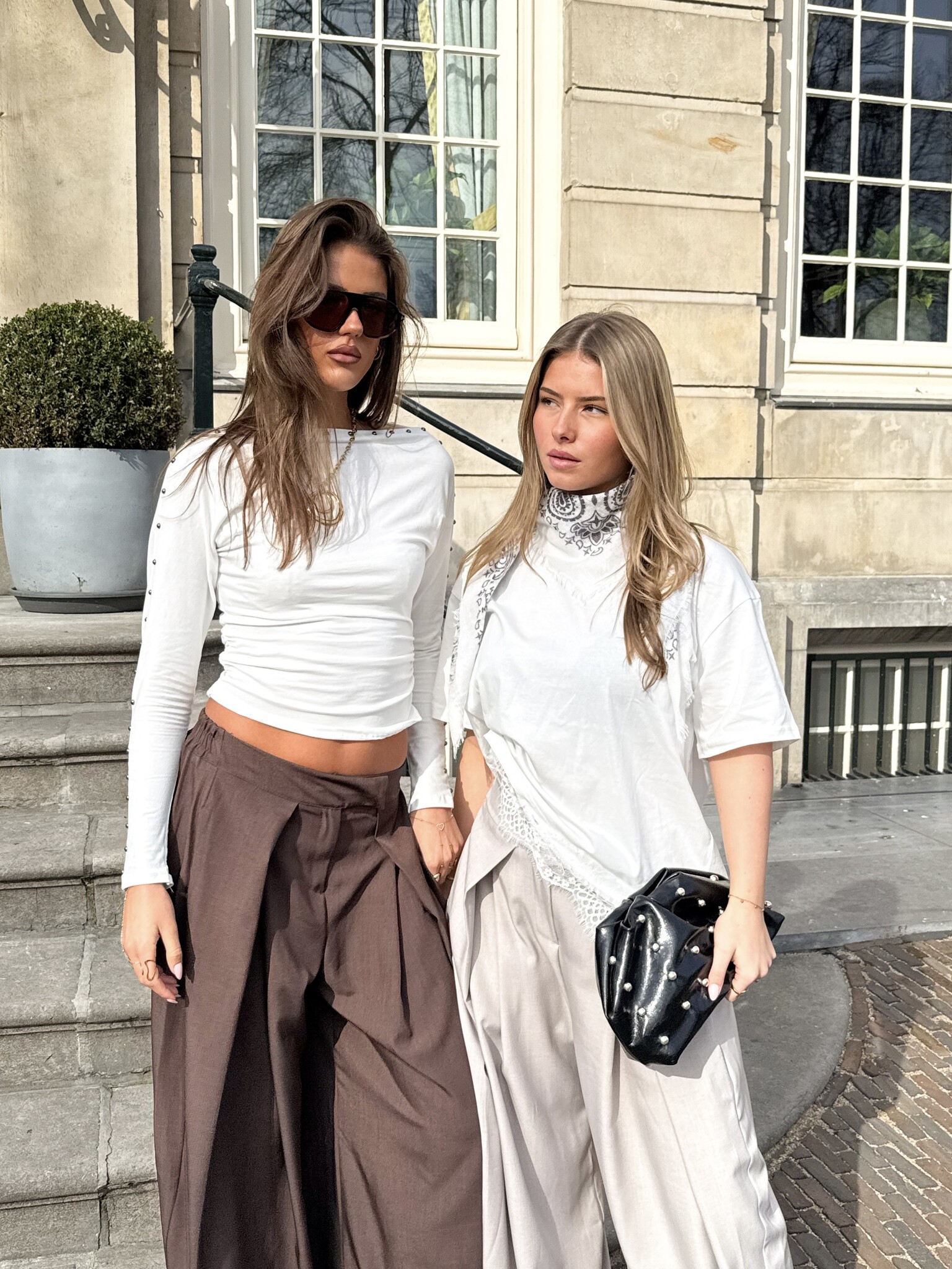 Deze getailleerde lange mouwen top is de perfecte combinatie van classy en edgy. De aangesloten pasvorm accentueert je taille en zorgt voor een mooie, vrouwelijke silhouette. De gedetailleerde studs langs de armen en bovenkant geven de top een opvallende en luxe uitstraling zonder te overheersen. De stof voelt comfortabel aan en sluit mooi aan. Een echte eyecatcher die jouw outfit net dat beetje extra geeft.
