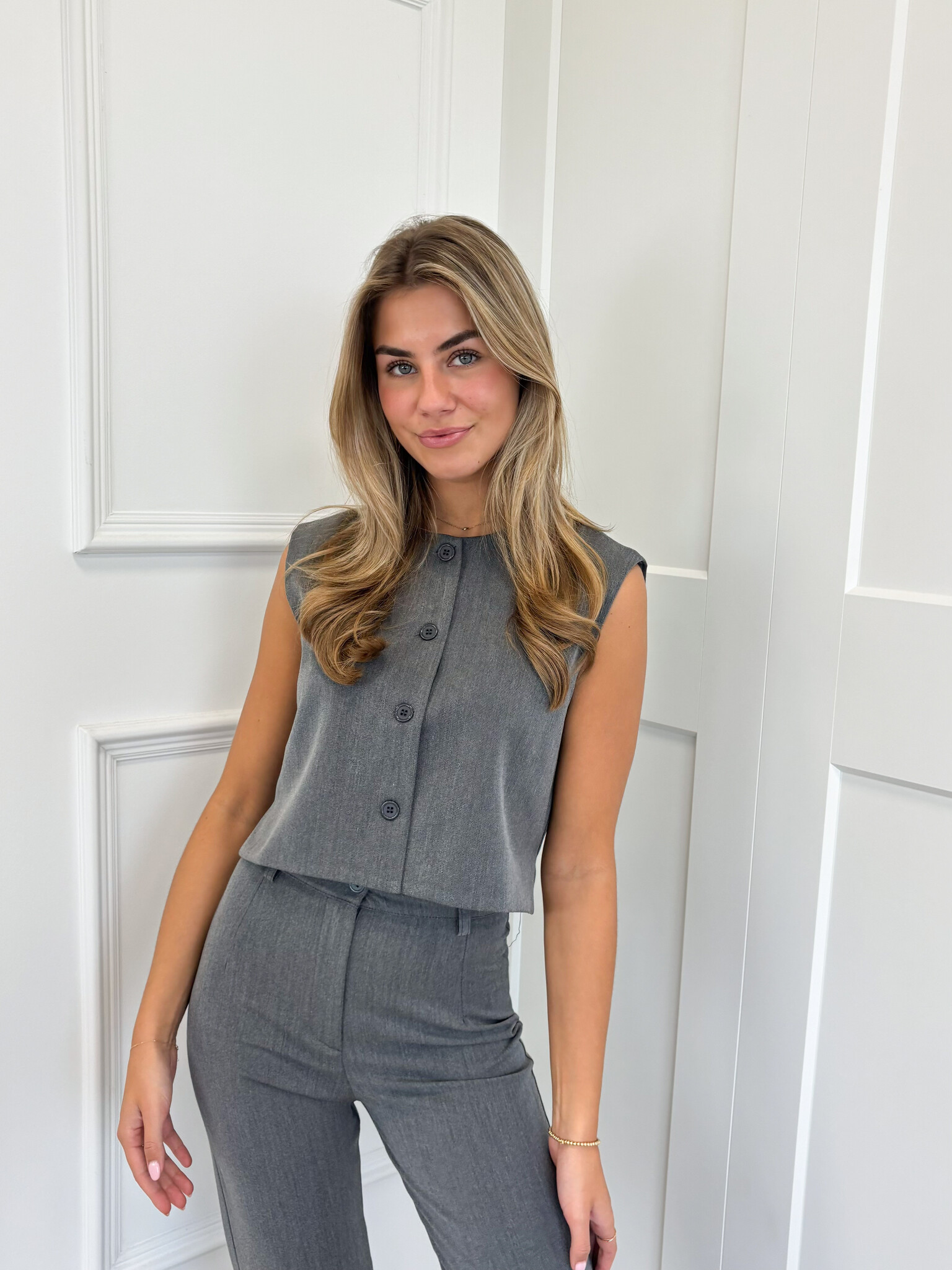 Een prachtige chique gilet kan je niet missen in je kledingkast! Combineer het met de bijpassende esther panatalon voor een classy outfit. Aan de voorkant zitten er knopen en het heeft een cropped model. Gilletjes zijn helemaal trendy, je shopt ze in meerdere kleuren!