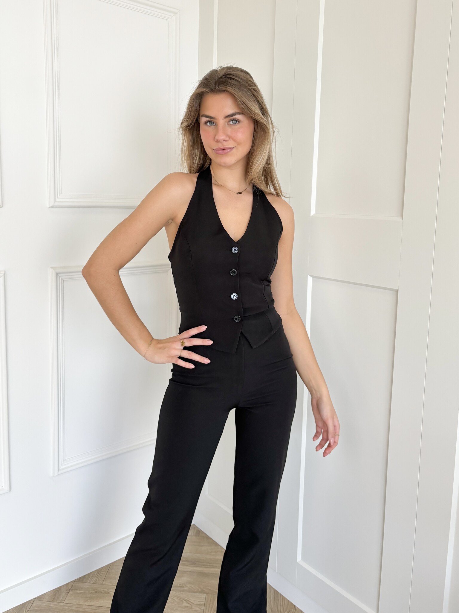 Te cute is deze gilet met een open back! Deze gilet geeft je classy outfit net een extra touch. Het heeft knoopjes aan de voorkant en het gilletje sluit mooi aan door de lichte stretch. Dit is leuk te combineren met onze Esther pantalon. Gilletjes zijn helemaal trendy, je shopt ze in twéé verschillende kleuren!