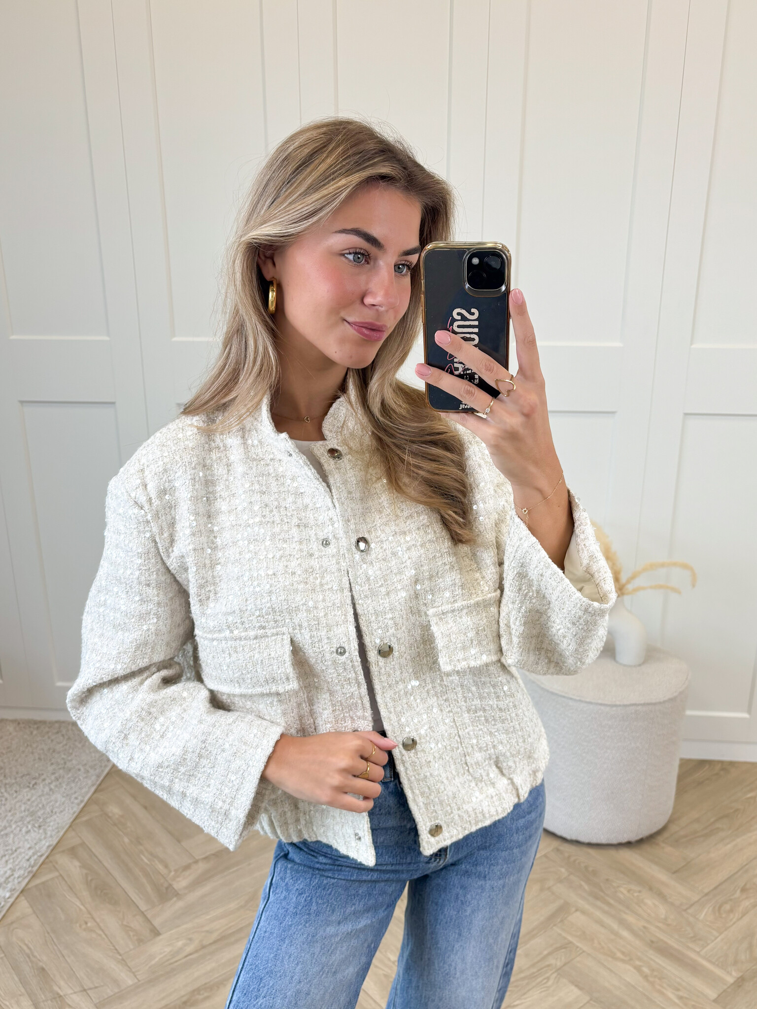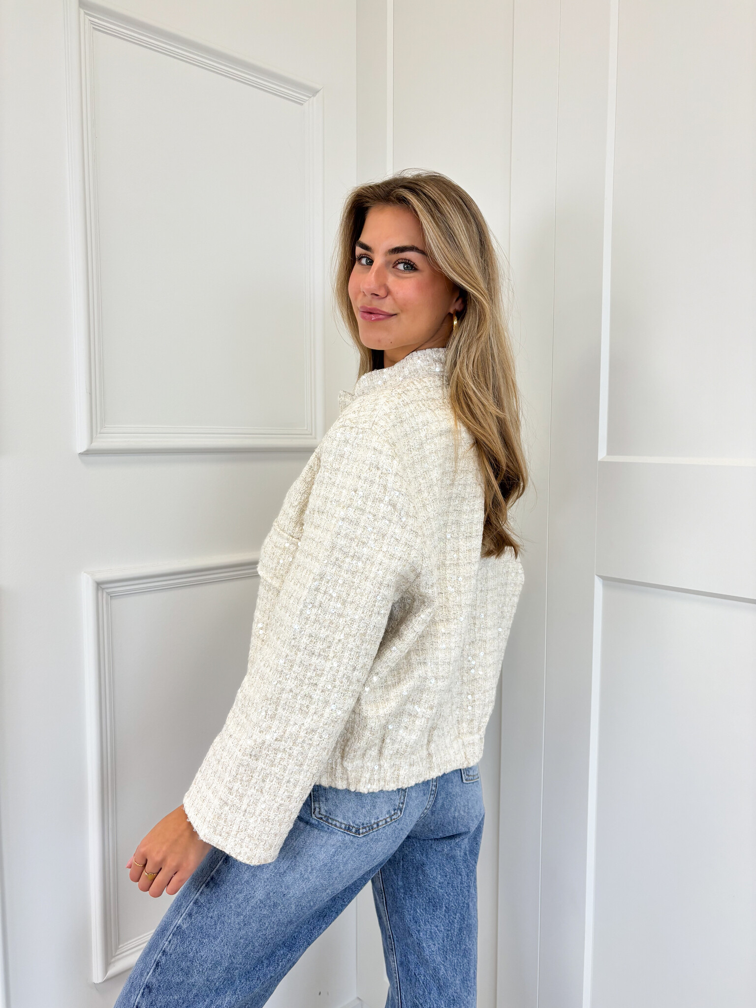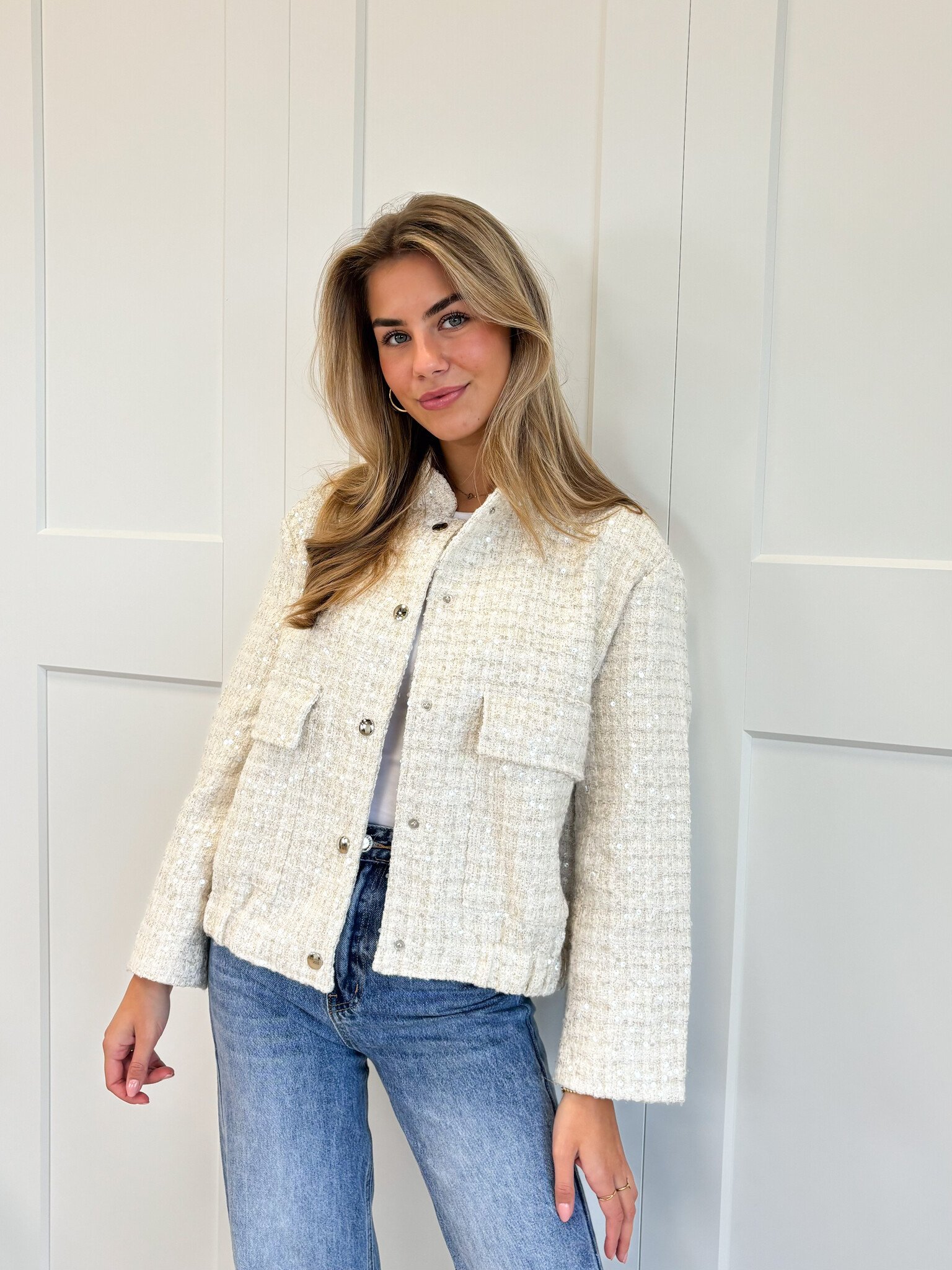 Meiden... deze jas is het toch helemaal! Geen saaie jas meer over je party outfit. Deze jas met glitter pailletten maakt elke outfit een feestje. Het heeft twéé zakken aan de voorkant en shiny knopen. De onderkant heeft een elastische band waardoor de jas mooi in model valt. Voor een avondje stappen met je vriendinnen shine jij de hele avond!