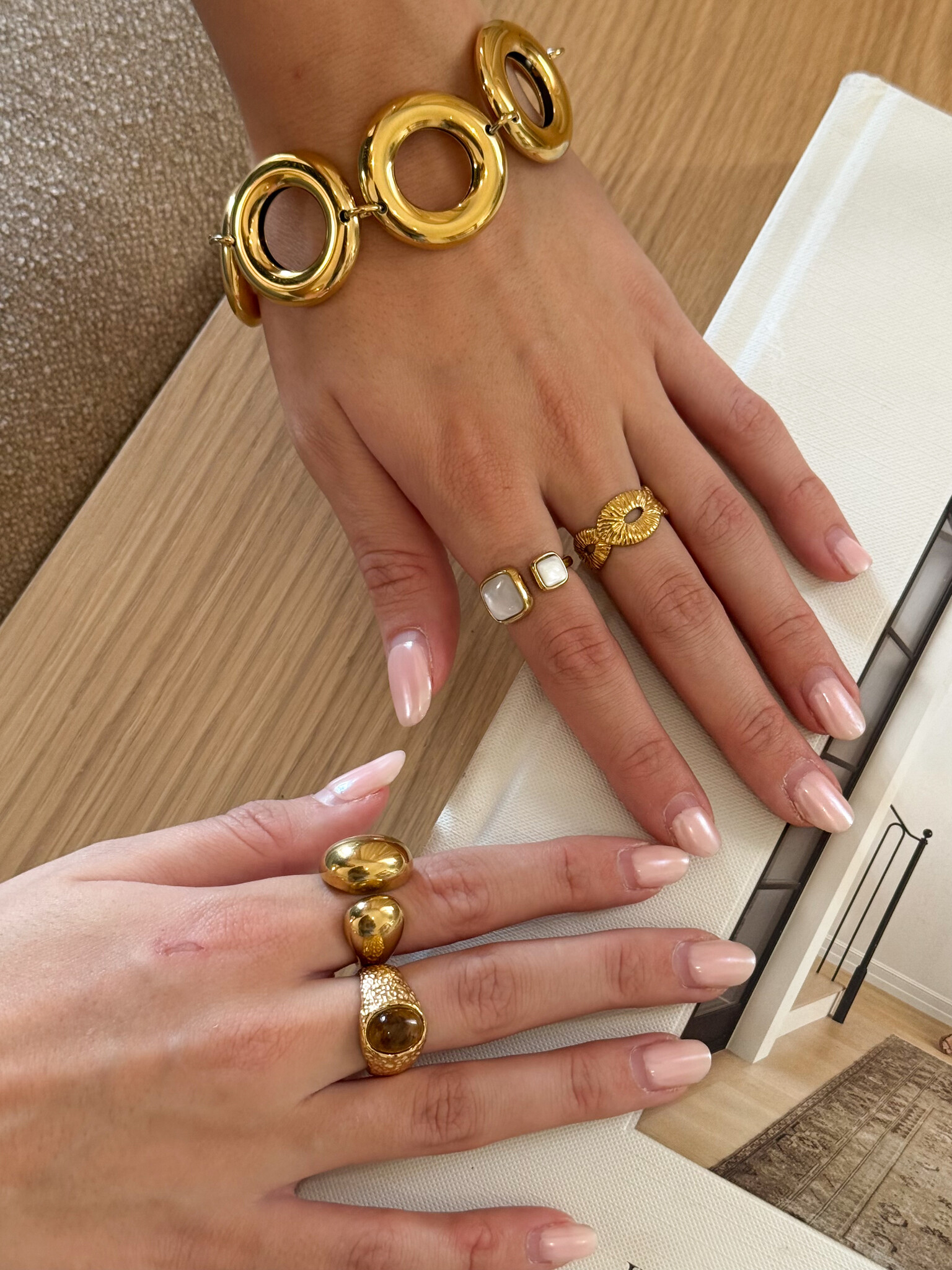 Deze gouden armband met grove ringen is een echte eyecatcher die je look meteen naar een hoger level tilt. De chunky schakels geven een krachtige, trendy uitstraling terwijl de gouden kleur zorgt voor een classy touch. Perfect om te dragen bij een basic top zodat je sieraden echt kunnen shinen, maar ook super mooi bij een jurkje of blazer voor een avondje uit. De ketting valt mooi rond de hals en is makkelijk te combineren met andere sieraden voor een layered look. Ideaal voor feestjes, etentjes of gewoon wanneer jij je outfit wat extra spice wilt geven.