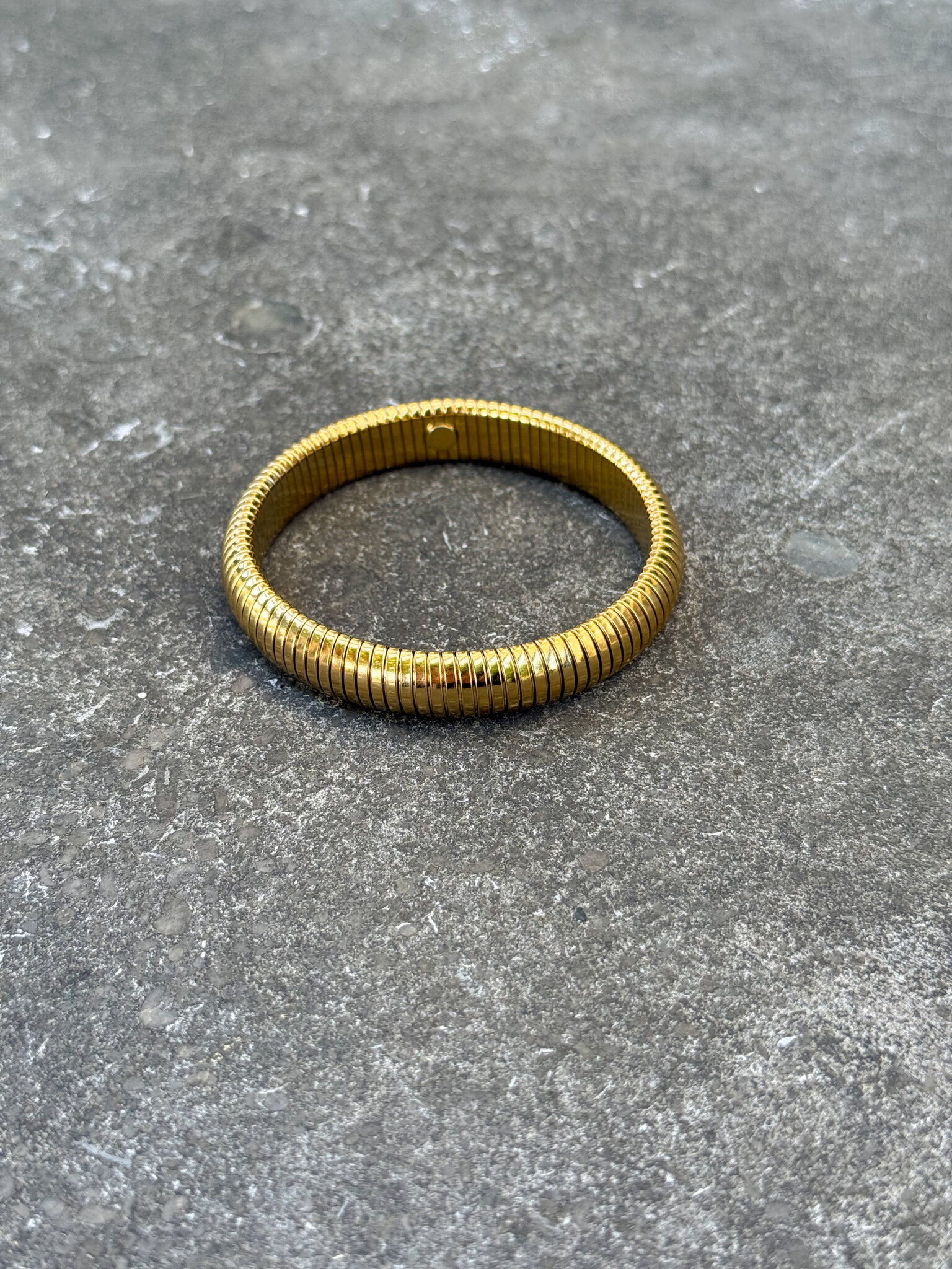 Trendy goudkleurige armband met bold design en stretch. Comfortabel, stijlvol en makkelijk te combineren voor elke gelegenheid.