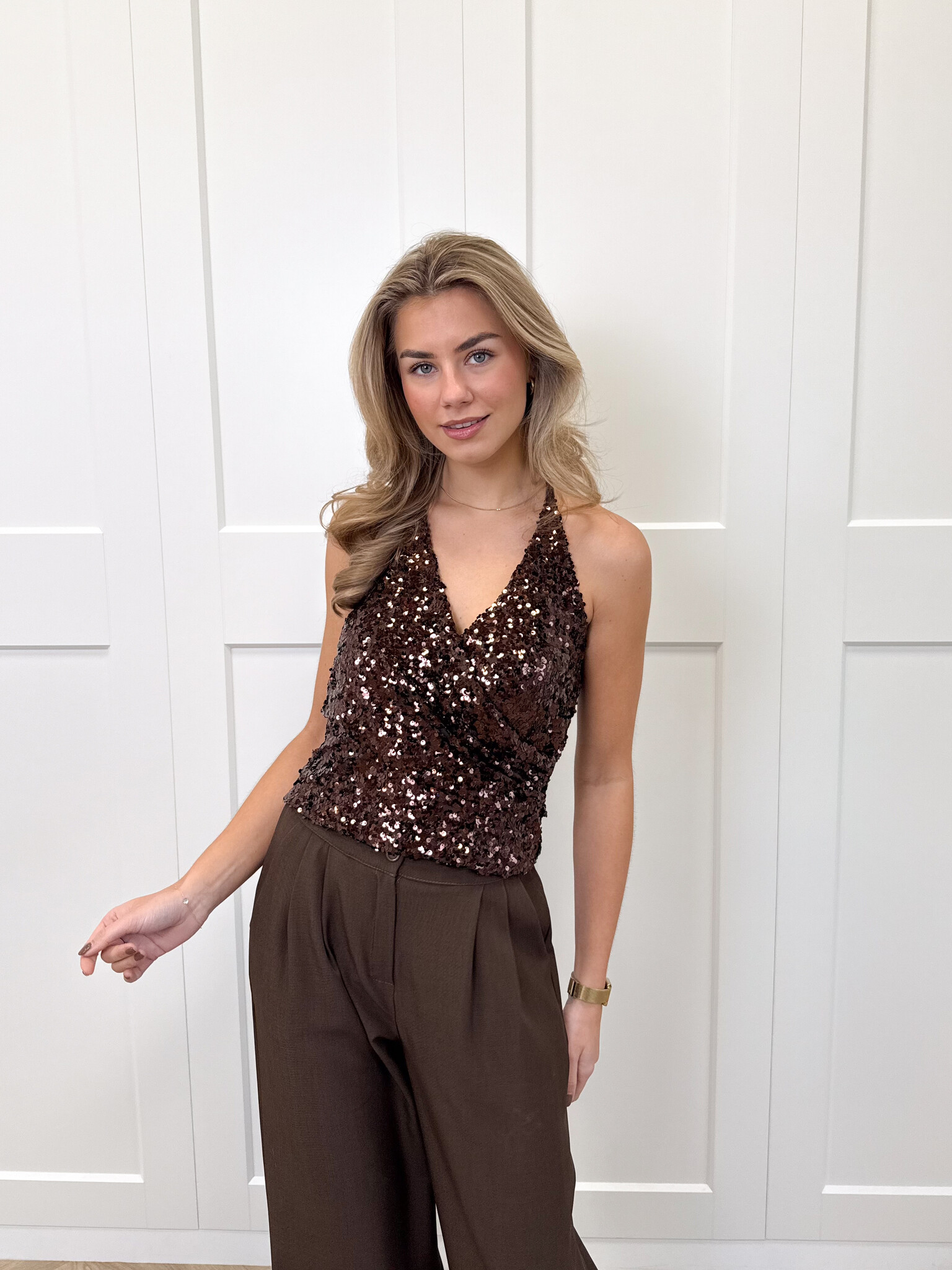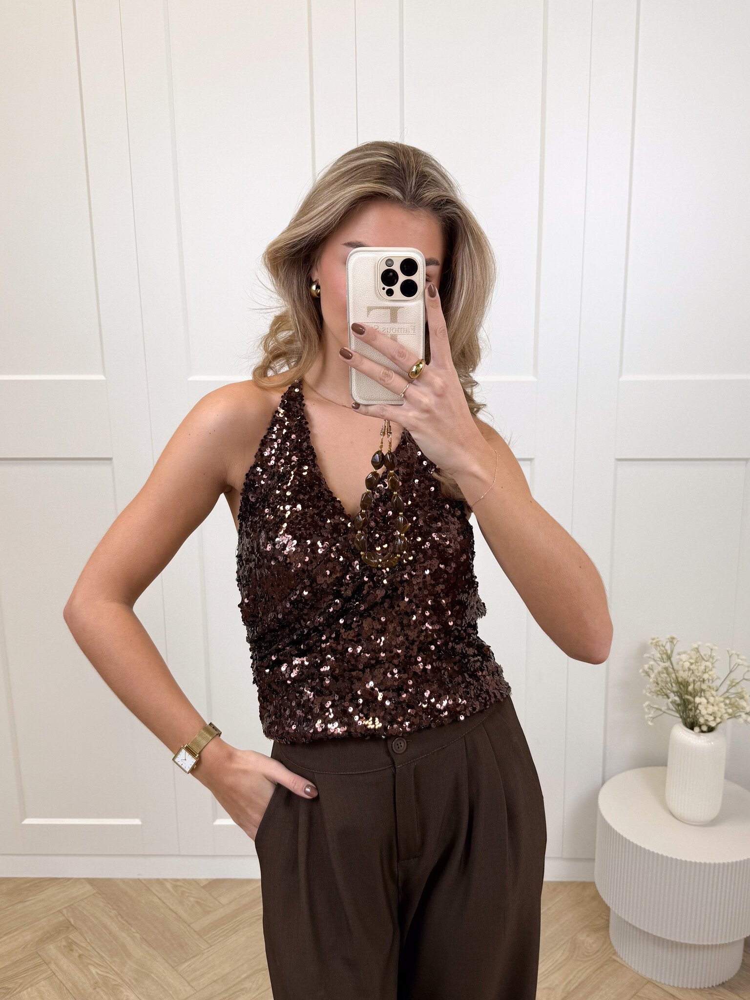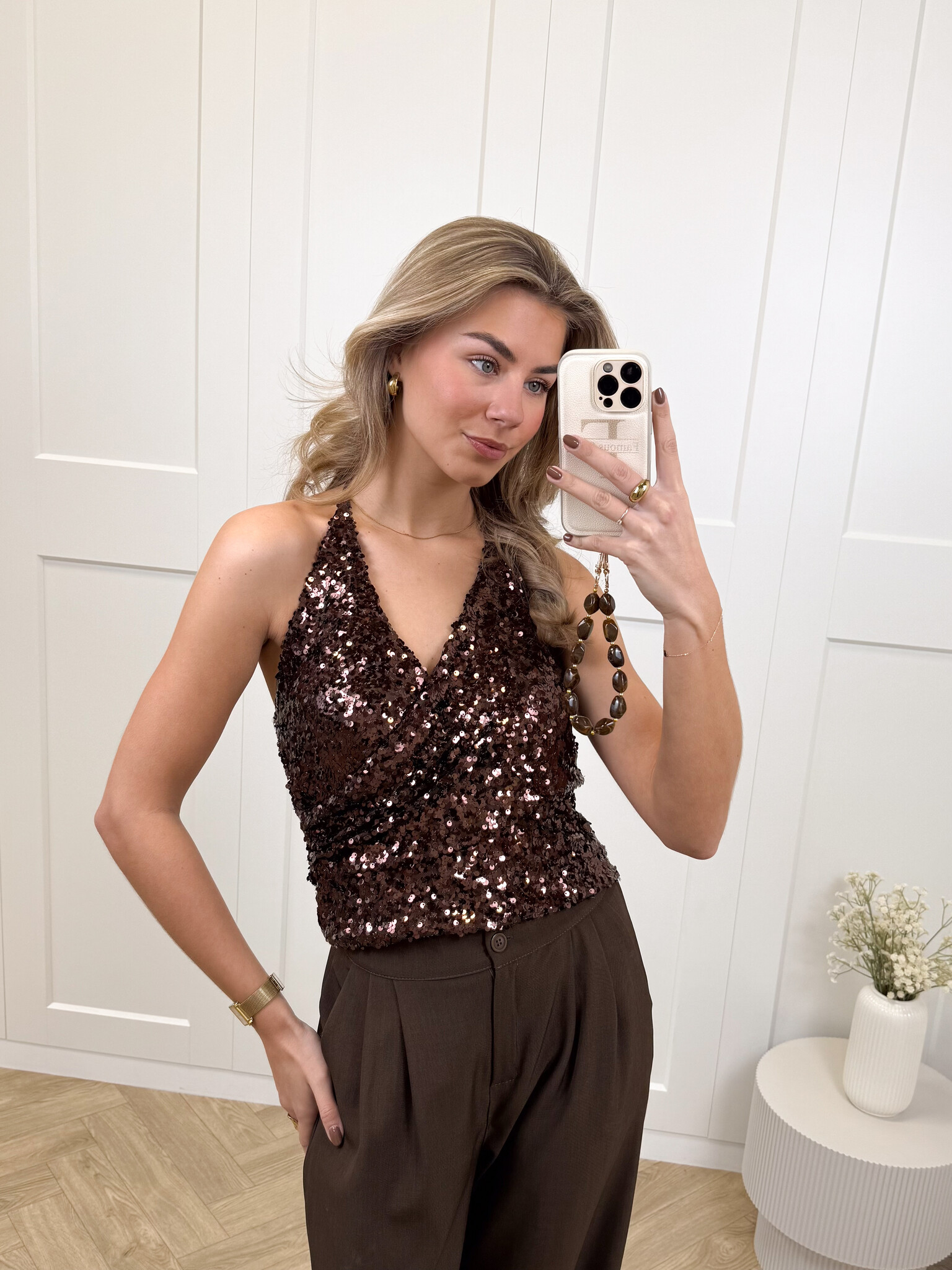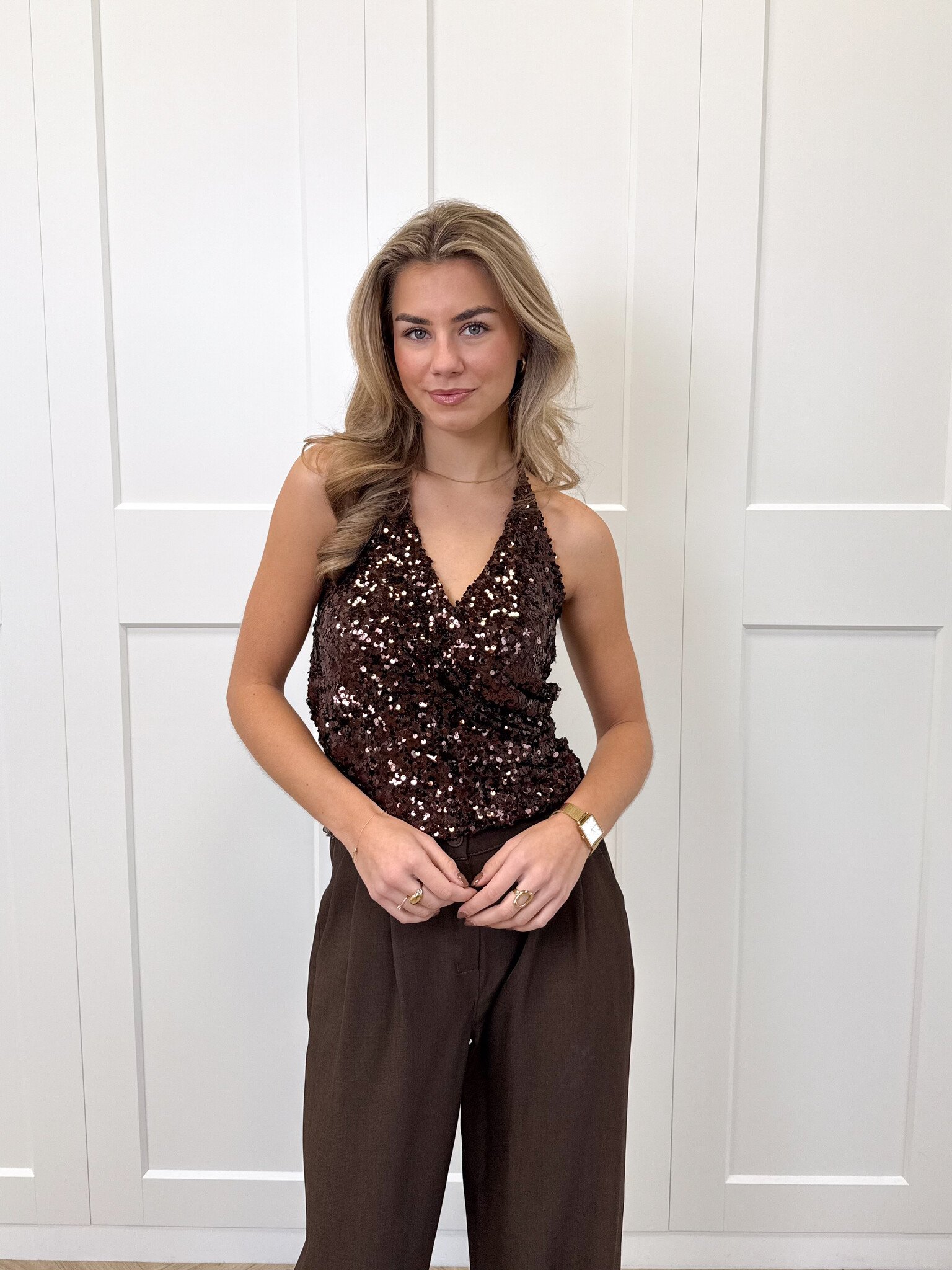 Deze halter top is gemaakt voor avonden waarop je wilt schitteren. De glanzende pailletten vangen elk lichtstraaltje op en geven je look direct een feestelijke, luxe uitstraling. De V-hals zorgt voor een elegante, vrouwelijke shape en maakt de top perfect voor een party night, een chic diner of een event waar je all eyes on you wilt. Dankzij de dubbel gevoerde binnenkant voelt de top comfortabel en zacht aan op de huid, zonder doorschijnen of kriebelen. De licht stretchy pasvorm sluit mooi aan en beweegt met je mee terwijl je danst of borrelt. Combineer ’m met een pantalon, glitterrok of faux leather pantalon voor een glam outfit die gegarandeerd indruk maakt.