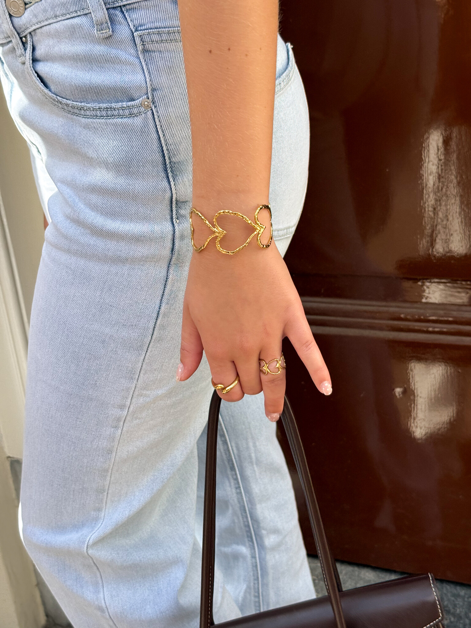 Deze brede bangle armband is een elegante en speelse toevoeging aan je sieradencollectie. De minimalistische harten lopen onder elkaar en zijn subtiel gestructureerd, waardoor een verfijnd en uniek effect ontstaat. Dankzij het verstelbare ontwerp past de bangle comfortabel om iedere pols, waardoor hij veelzijdig en tijdloos is. Draag hem solo voor een subtiele statement touch of combineer met de bijpassende ring!