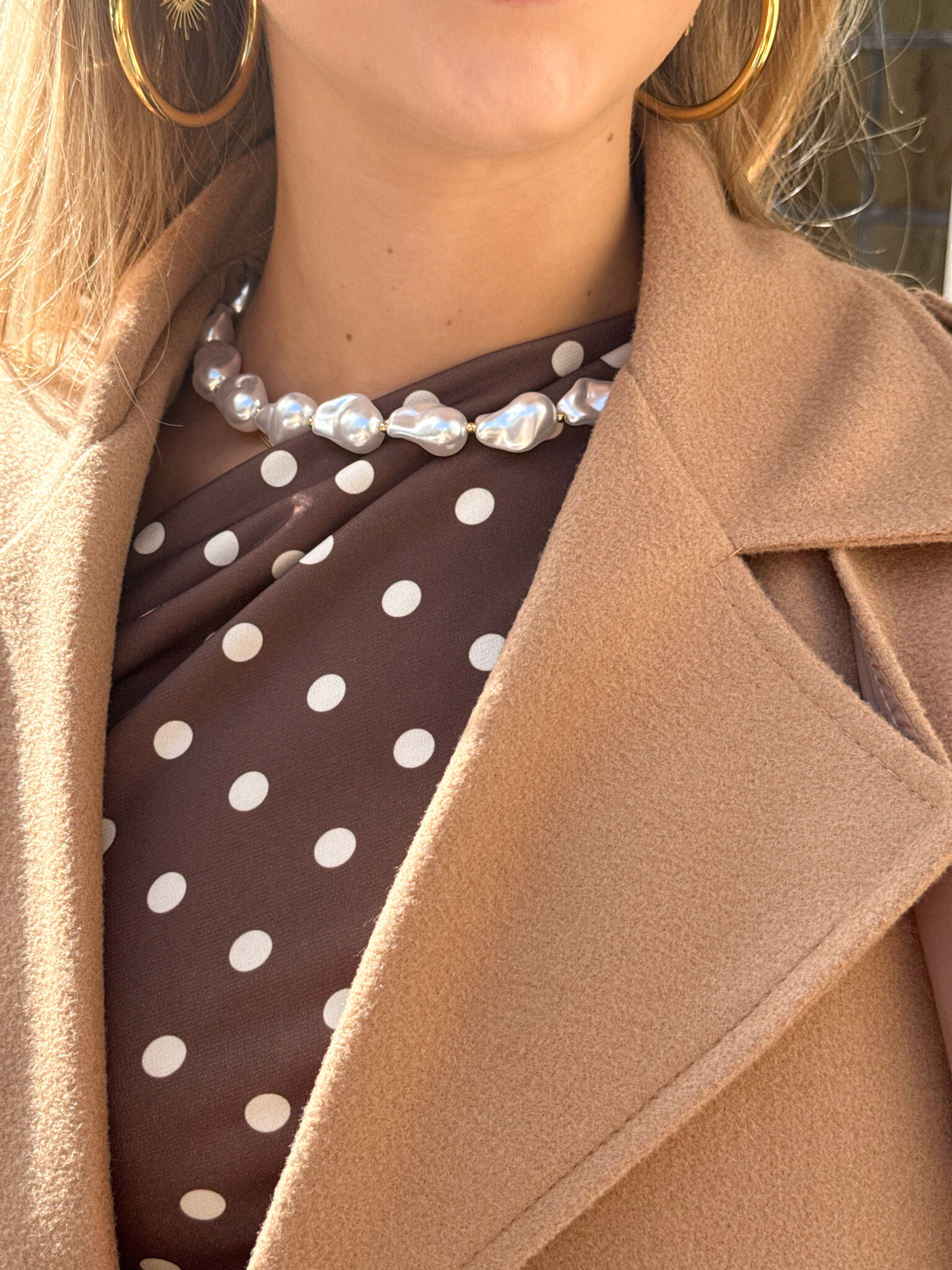 Deze statement ketting tilt je look in één keer naar een hoger niveau. De grote parels in organische vormen geven een speelse twist aan het klassieke design, terwijl de korte lengte van 50 cm zorgt dat hij mooi aansluit bij de halslijn. Perfect om solo te dragen als echte eyecatcher, maar ook prachtig in combinatie met andere minimalistische kettingen. Elegant, modern en tijdloos. Een must-have in je sieradencollectie.