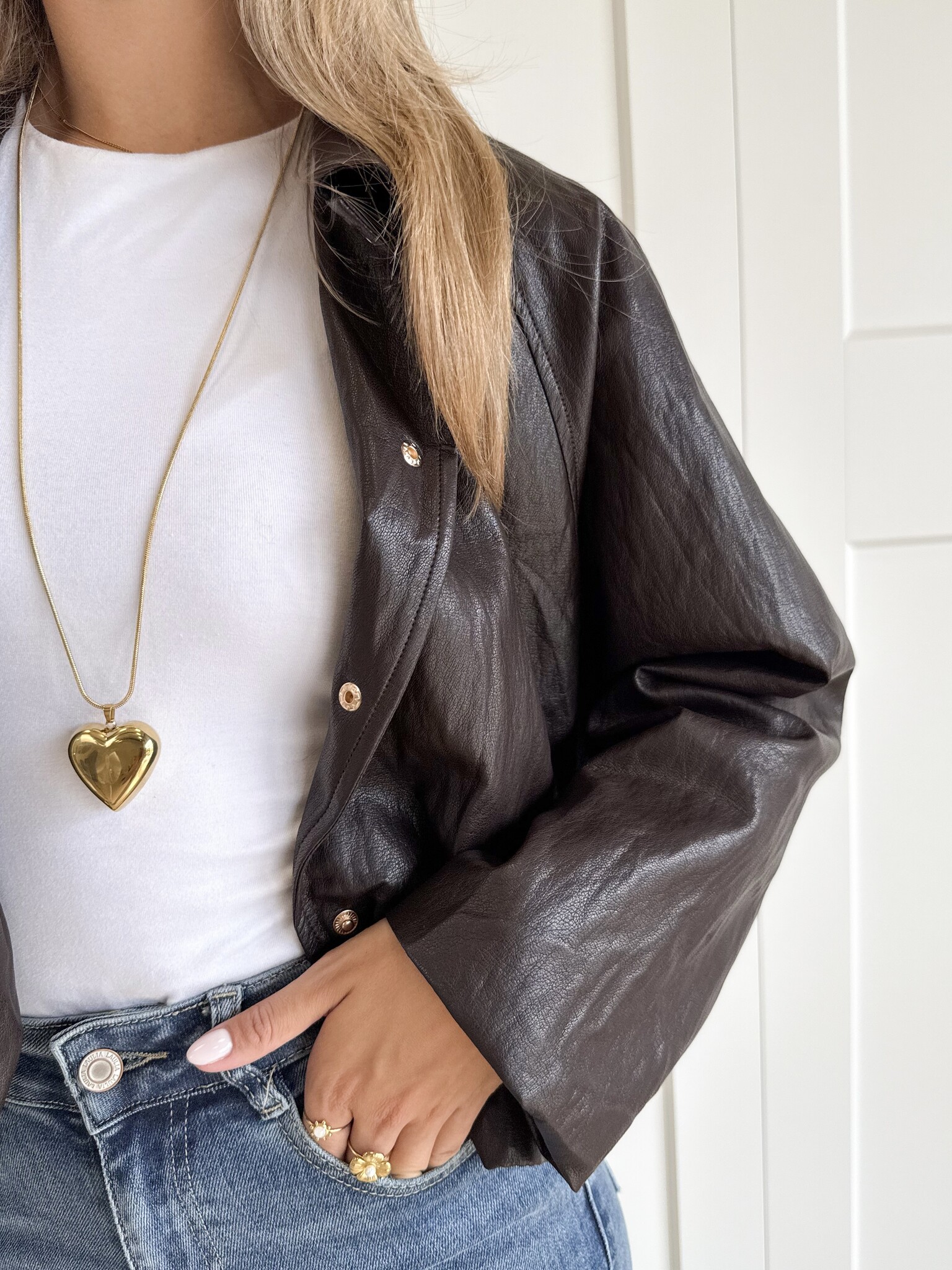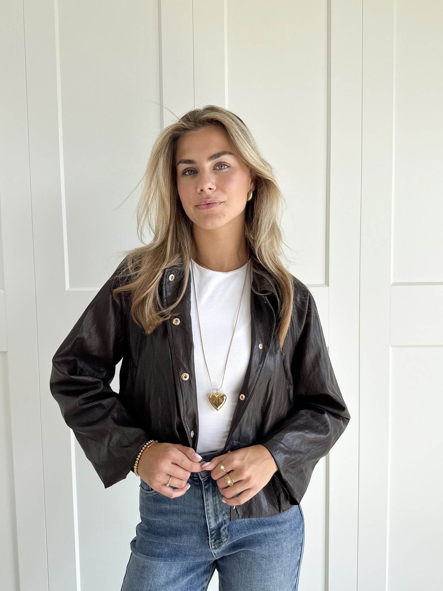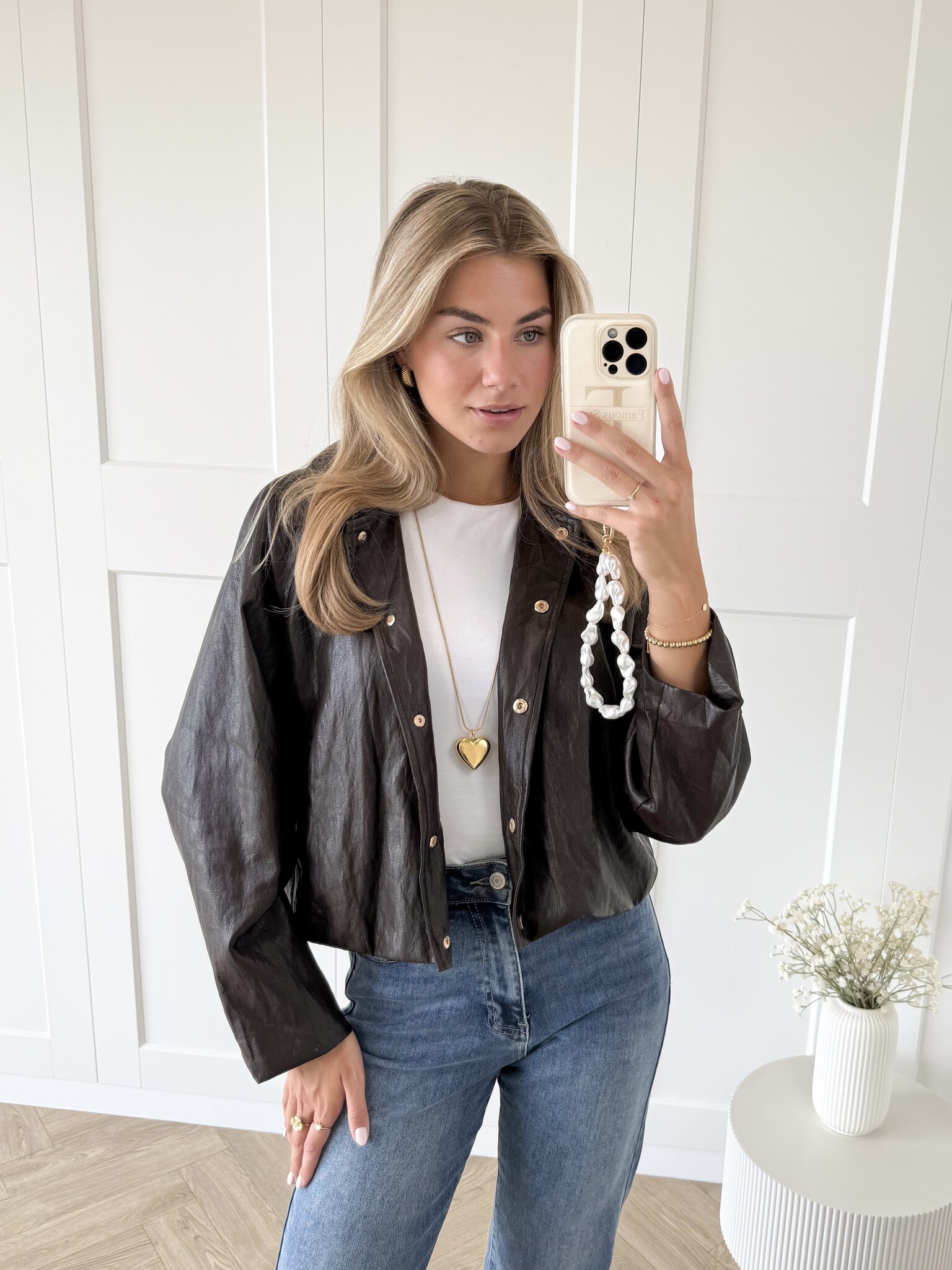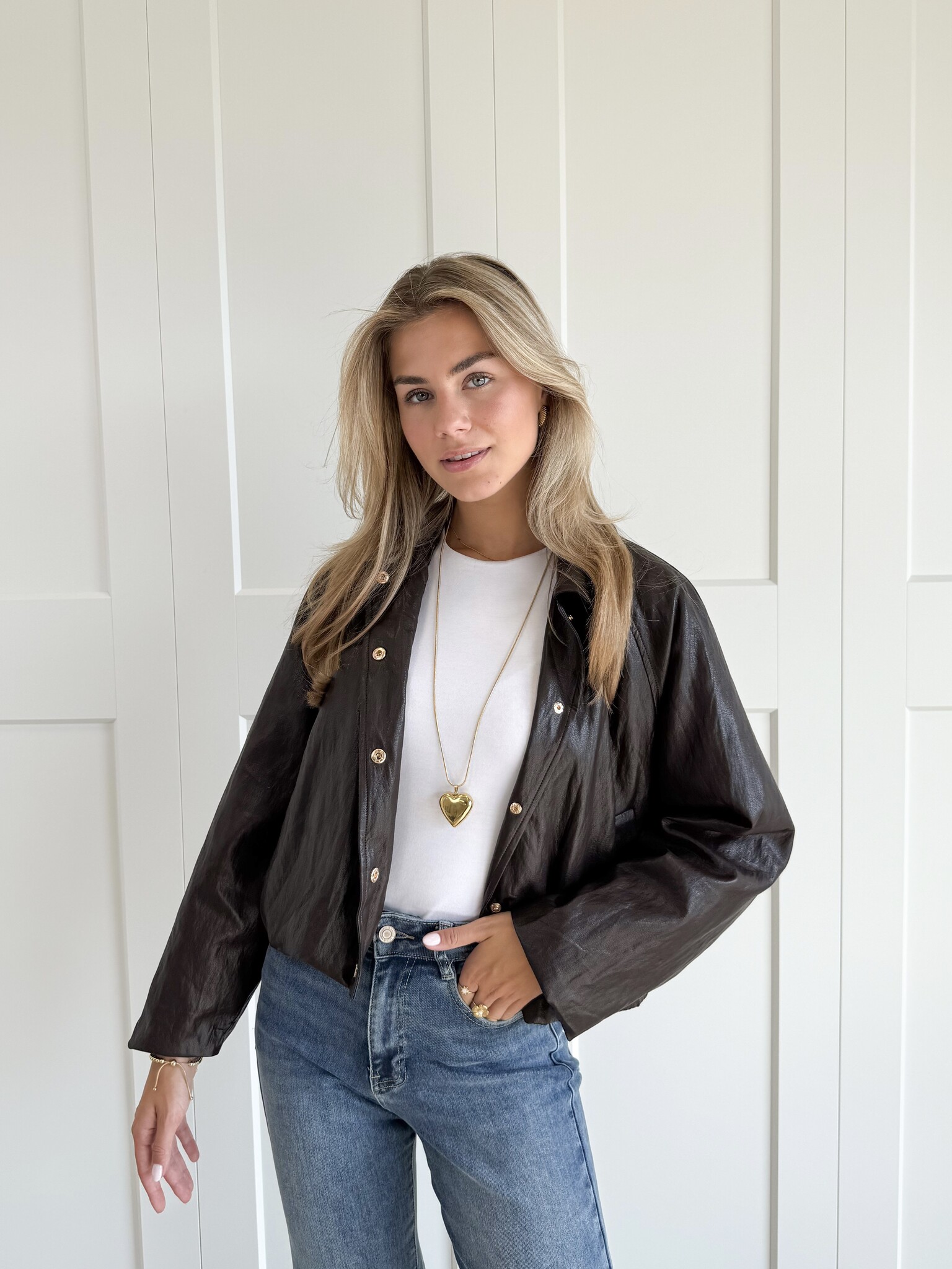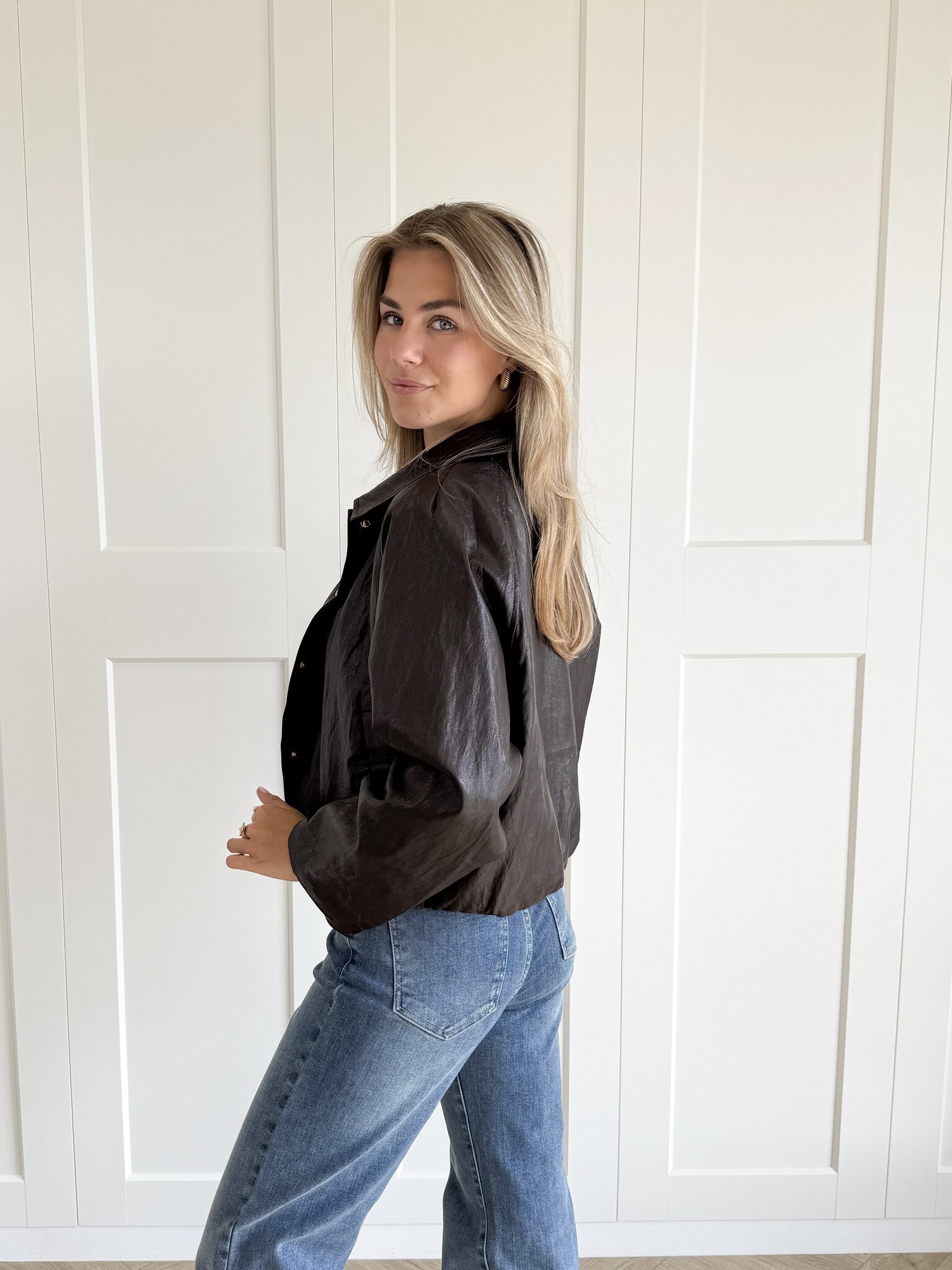 Dit donkerbruine jasje van imitatie leer is de perfecte tussenjas voor een stoere maar stijlvolle look. De subtiele glans geeft een luxe uitstraling, terwijl de oversized fit en het kortere model hem trendy en draagbaar maken. Met het kraagje, drukknopen en handige zakken aan de voorkant is hij niet alleen fashionable, maar ook praktisch. Combineer casual met een jeans en sneakers, of draag hem over een jurkje voor een edgy touch. Een echte eyecatcher in je garderobe!