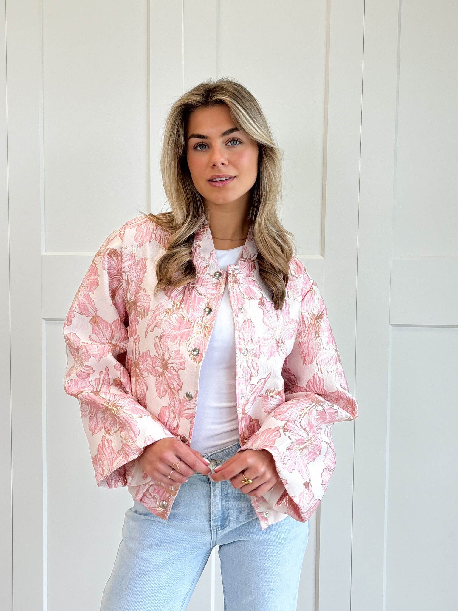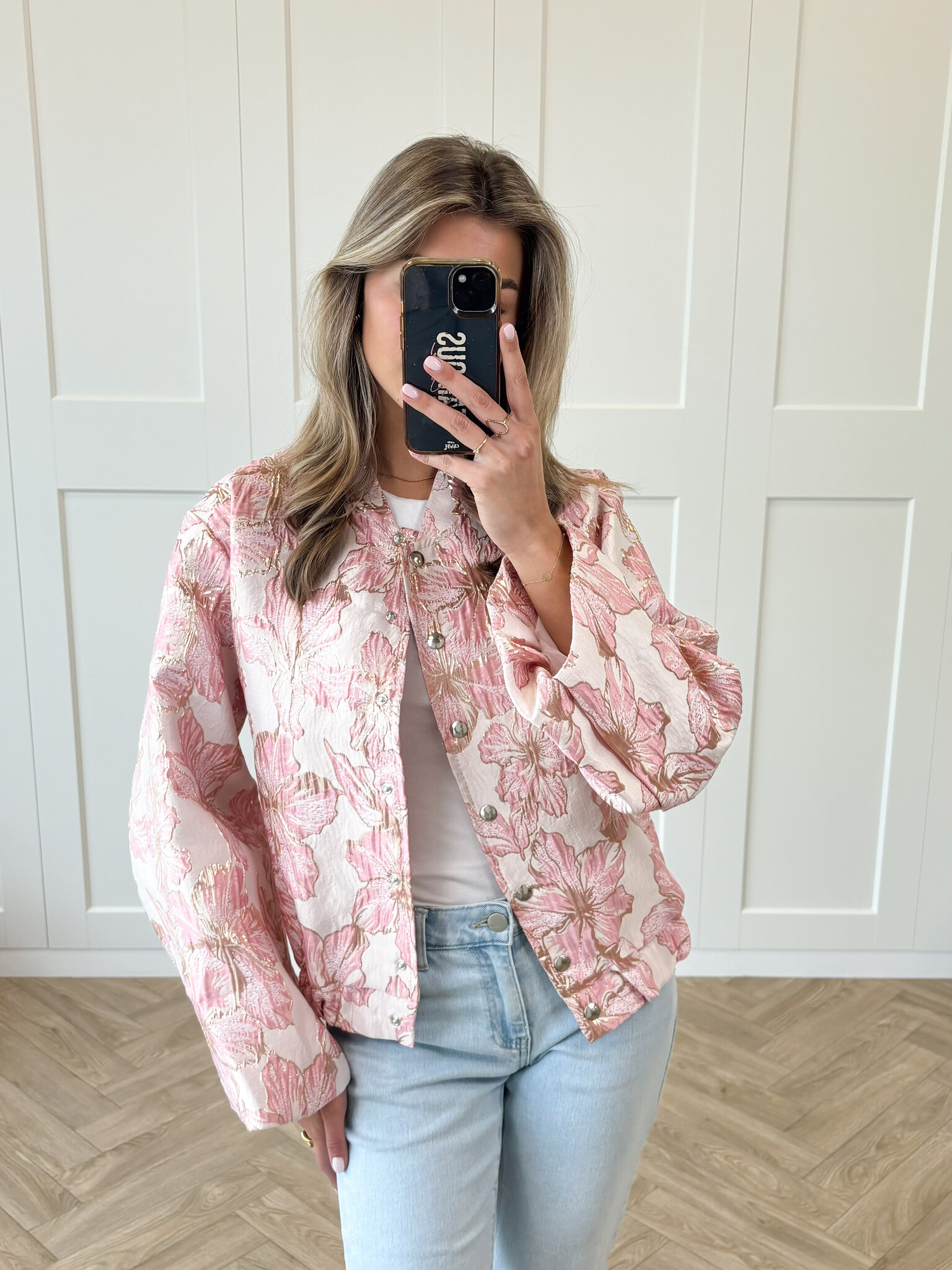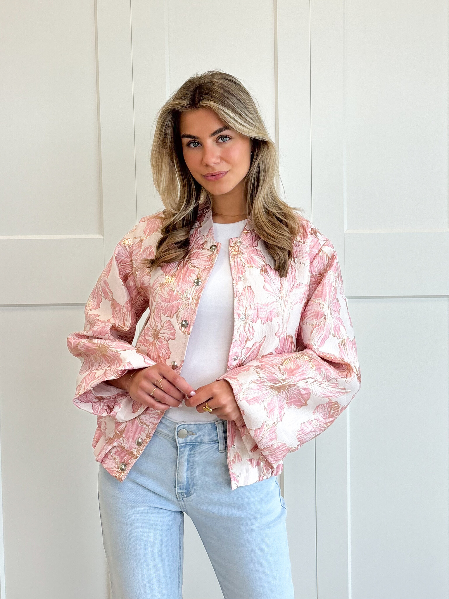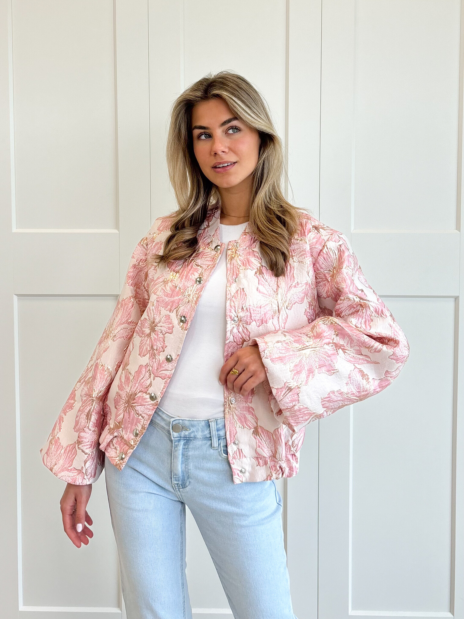 De jas is voorzien van een kleurrijke bloemenprint die een speelse touch geeft. Een prachtig detail van zachte, licht glanzende stof tot de subtiele gouden glinsterende accenten die bij elke beweging het licht vangen. De gouden details zijn verwerkt in het patroon zelf. Een subtiele glamour die net dat beetje extra geeft. De jas heeft een comfortabele pasvorm wat zorgt voor een perfecte aansluiting. Binnenin is hij gevoerd met een gladde, ademende stof die warmte biedt zonder zwaar aan te voelen, ideaal voor het tussenseizoen. Combineer hem moeiteloos met jeans en sneakers voor een casual look, of draag hem over een jurk voor een verrassend contrast. Of je nu een fashion statement wilt maken of gewoon iets zoekt dat zowel stijlvol als comfortabel is. Deze bloemen bomber jas met gouden glans is een echte eyecatcher die elke outfit naar een hoger niveau tilt!