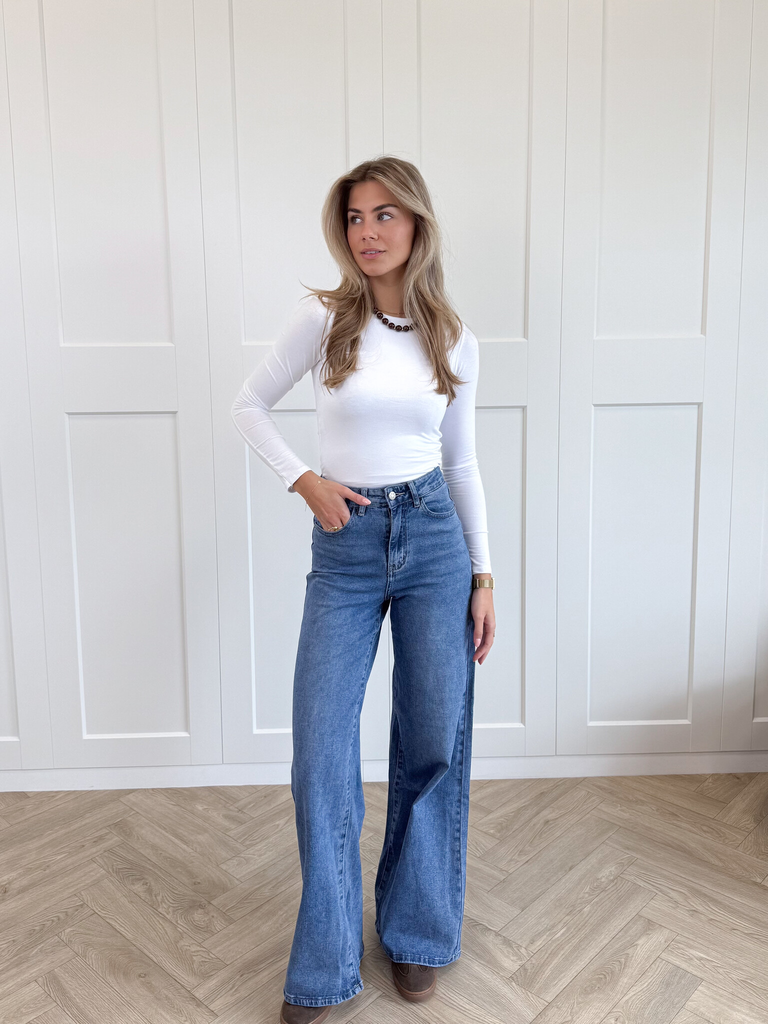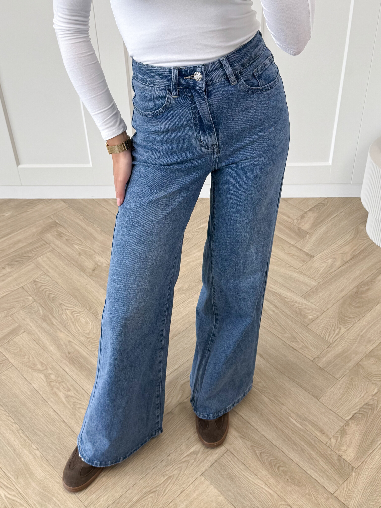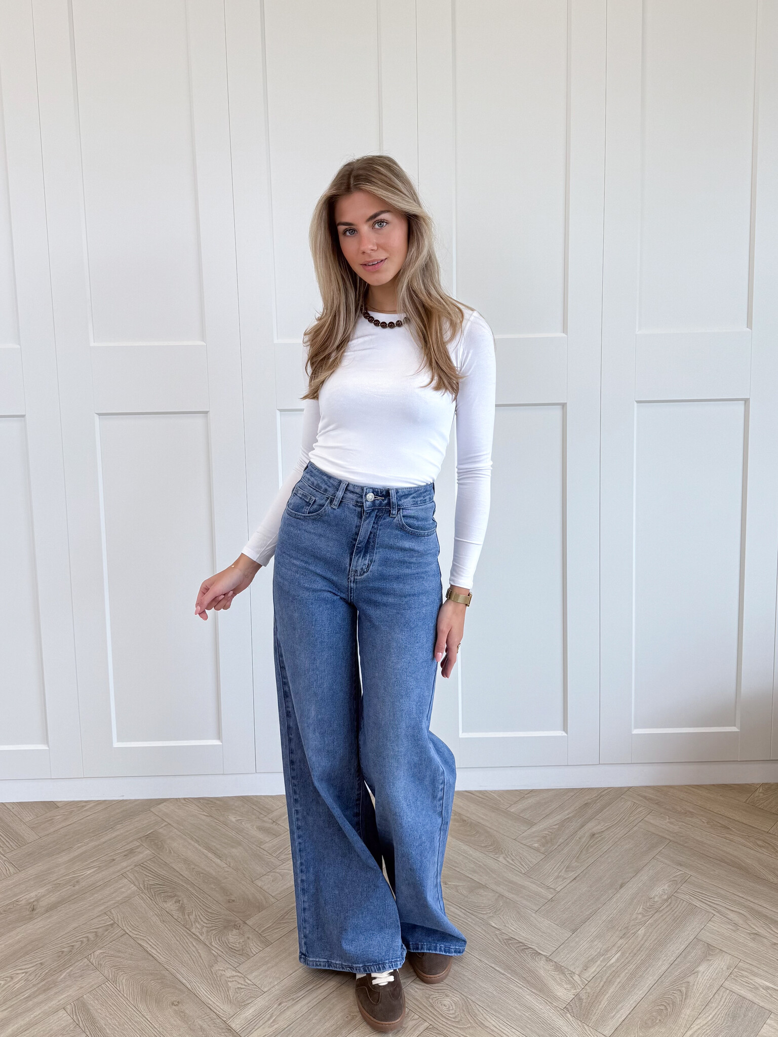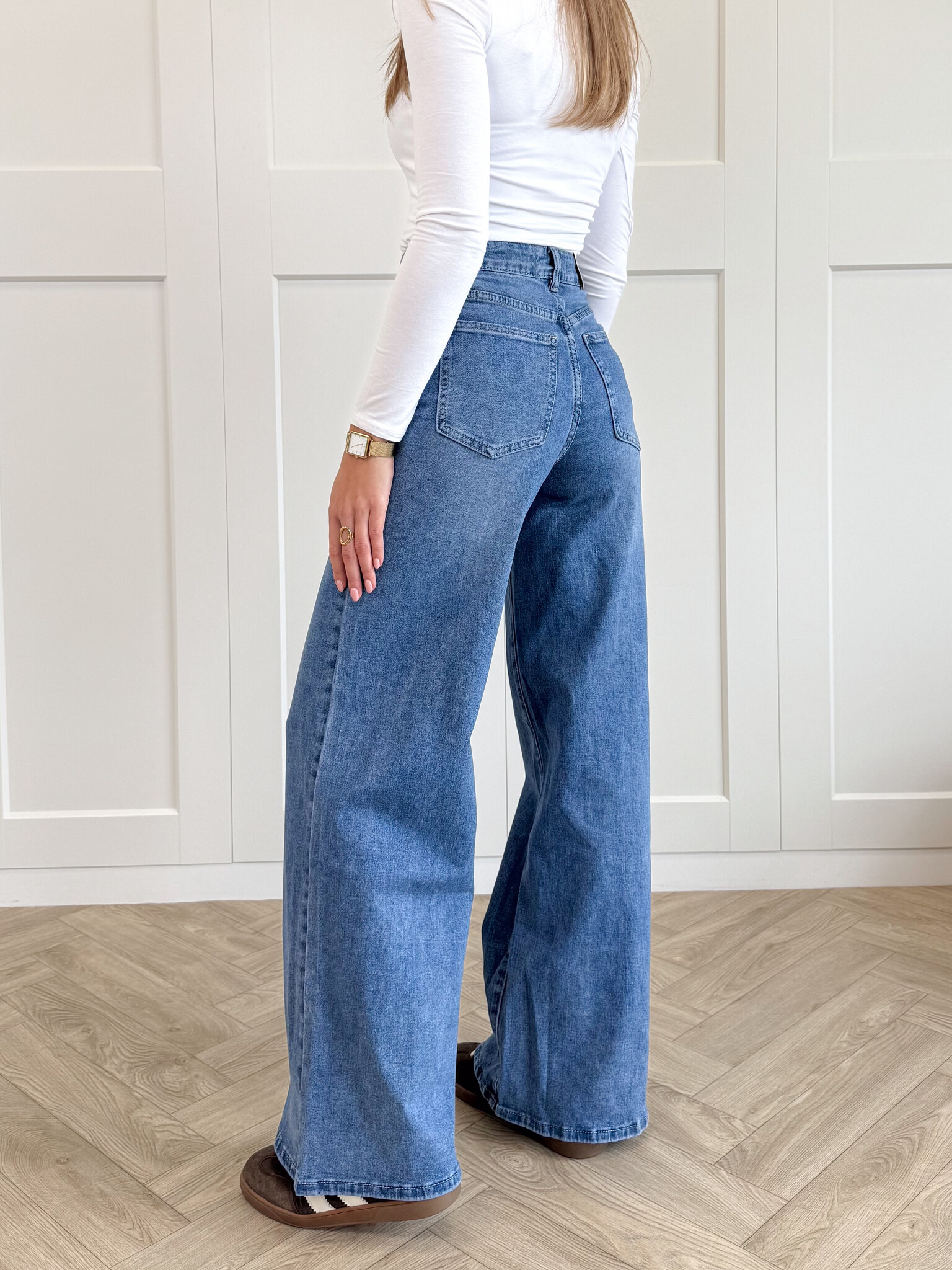 Deze blauwe denim jeans is dé perfecte mix van comfort en stijl. De wide leg fit geeft een super leuke look terwijl de stretchy stof zorgt voor een heerlijke pasvorm die met je meebeweegt. De zachte denim voelt soepel aan.Dankzij de tijdloze blauwe wassing past de jeans moeiteloos bij alles in je kast. Van een basic top tot een leuke trui. Deze jeans is gemaakt om jou een hippe look te geven.