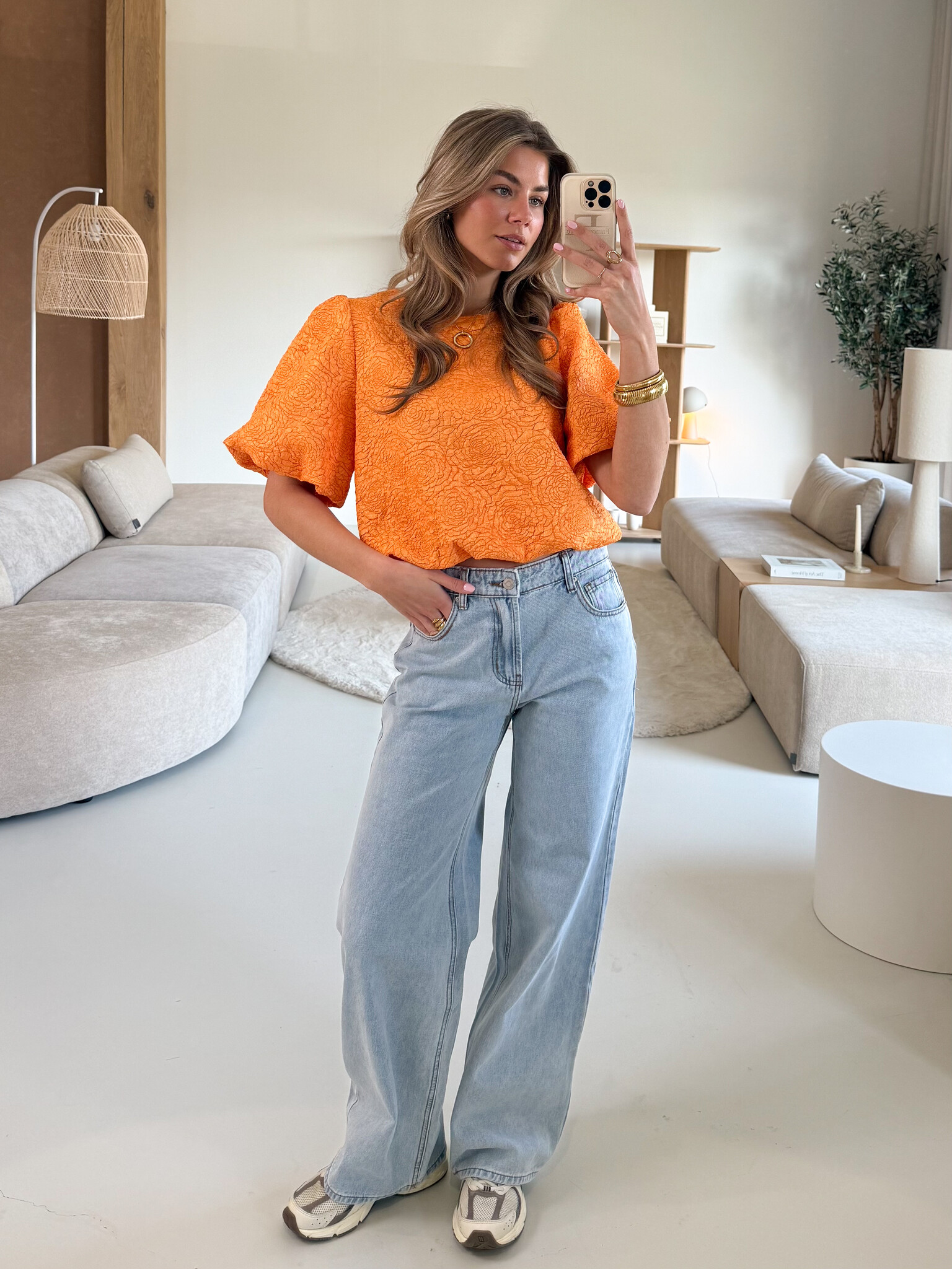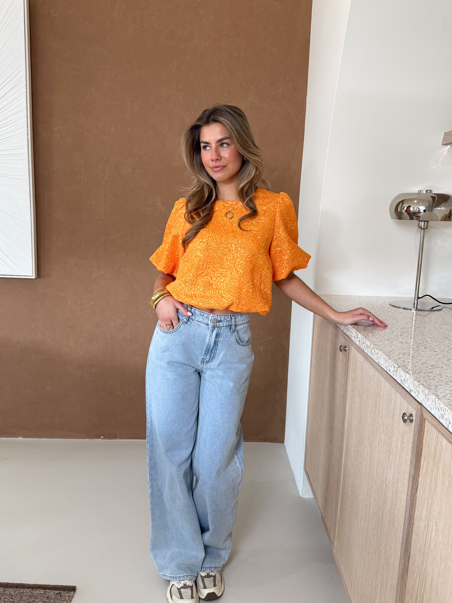 - Model: Het model is 170cm lang en draagt de maat S