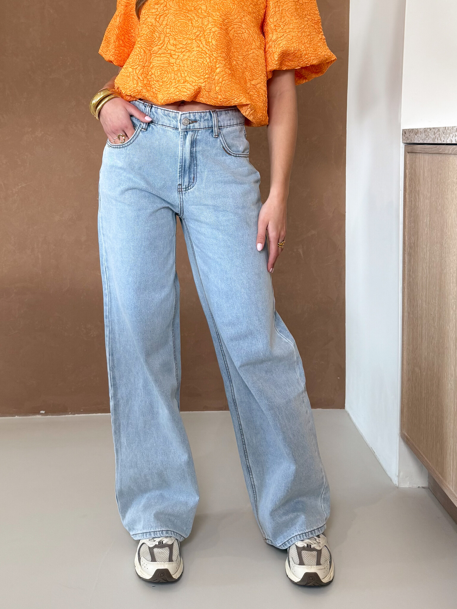 Deze lichtblauwe wide leg broek is een perfecte mix van stijl en comfort. De wijde pijpen zorgen voor een trendy en elegante uitstraling, terwijl de bruine stiksels een mooi contrast geven en het ontwerp net wat extra karakter geven. De broek zit comfortabel en valt soepel langs het lichaam, waardoor hij ideaal is voor dagelijks gebruik. Dankzij de moderne pasvorm kun je hem makkelijk combineren met verschillende outfits. Draag hem met een aangesloten top en sneakers voor een casual look of combineer met een blouse en hakken voor een meer classy vibe. Perfect voor een dagje shoppen, een lunchdate of een stijlvolle everyday outfit.