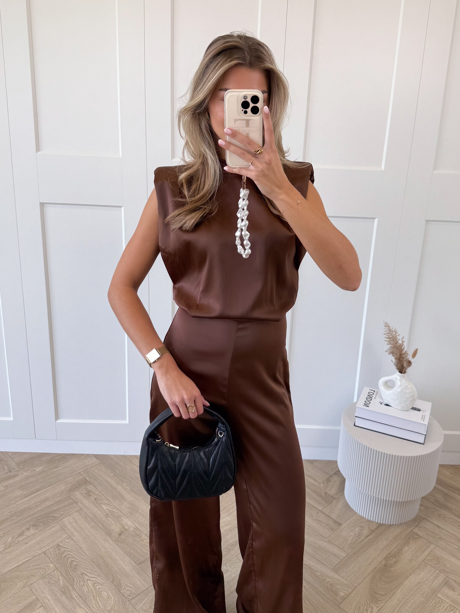 Byebye keuzestress! Weet je niet wat je aan moet trekken? Met deze satin jumpsuit met open back heb je in één keer een complete on-trend outfit. Ideaal voor een feestje, festival, bruiloft of een diploma uitreiking. Voor een classy look, draag dan een mooi paar pumps onder de satin jumpsuit. Satijn is een gevoelige kwetsbare stof, wij zijn dan ook niet verantwoordelijk voor draagschades zoals haaltjes en ladders in het materiaal. Je shopt deze mooie jumpsuit in verschillende leuke kleuren!