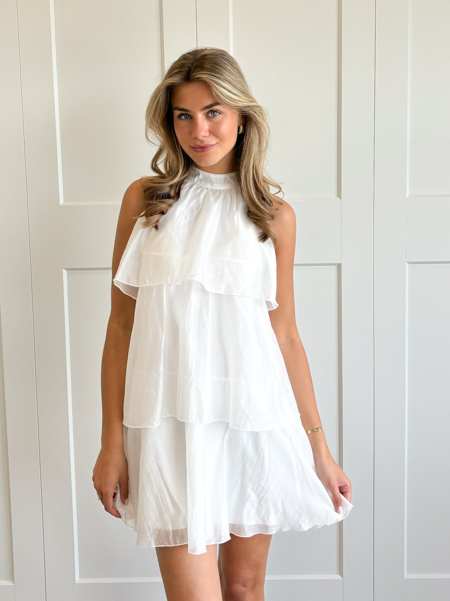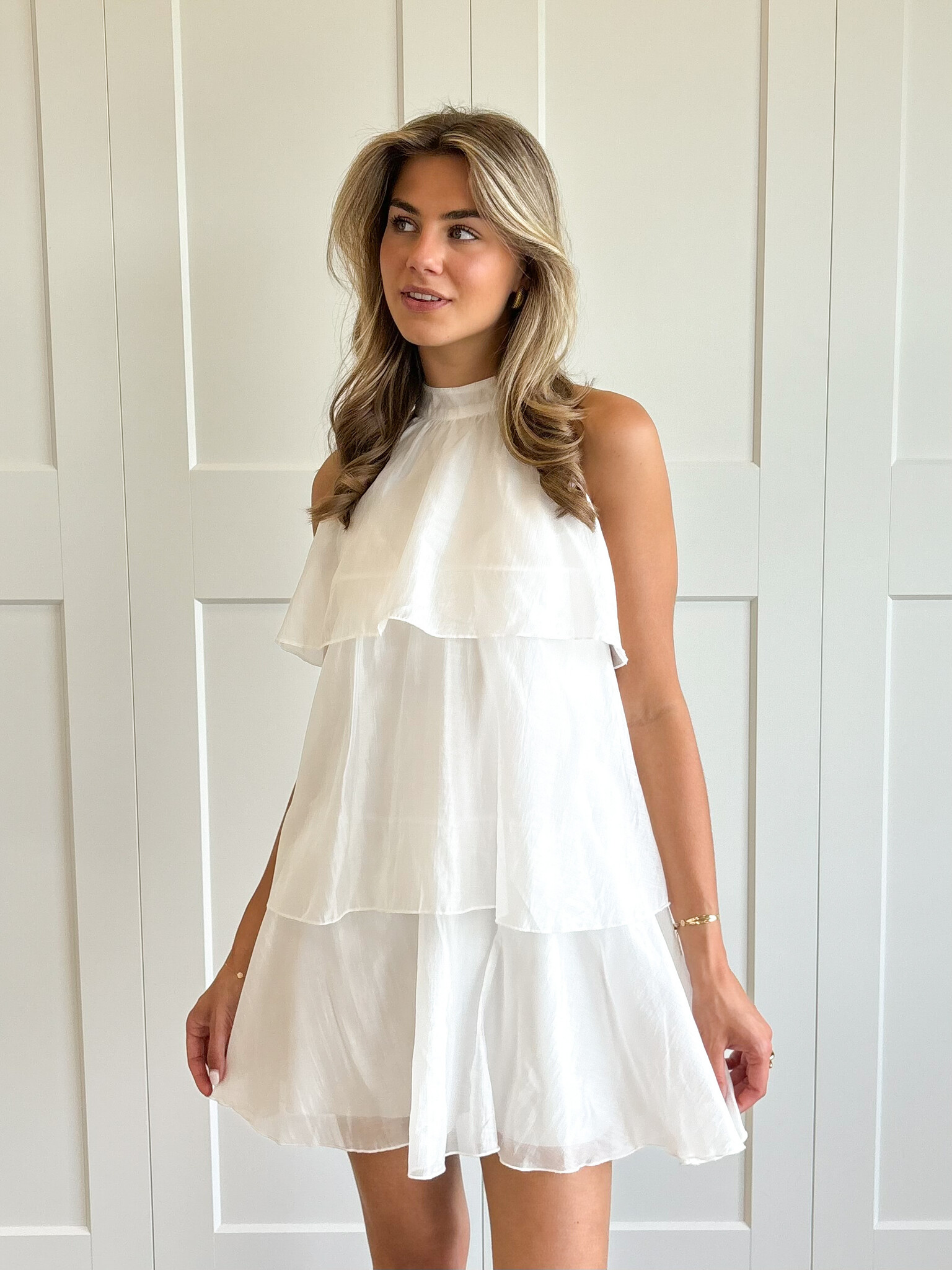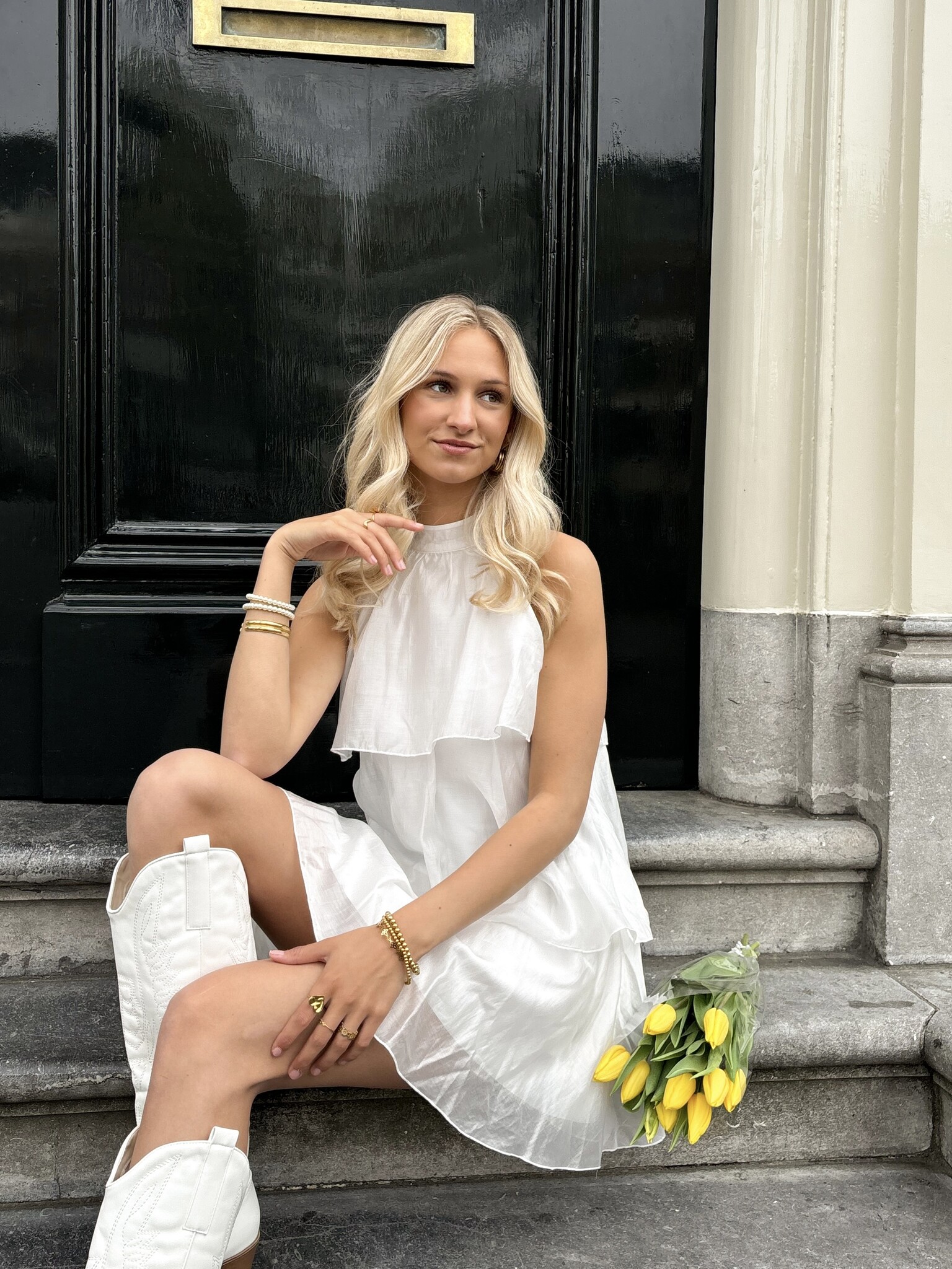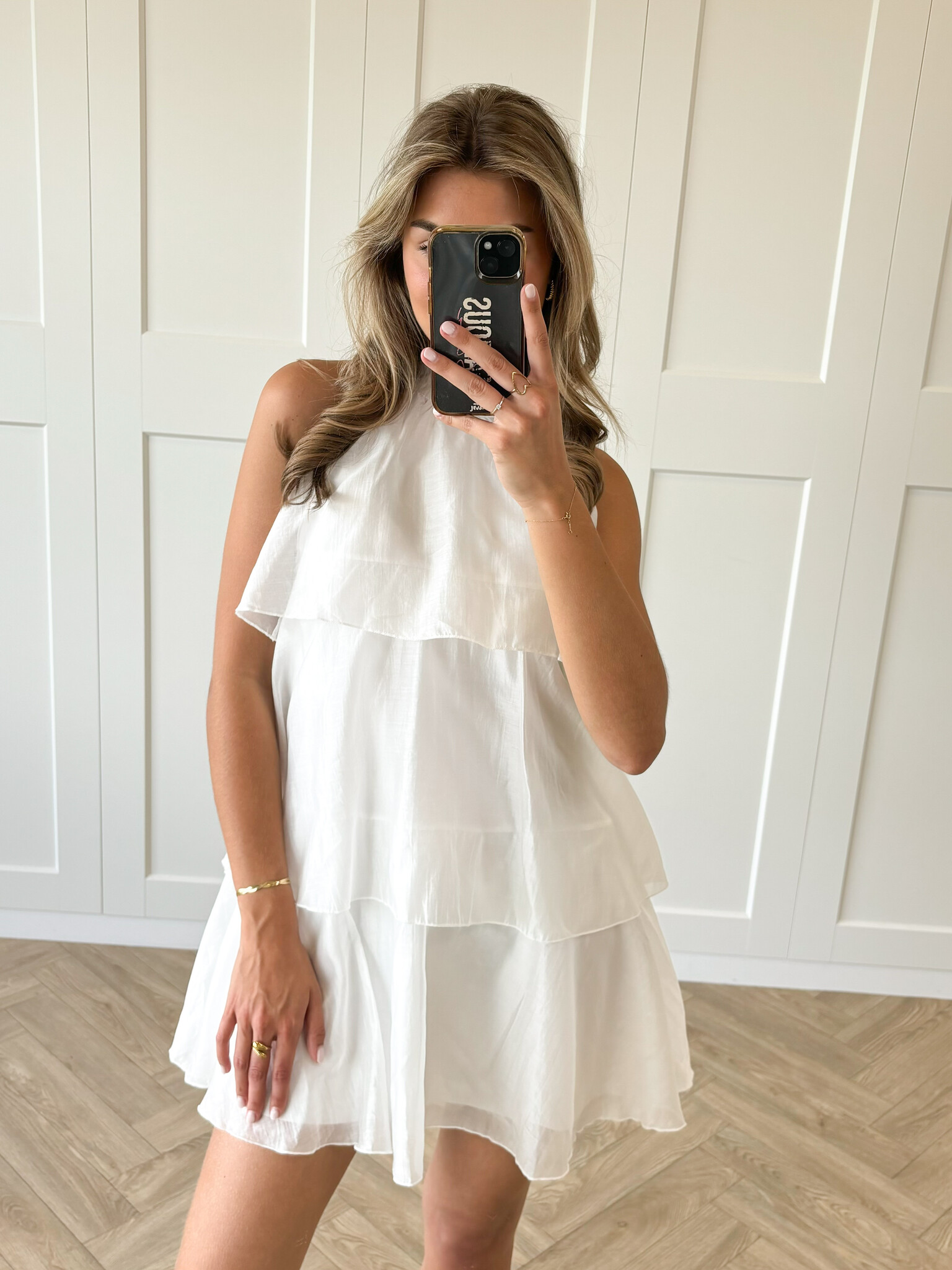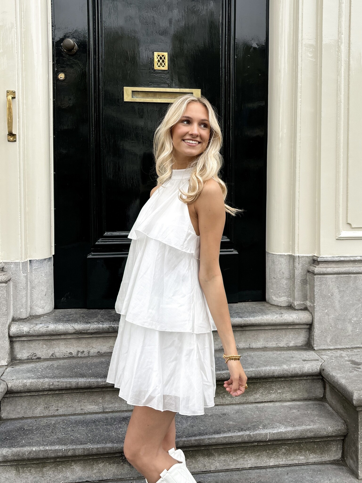 Deze witte laagjes halterjurk van dunne, glanzende tulle stof is een echte showstopper. Je strikt hem in de nek, wat zorgt voor een elegant strikdetail aan de achterkant. De jurk valt luchtig en zwierig dankzij de drie gelaagde rokdelen die sierlijk meebewegen terwijl je loopt of danst. Perfect voor zomerse bruiloften, etentjes, vakanties of een garden party. Combineer met sandaaltjes of hakken en je bent helemaal ready to shine!