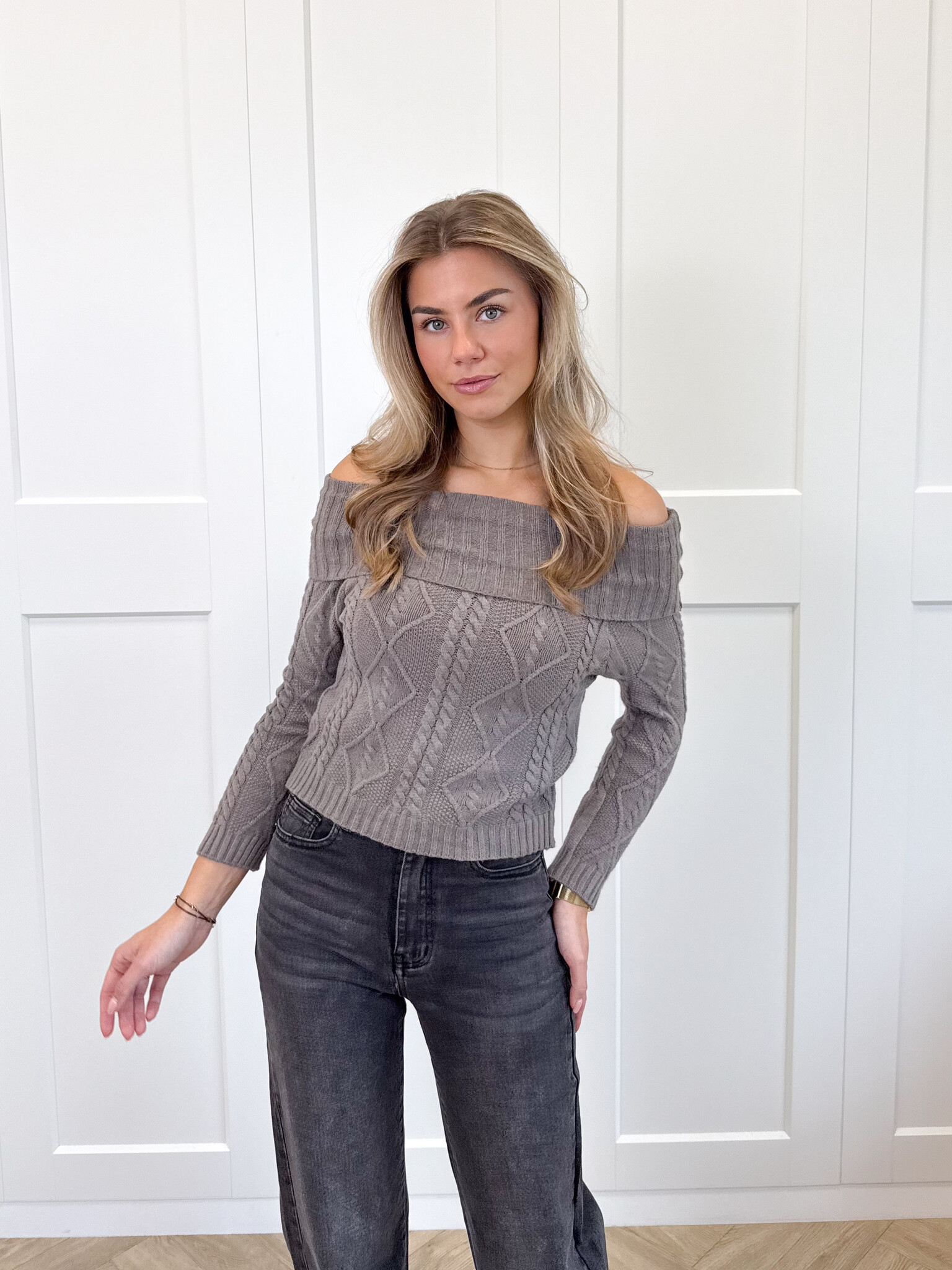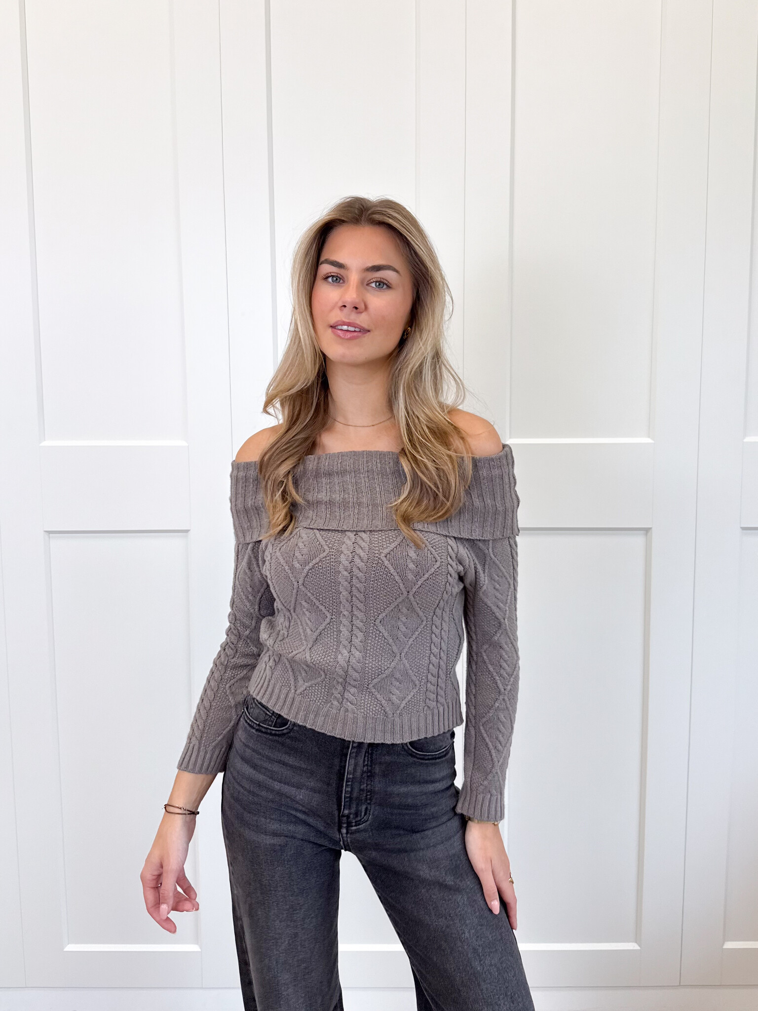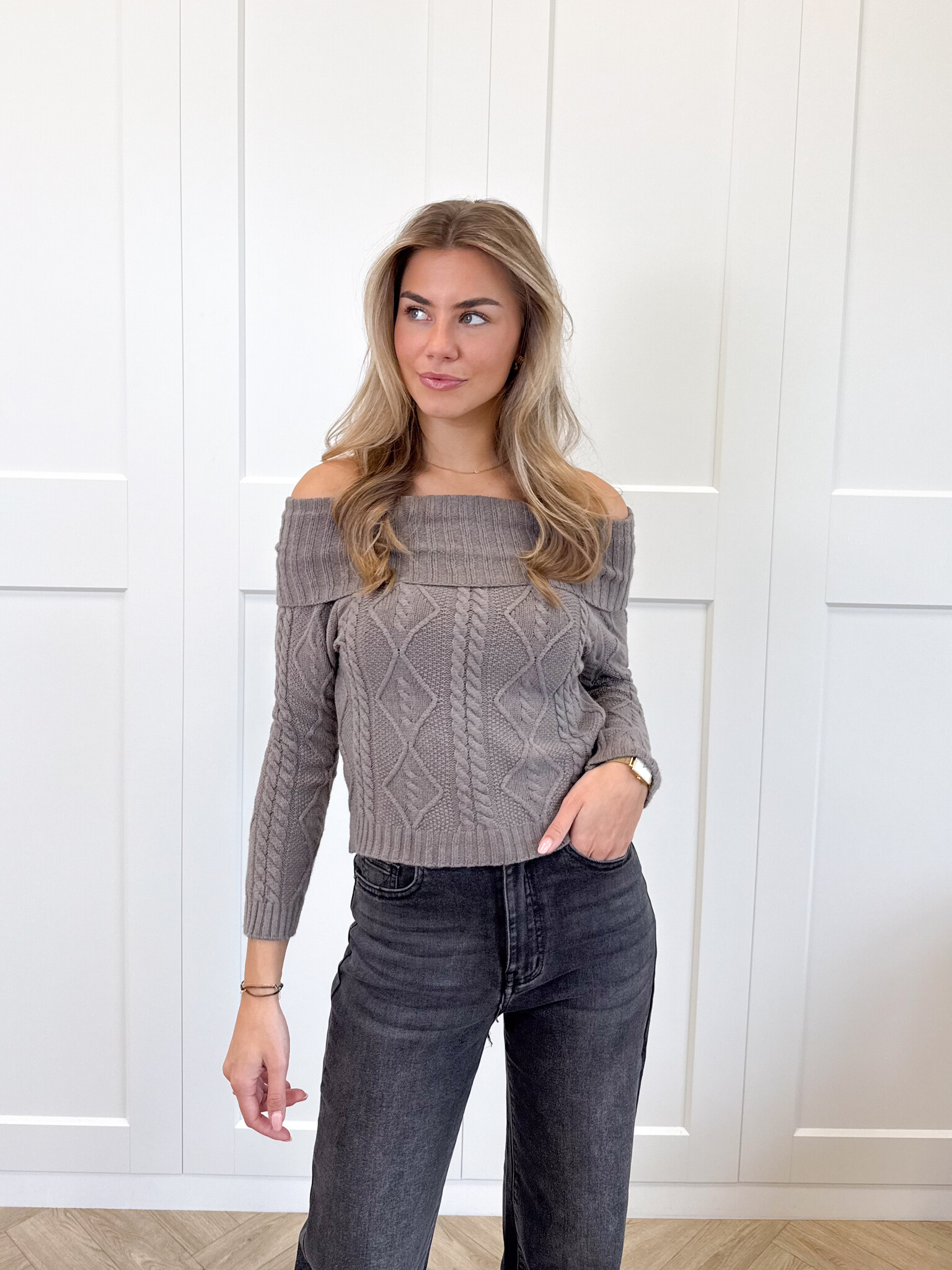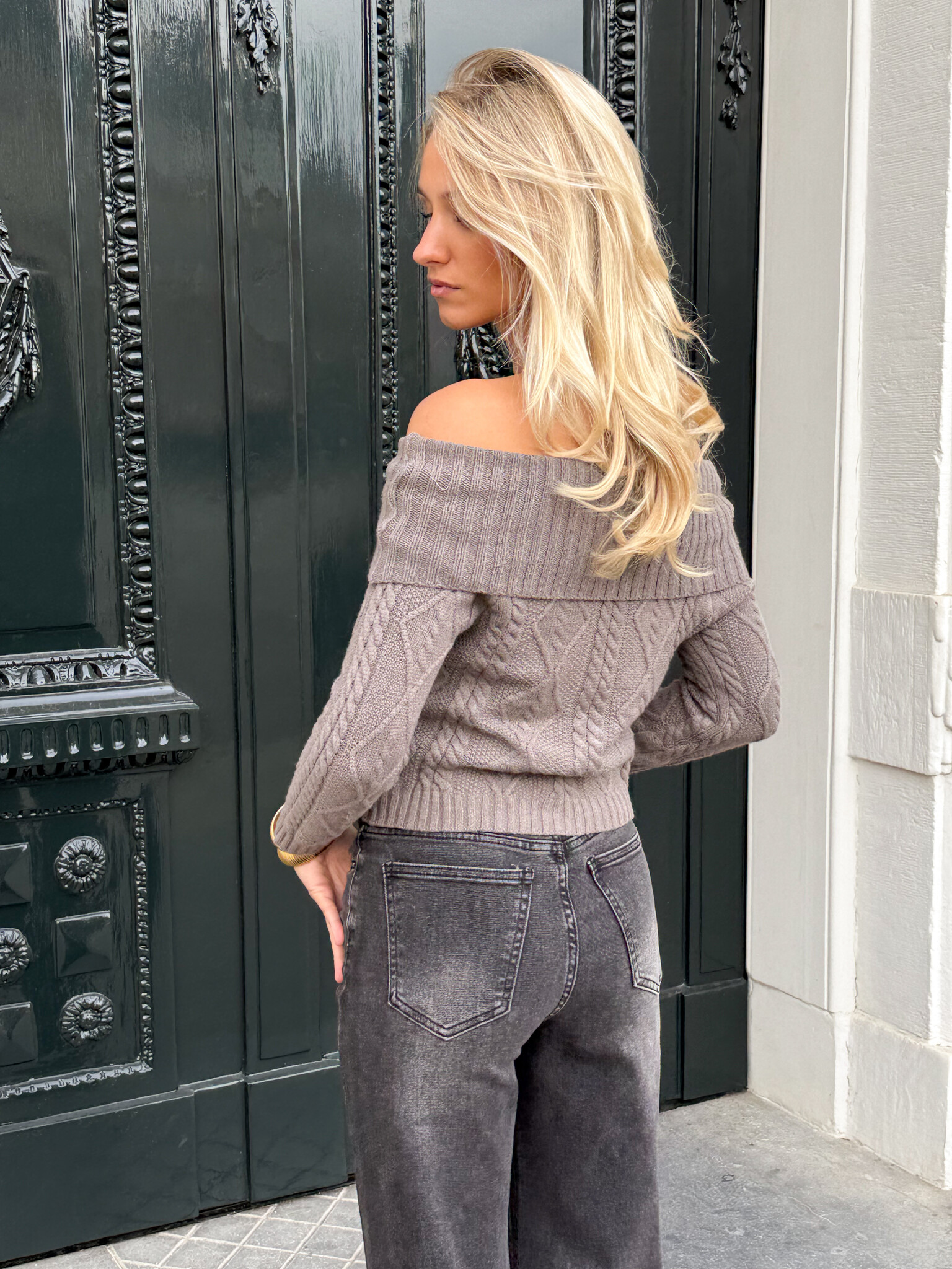 Deze zachte kabeltrui is de perfecte mix van vrouwelijk en cozy. De warme cafékleur straalt rust en stijl uit, terwijl de offshoulder pasvorm zorgt voor een speelse, flirty touch. De grove kabelstructuur geeft de trui een tijdloze, luxueuze uitstraling en maakt haar ideaal voor de koudere dagen. Dankzij de comfortabele pasvorm met lange mouwen voelt ze heerlijk zacht aan en kun je haar eindeloos combineren.