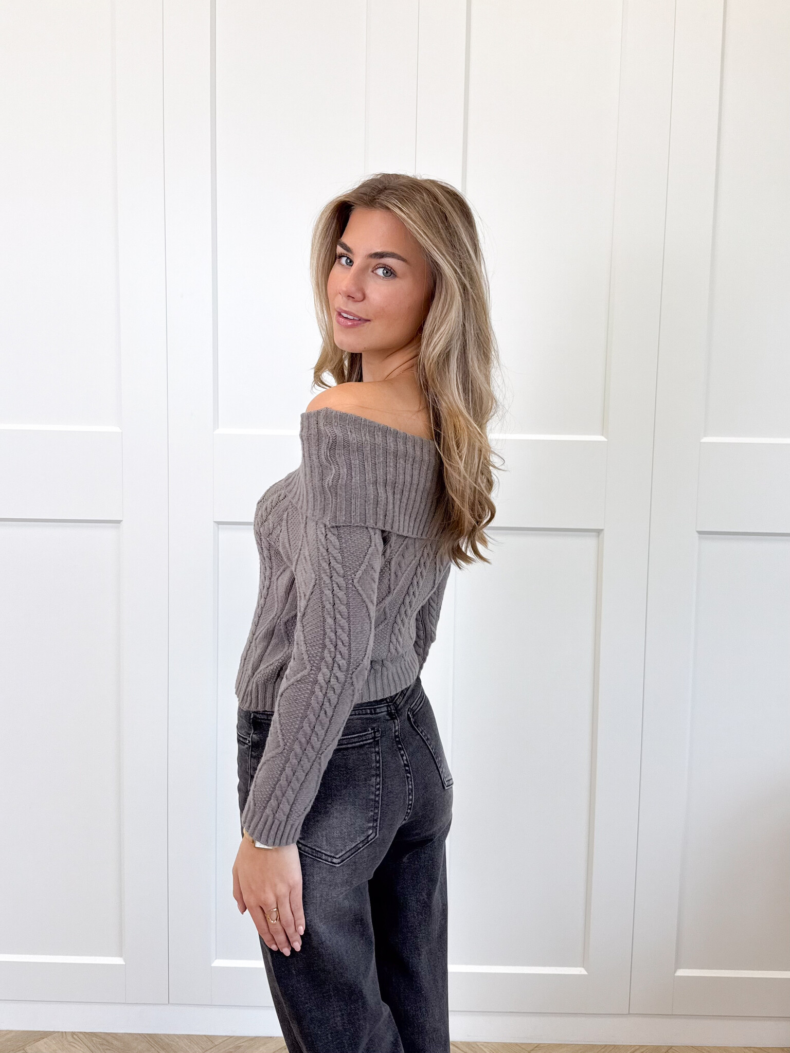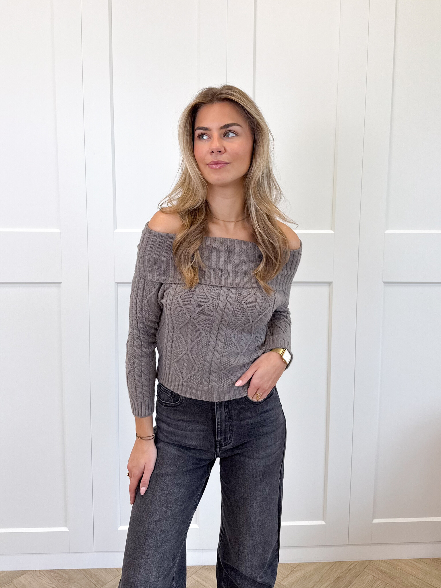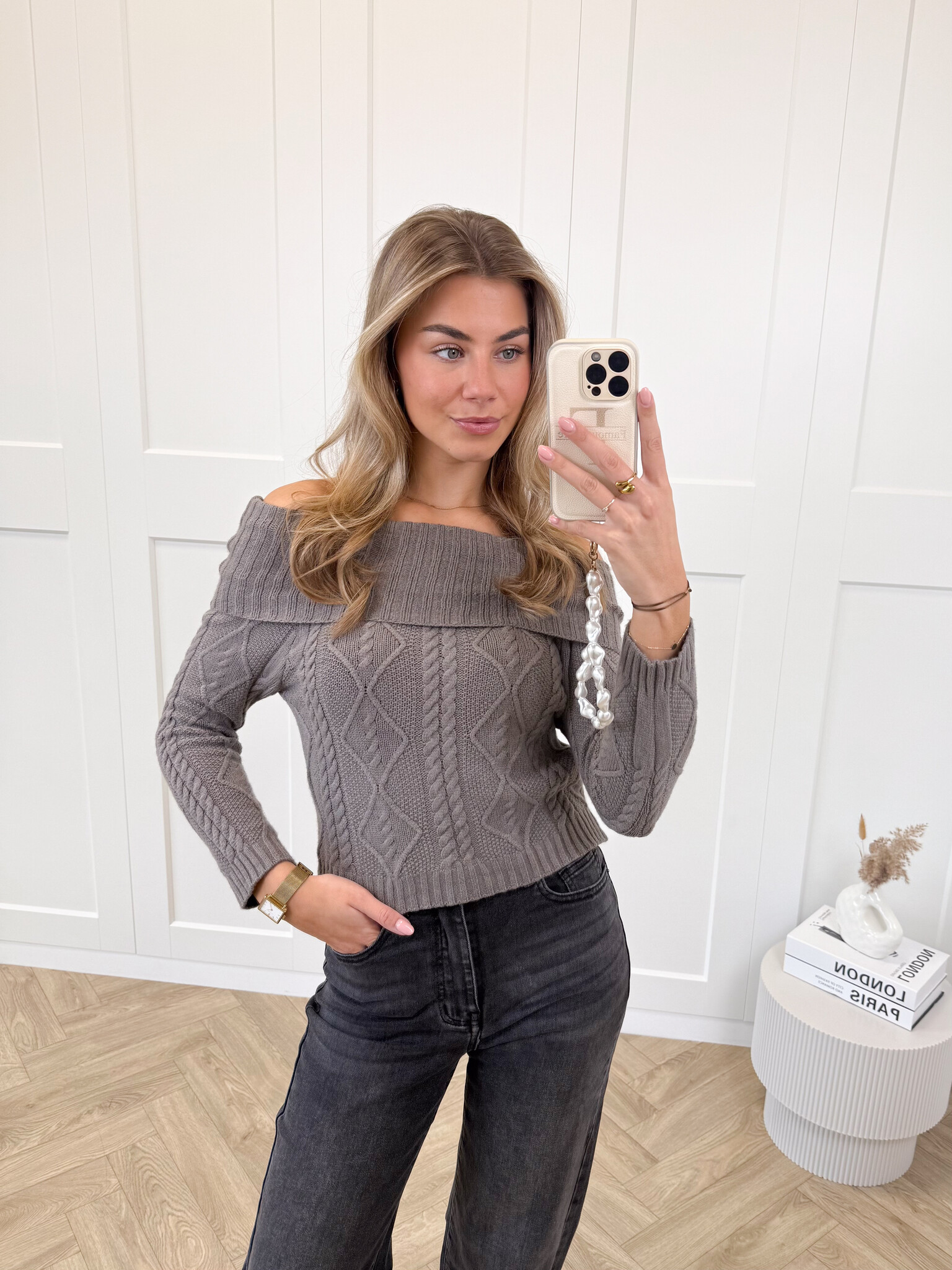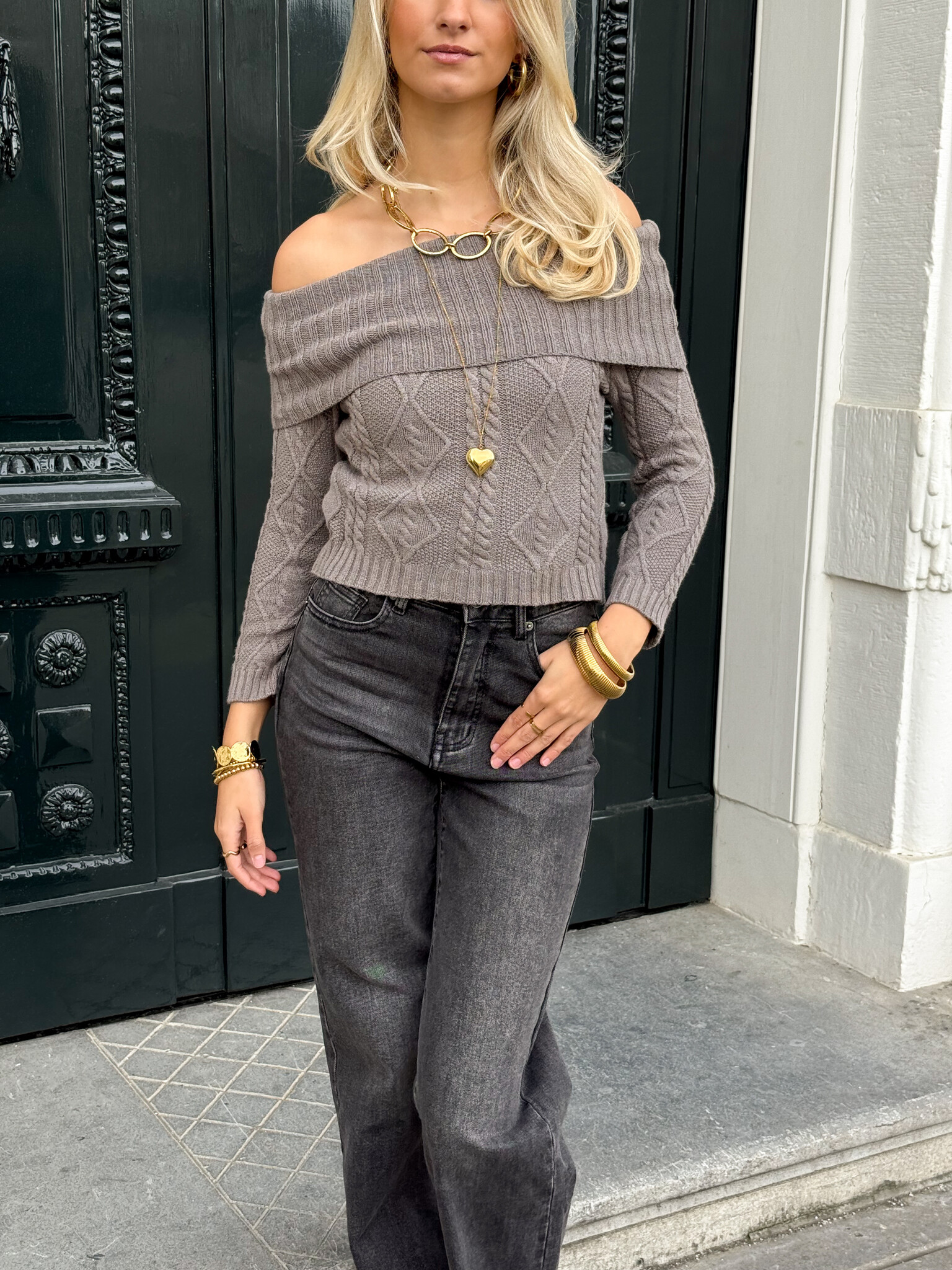 Deze zachte kabeltrui is de perfecte mix van vrouwelijk en cozy. De warme cafékleur straalt rust en stijl uit, terwijl de offshoulder pasvorm zorgt voor een speelse, flirty touch. De grove kabelstructuur geeft de trui een tijdloze, luxueuze uitstraling en maakt haar ideaal voor de koudere dagen. Dankzij de comfortabele pasvorm met lange mouwen voelt ze heerlijk zacht aan en kun je haar eindeloos combineren.